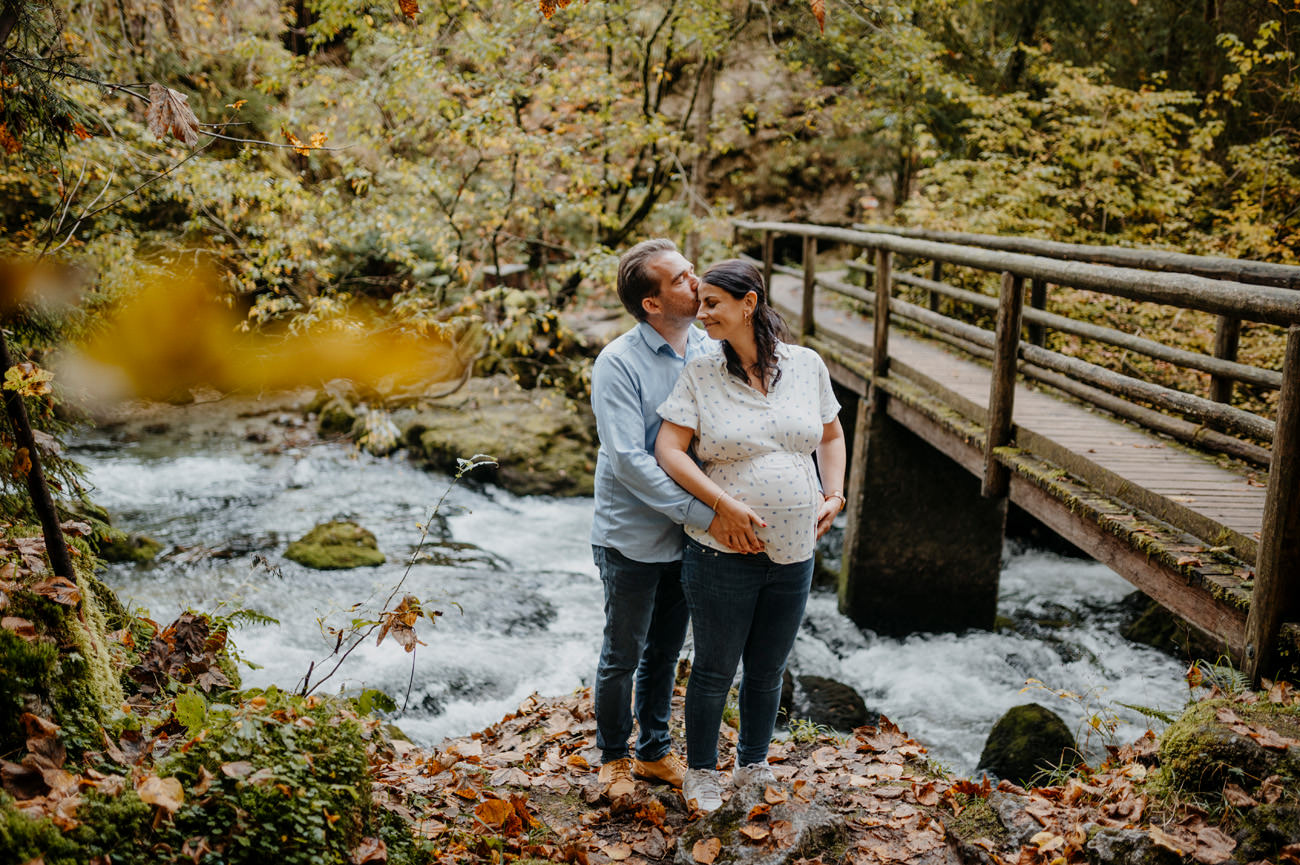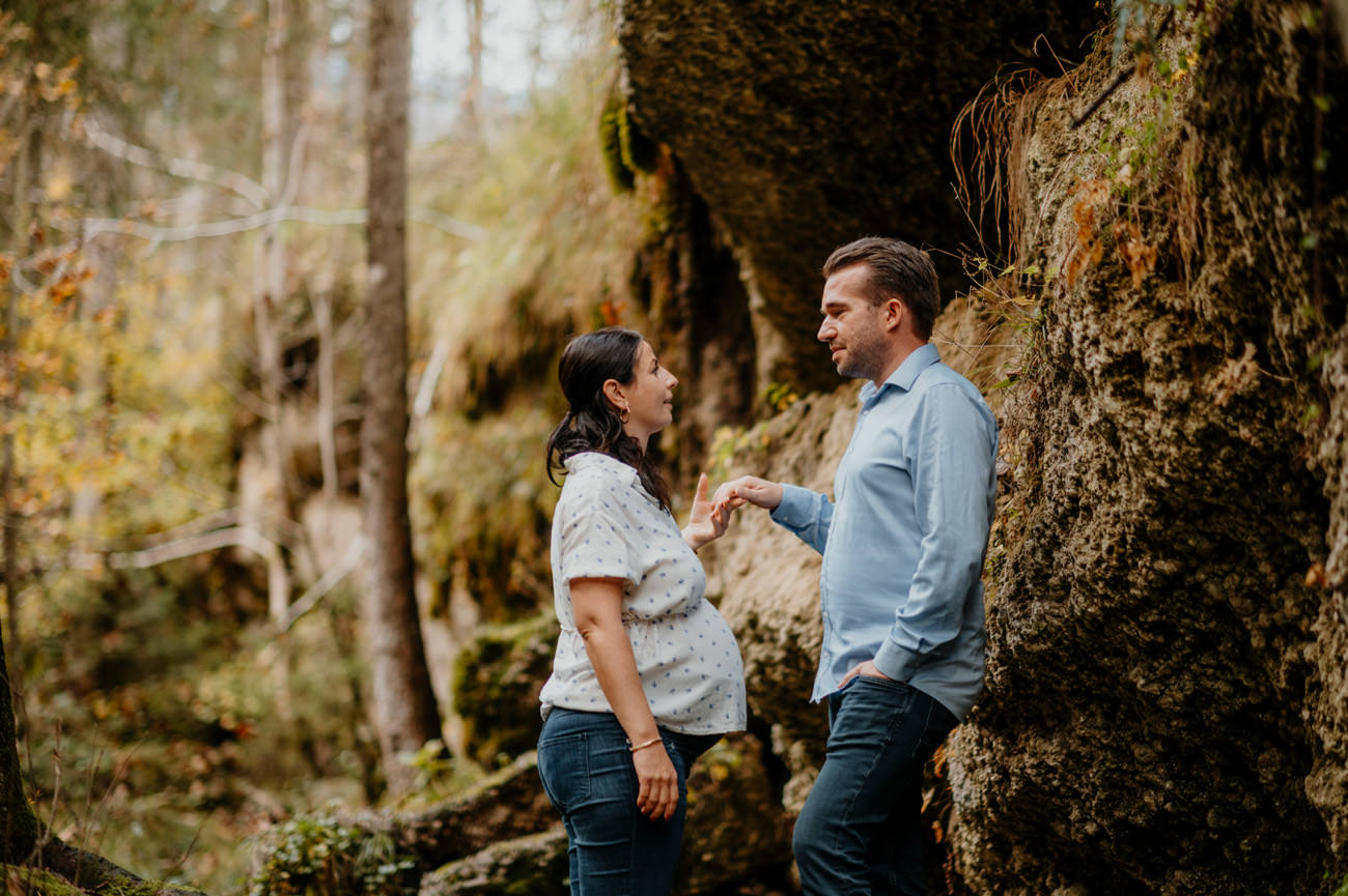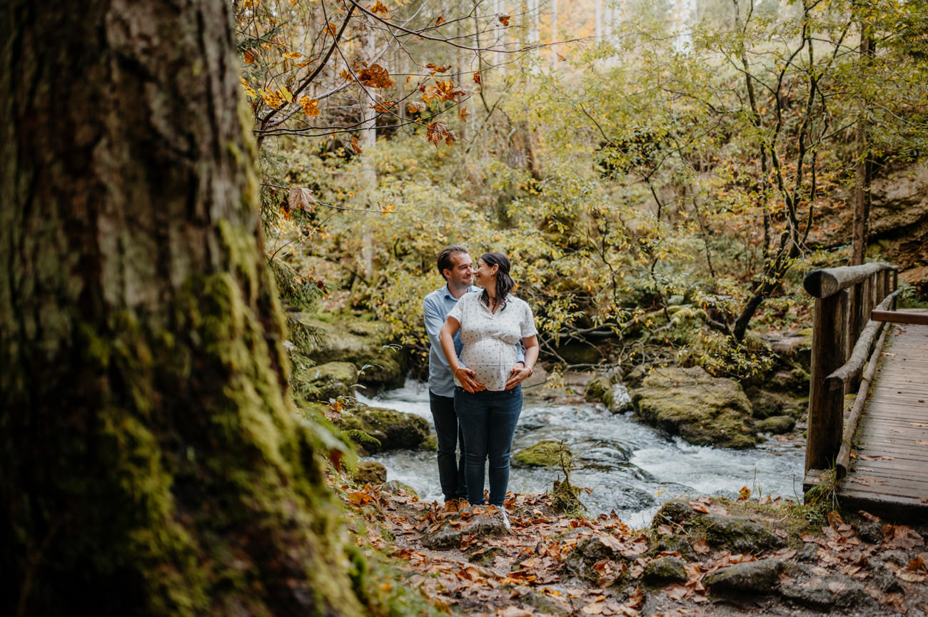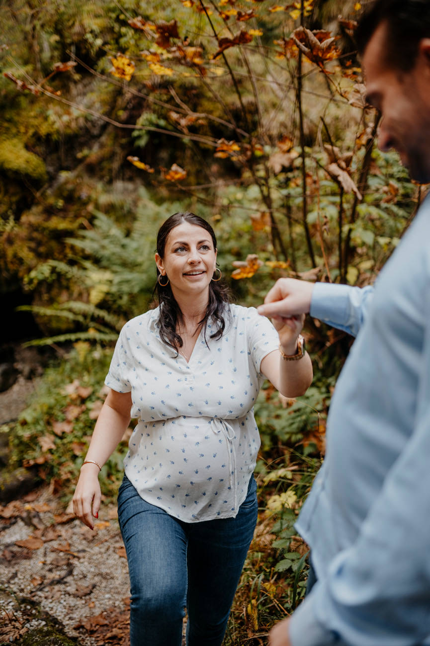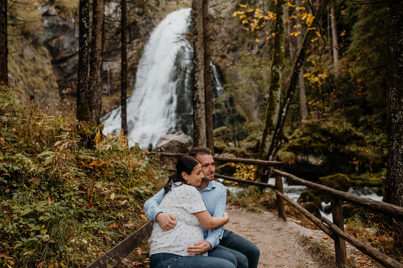 Das Shooting fand am Ende des Sommers statt, als die Sonne golden durch die Blätter der umliegenden Bäume schien. Die Natur nahm langsam ihre Herbstfarben an. Die Umgebung am Gollinger Wasserfall erwies sich als malerischer Hintergrund für das Babybauch-Shooting. Wobei die herbstlichen Nuancen eine warme und einladende Atmosphäre schufen.