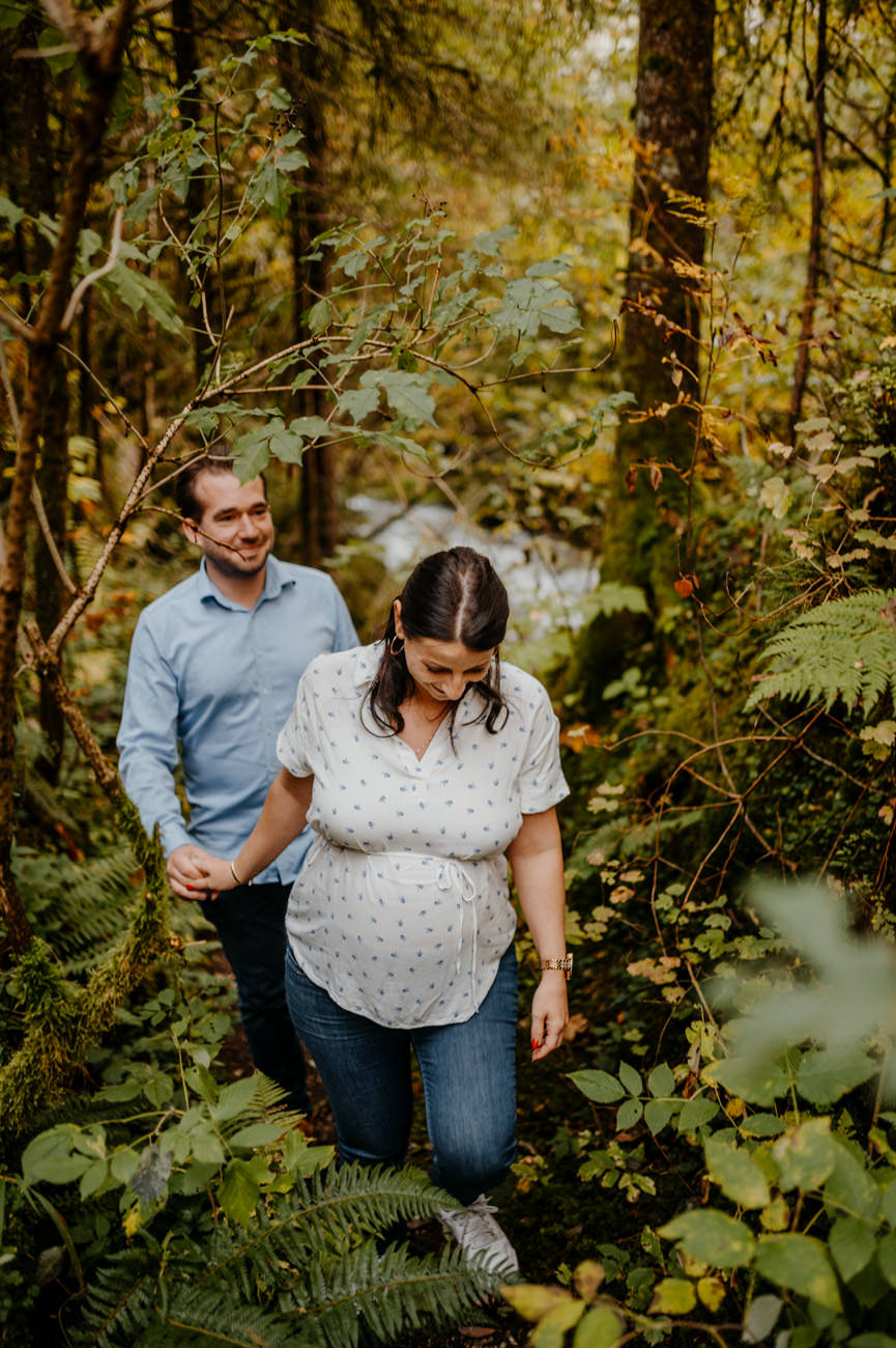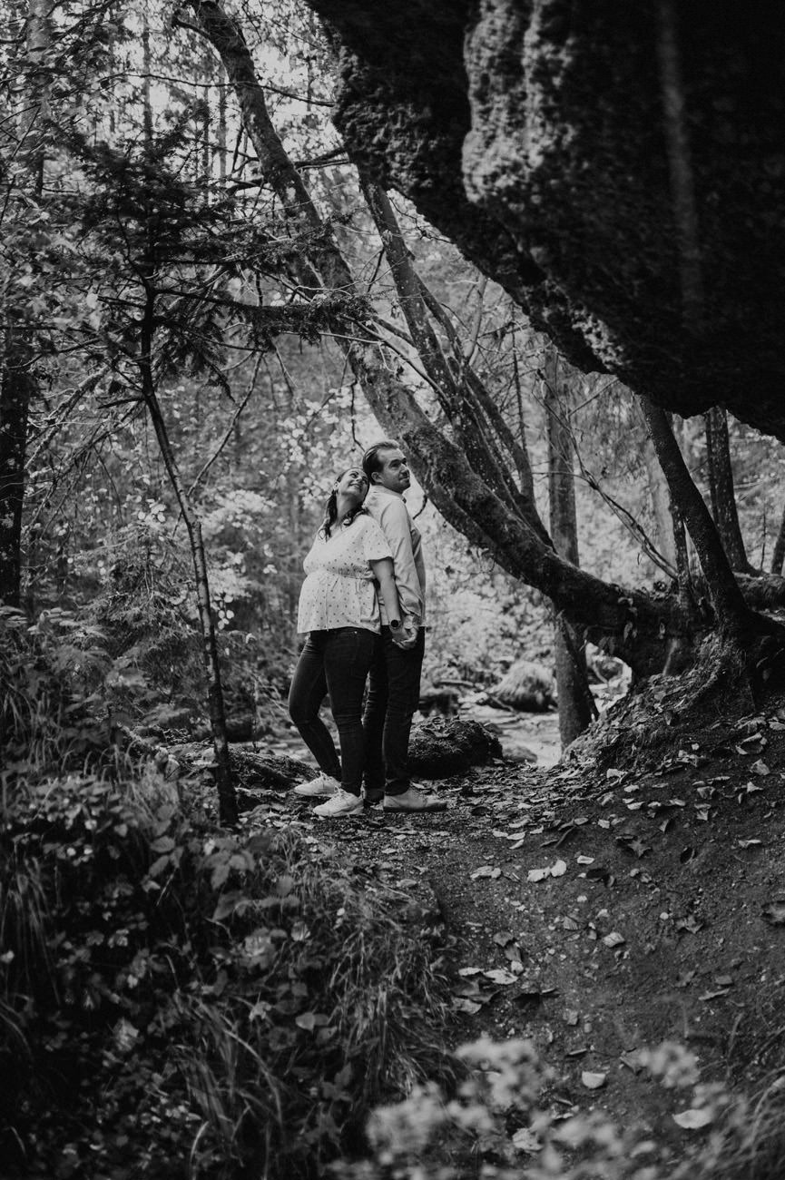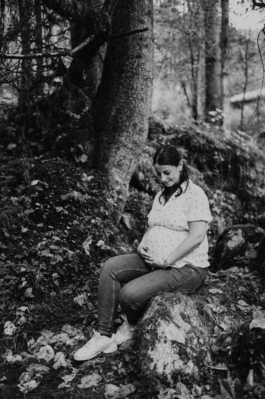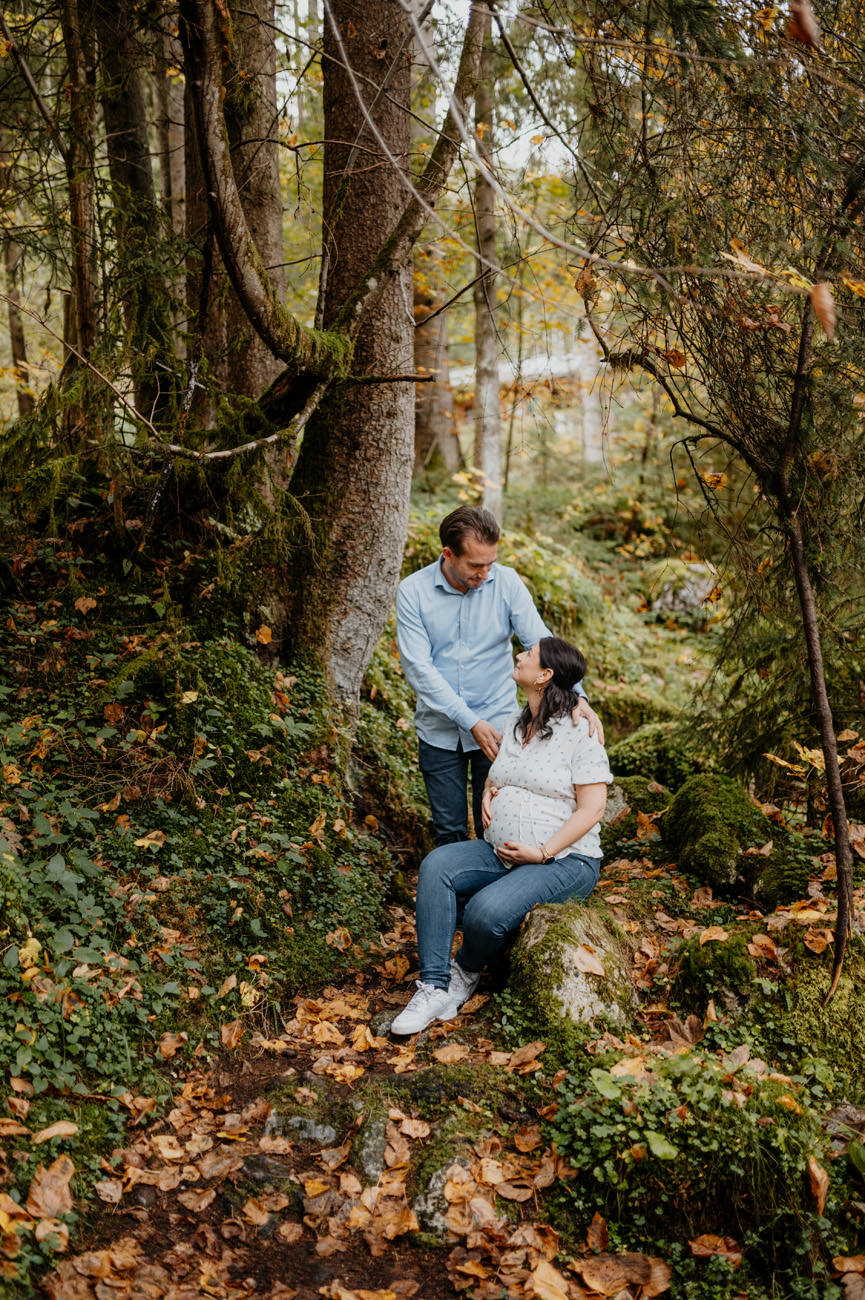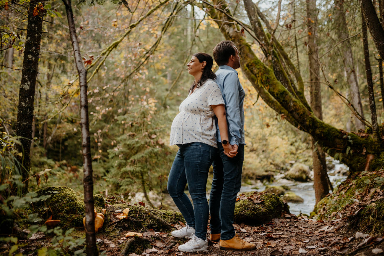Das Shooting fand am Ende des Sommers statt, als die Sonne golden durch die Blätter der umliegenden Bäume schien. Die Natur nahm langsam ihre Herbstfarben an. Die Umgebung am Gollinger Wasserfall erwies sich als malerischer Hintergrund für das Babybauch-Shooting. Wobei die herbstlichen Nuancen eine warme und einladende Atmosphäre schufen.