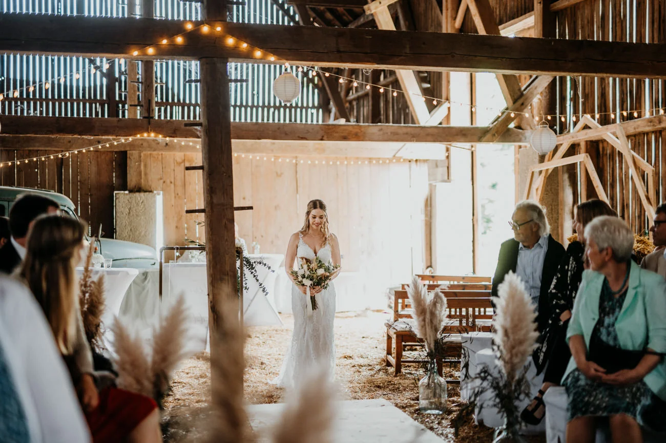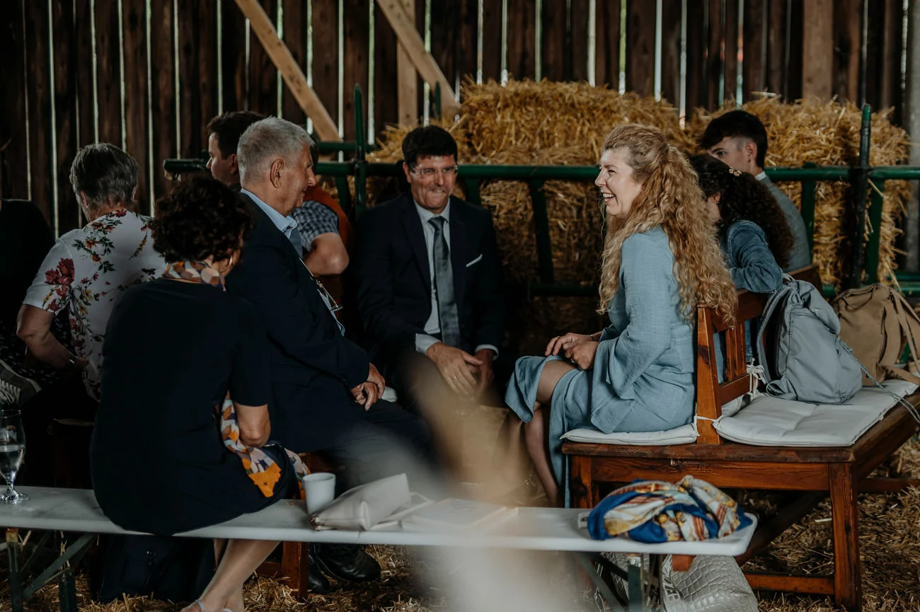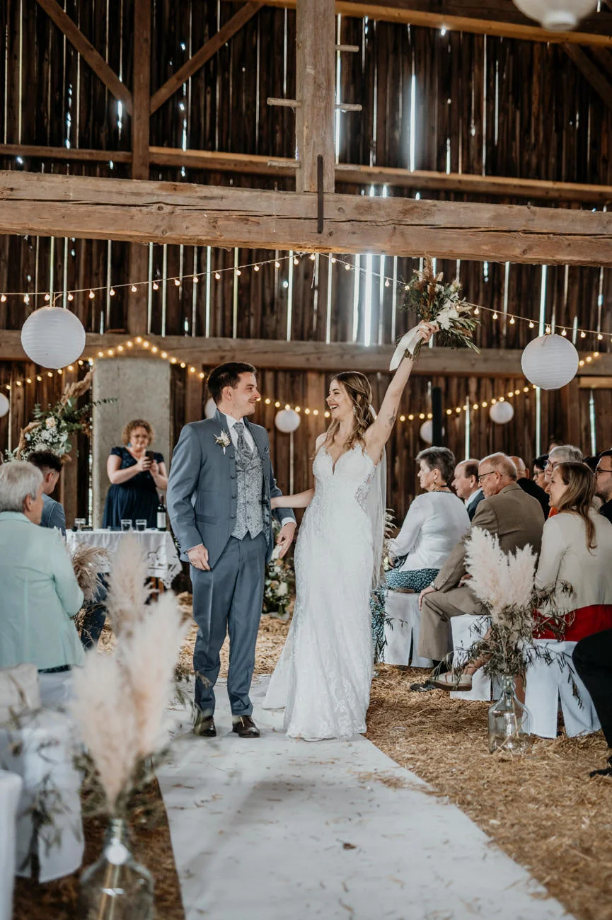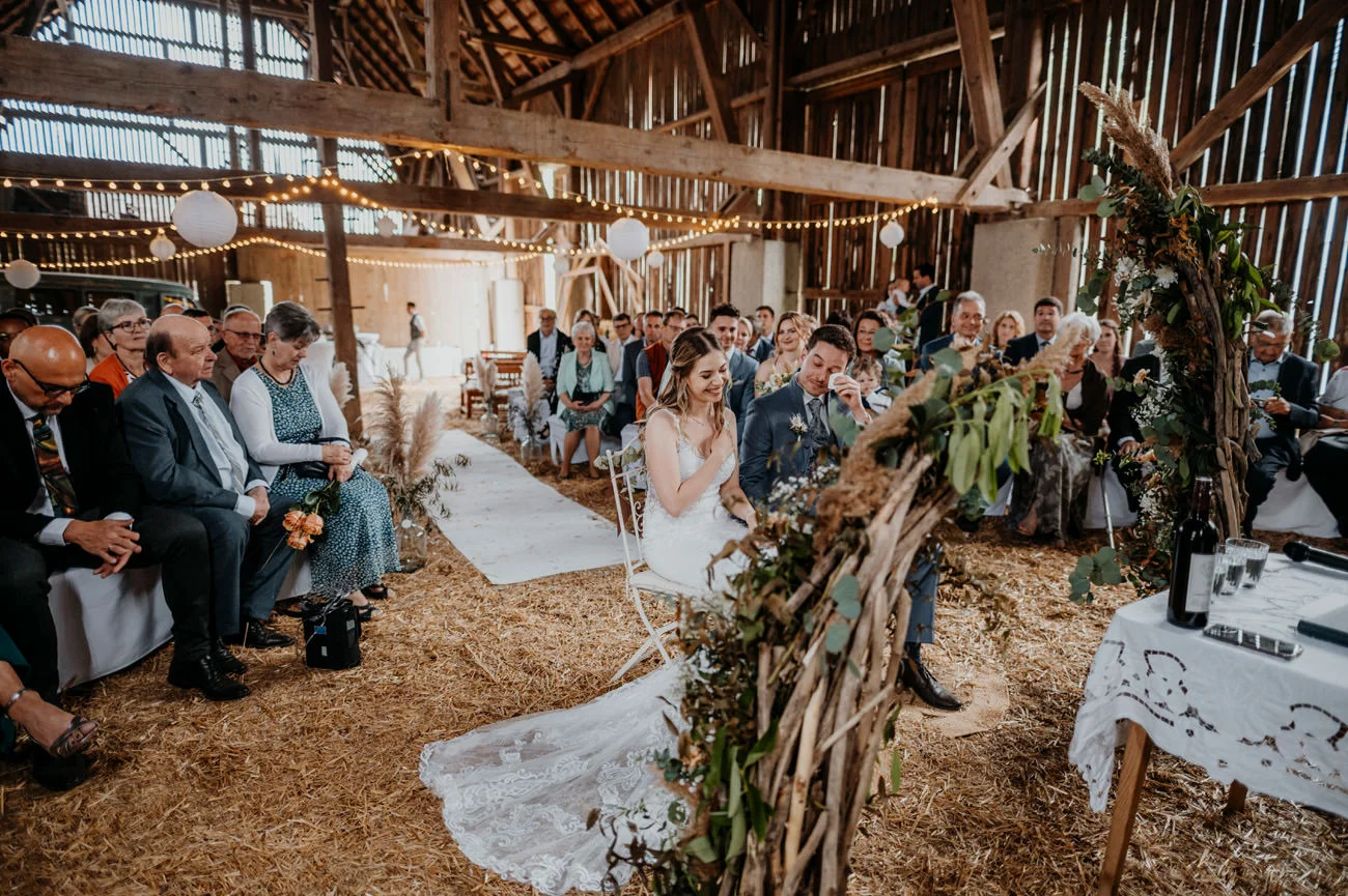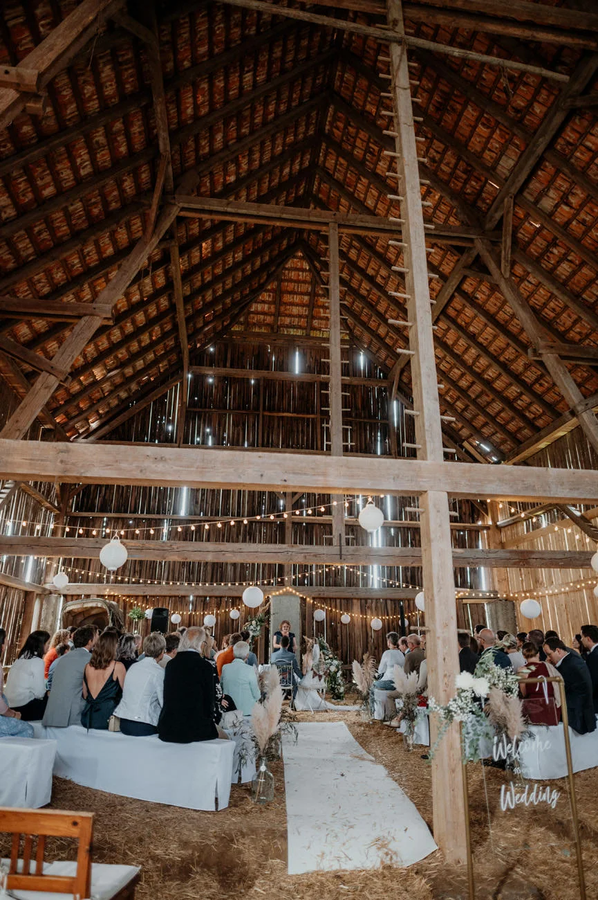 Die eigentliche Trauung fand in der rustikalen Scheune des Gutshofs statt, einem malerischen Ort, der die Atmosphäre mit einer Mischung aus Geschichte und Liebe durchdrang. Die Wände der Scheune trugen Zeugnis von vergangenen Geschichten, während Jasmin und Lukas hier ihre eigene, einzigartige Liebesgeschichte schrieben.