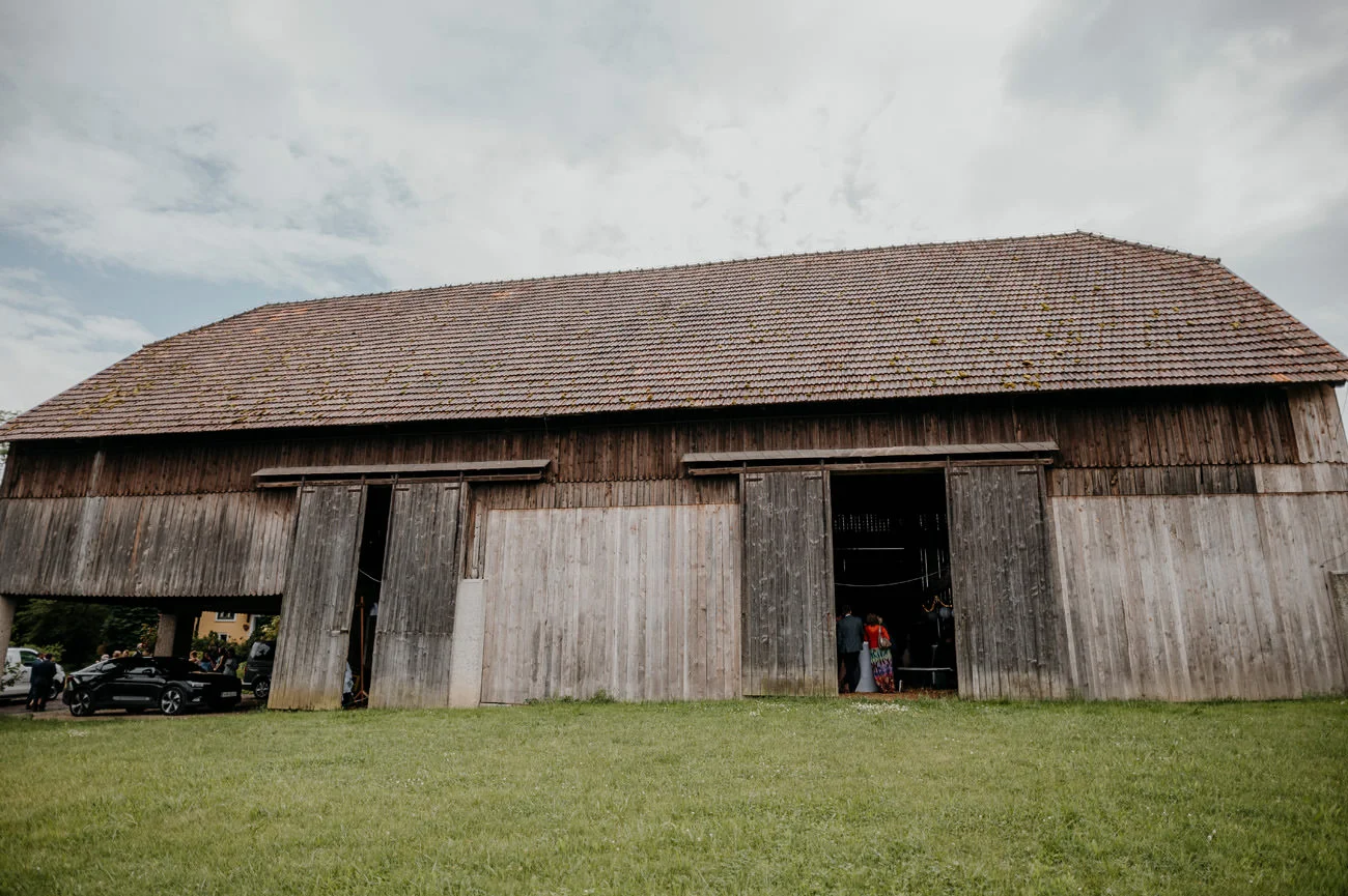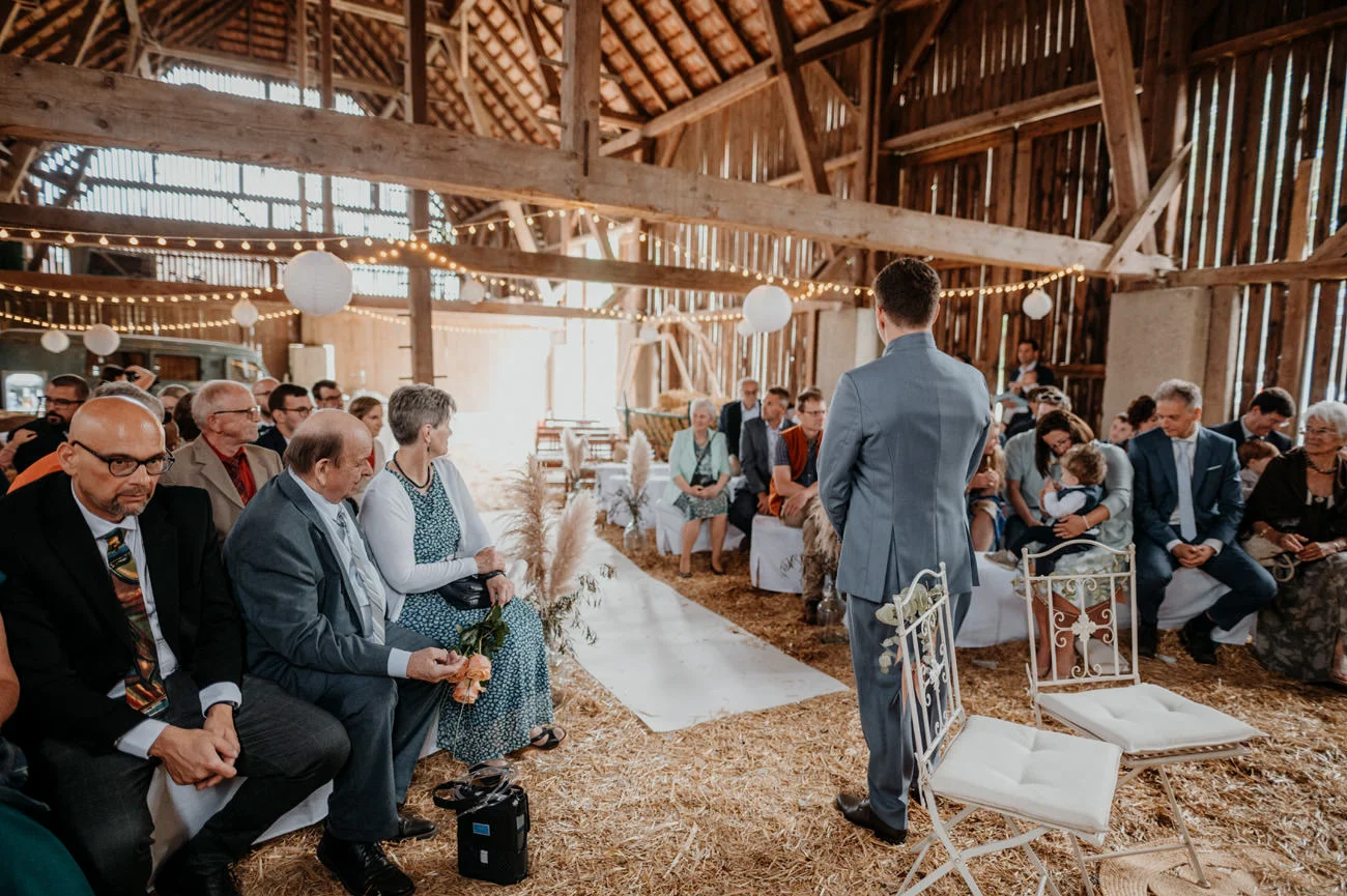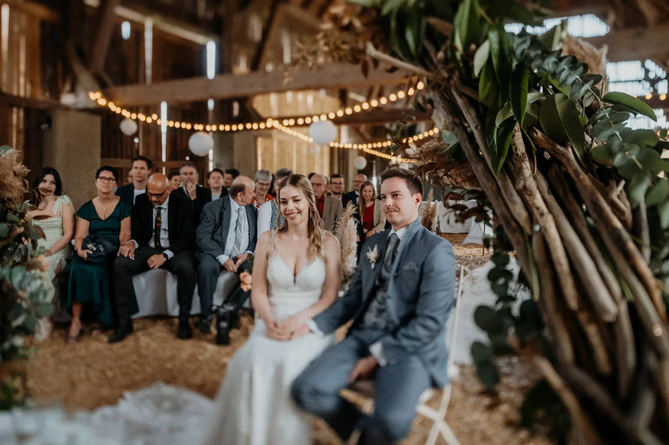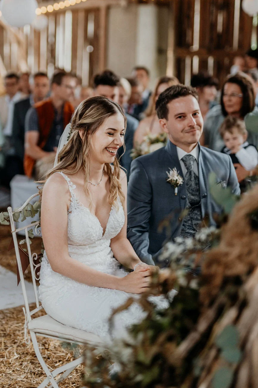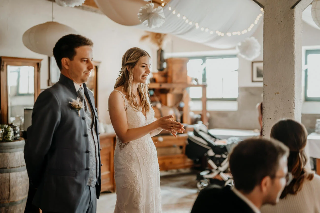 Die eigentliche Trauung fand in der rustikalen Scheune des Gutshofs statt, einem malerischen Ort, der die Atmosphäre mit einer Mischung aus Geschichte und Liebe durchdrang. Die Wände der Scheune trugen Zeugnis von vergangenen Geschichten, während Jasmin und Lukas hier ihre eigene, einzigartige Liebesgeschichte schrieben.