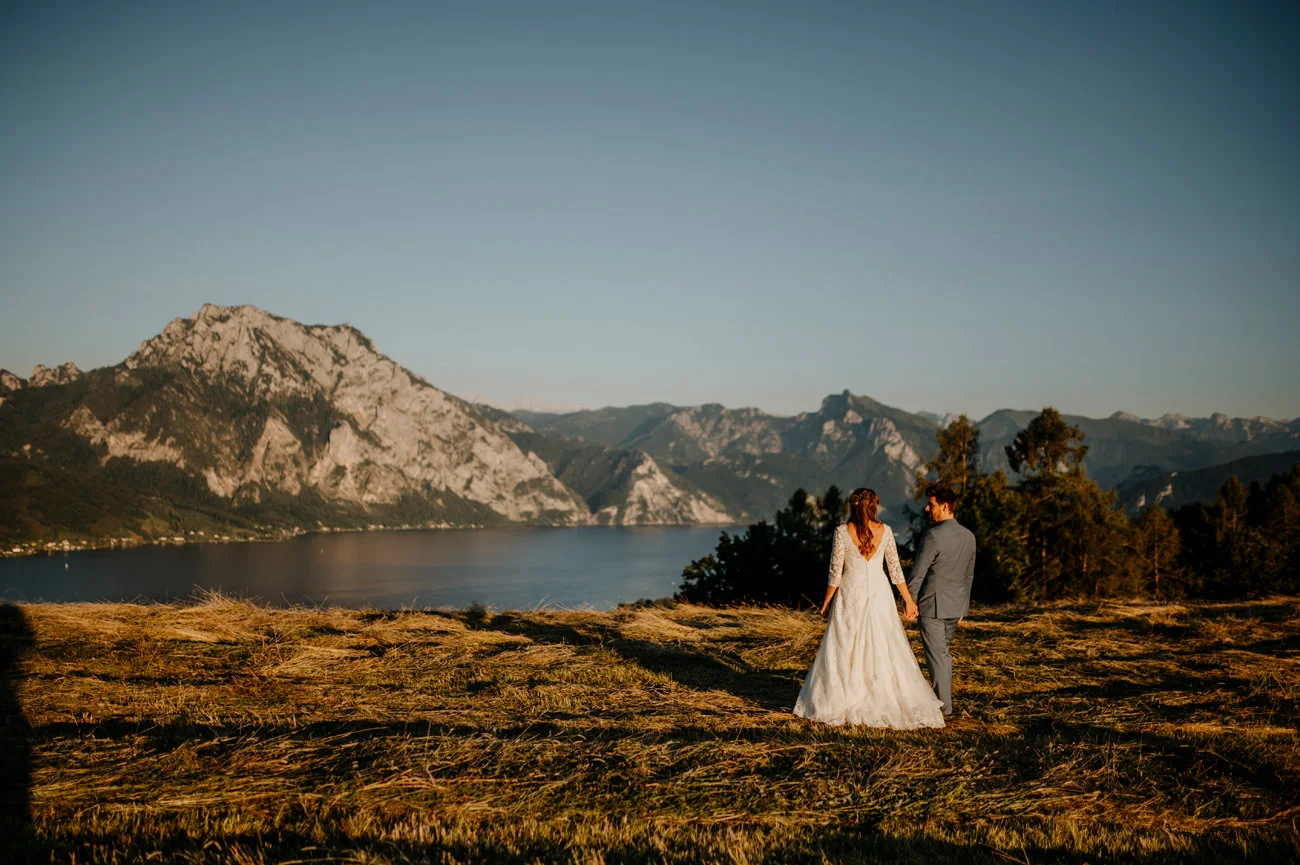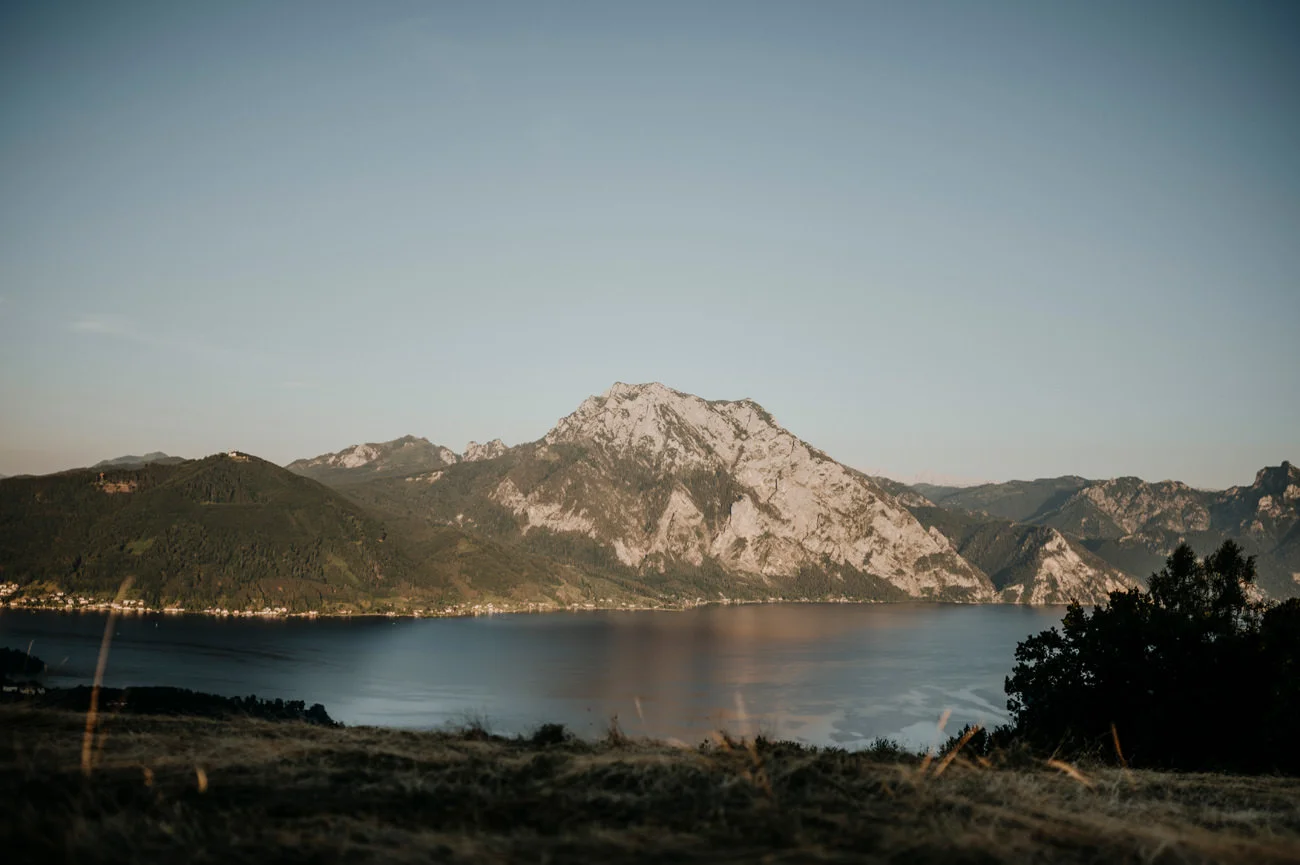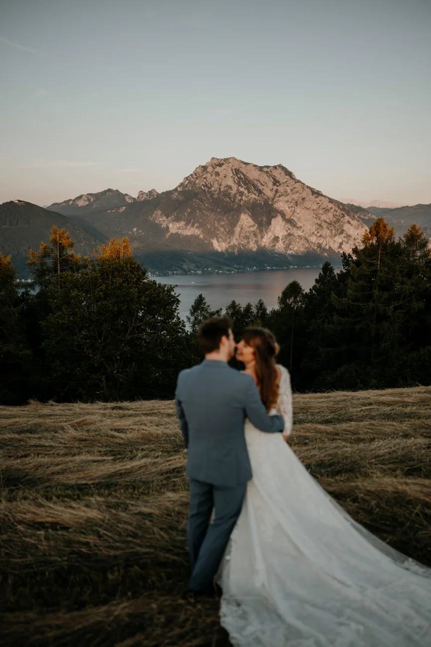 Nach der festlichen Hochzeitsfeier im Gmundnerberghaus begaben sich Trixi und Clemens auf den Gmundnerberg für ein Shooting unter freiem Himmel. Die Sonne tauchte den Traunstein in ein warmes Glühen und schuf eine magische Kulisse für die Aufnahmen, die ihre Liebe in jedem Bild einfingen.