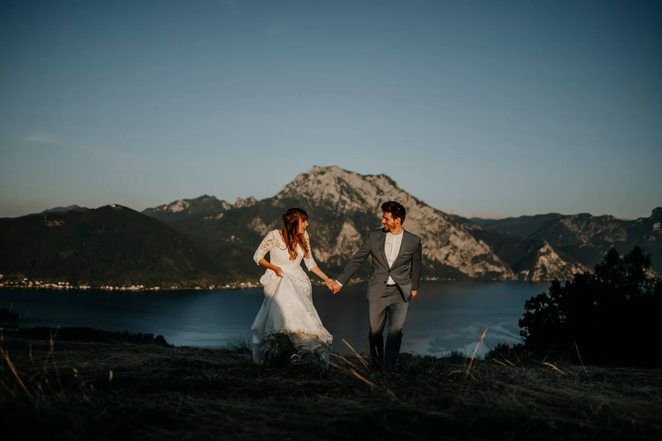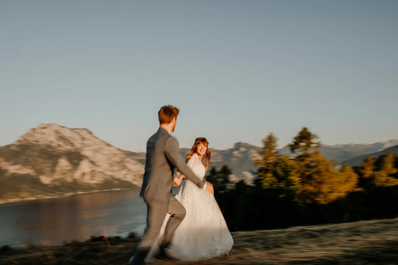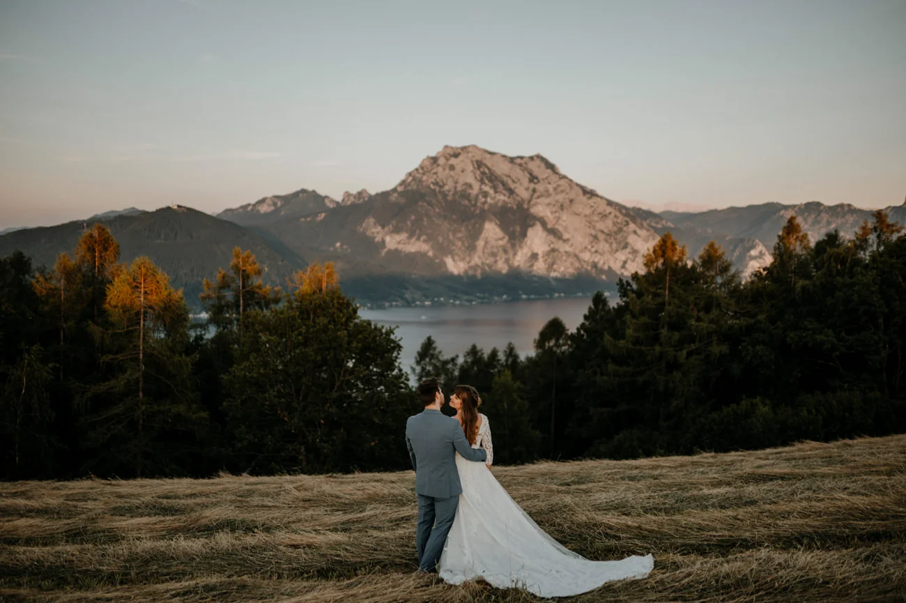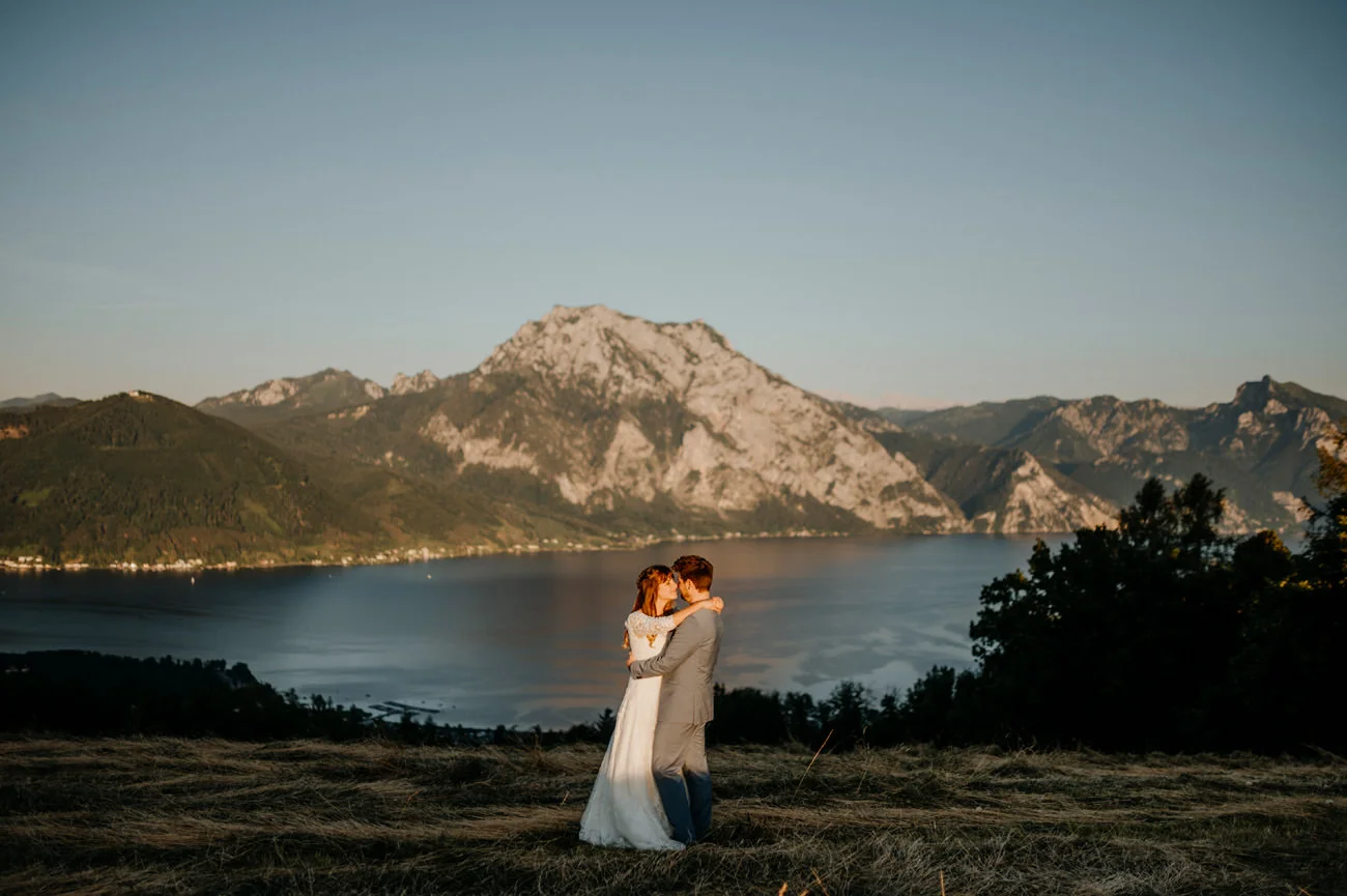 Die Entscheidung, den Gmundnerberg als Kulisse für ihr Shooting zu wählen, verlieh ihren Hochzeitsfotos eine unverwechselbare Natürlichkeit und Schönheit. Das Bergpanorama, eingefangen in jedem Bild, spiegelt die Erhabenheit ihrer Liebe wider.