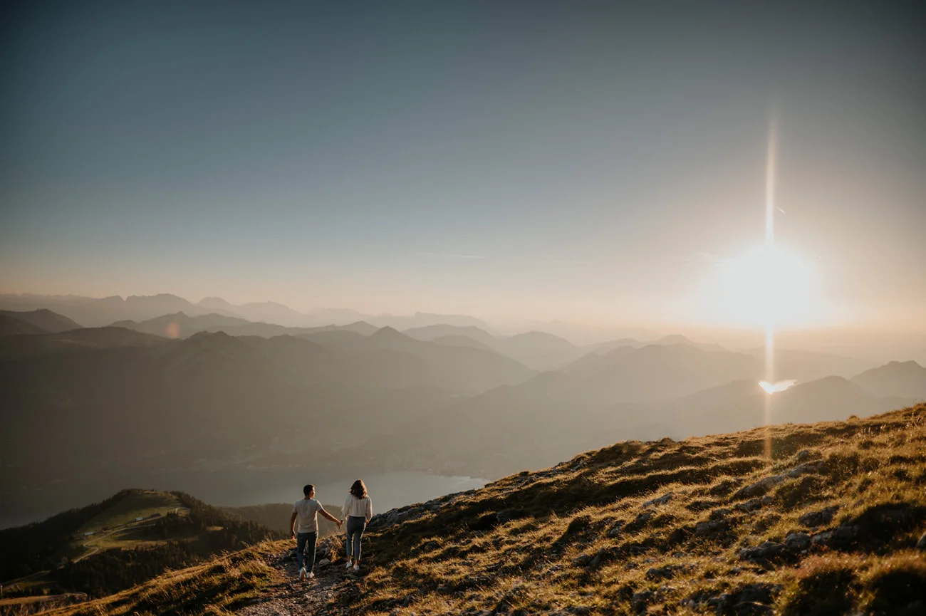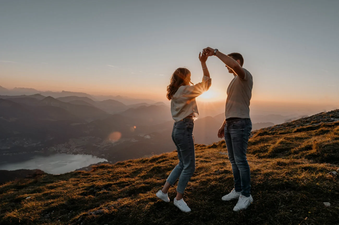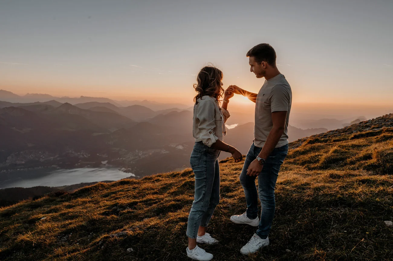 - Natürliche Beleuchtung: Das natürliche Licht in höheren Lagen kann besonders vorteilhaft für Fotos sein. Sanftes Sonnenlicht, spektakuläre Sonnenauf- und -untergänge tragen zur Schönheit der Aufnahmen bei. Romantische Schafberg Verlobungsfotos Wolfgangsee.
