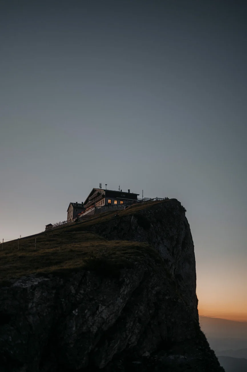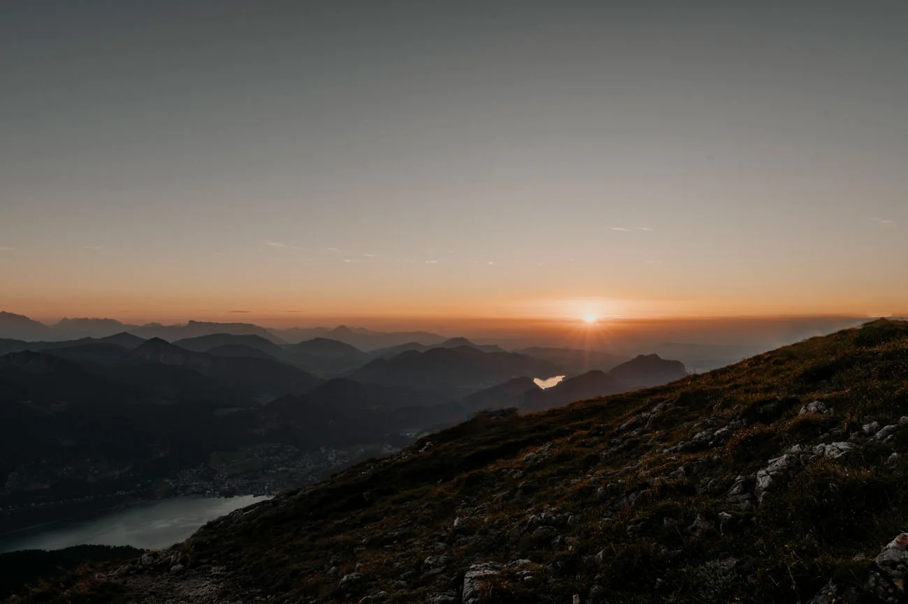 An der Spitze des Schafbergs angekommen, warteten wir gespannt auf den Sonnenuntergang. Die untergehende Sonne tauchte die Szenerie in warme Farben und zauberte ein beeindruckendes Lichtspiel über den Wolfgangsee. Das Bergpanorama über den Wolken bot eine Kulisse, die nicht nur romantisch, sondern auch atemberaubend war.
