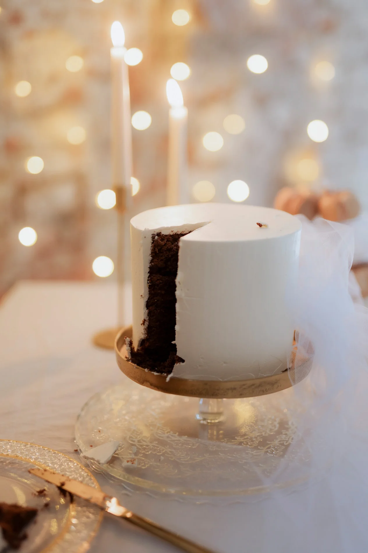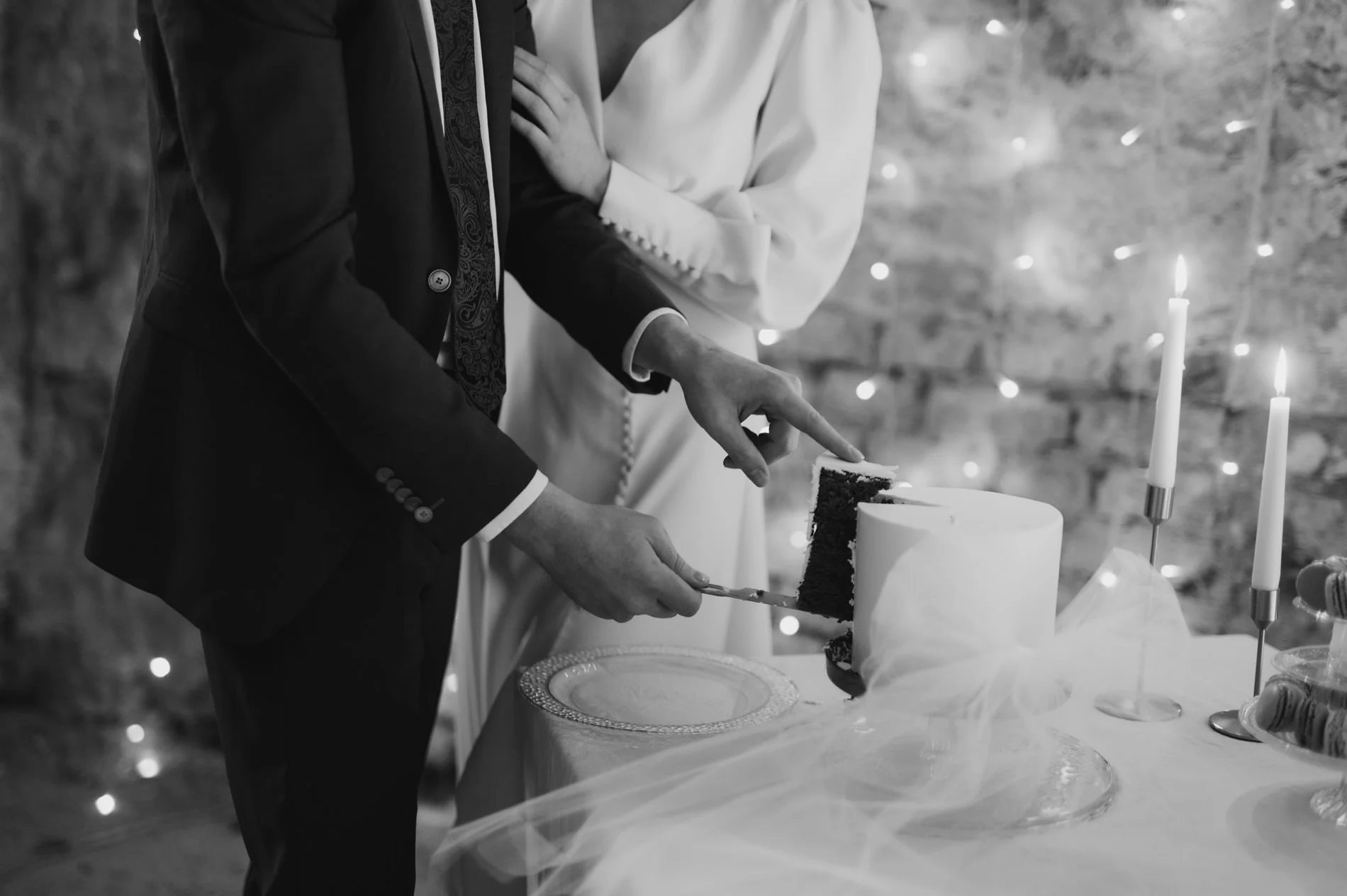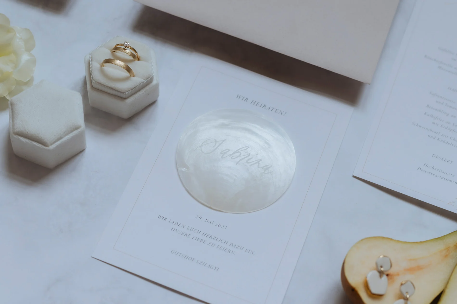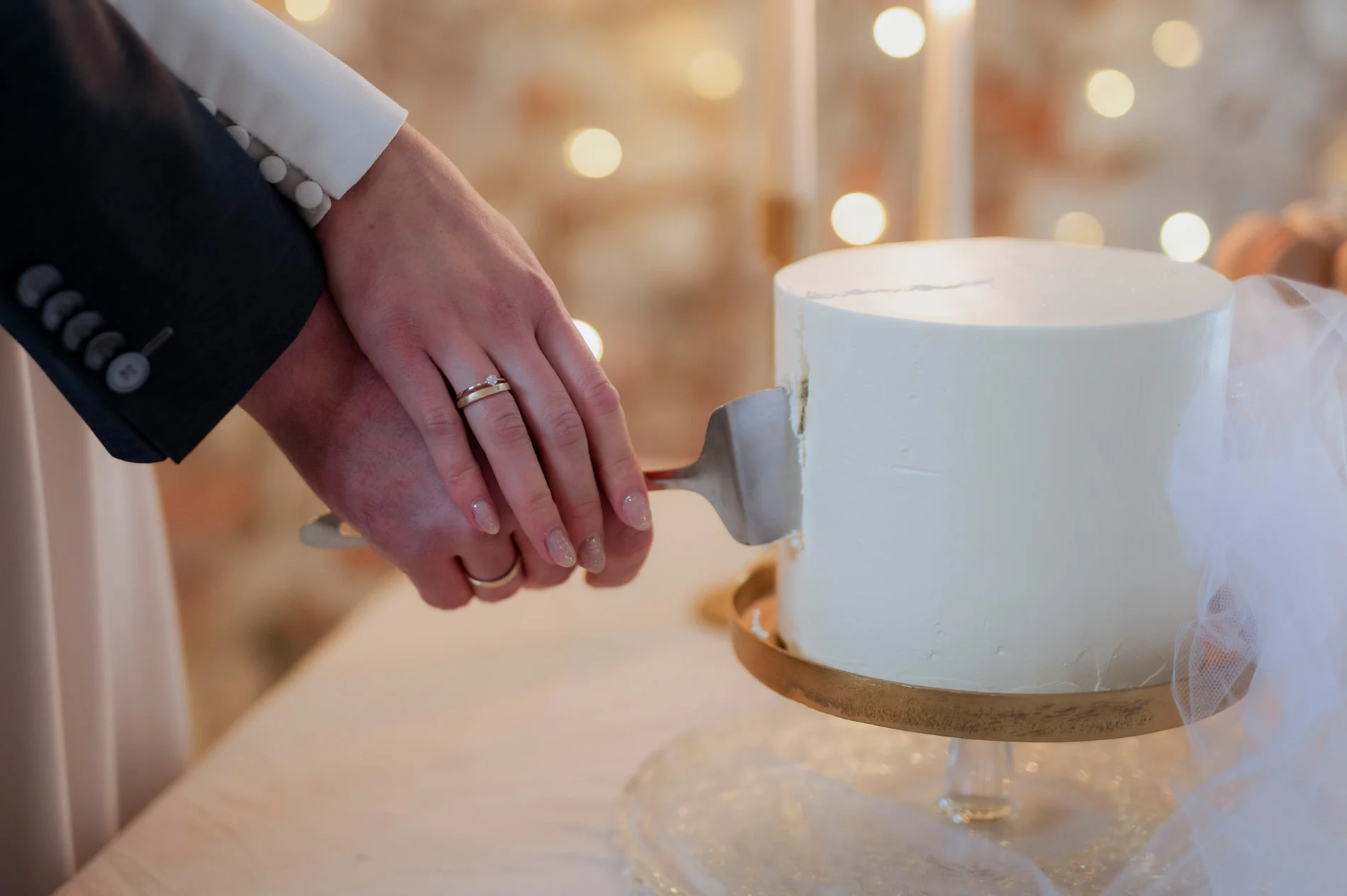 Ein besonderes Highlight war die zeitlose Torte von Das Herzstück. In edlem Weiß gehalten und ebenso minimalistisch wie geschmackvoll verziert, war sie ein optisches und kulinarisches Highlight des Abends. Auch die wunderschön angeordneten Details des Festsaals trugen zu dieser besonderen Atmosphäre bei und luden die Gäste dazu ein, in eine romantische Welt einzutauchen.