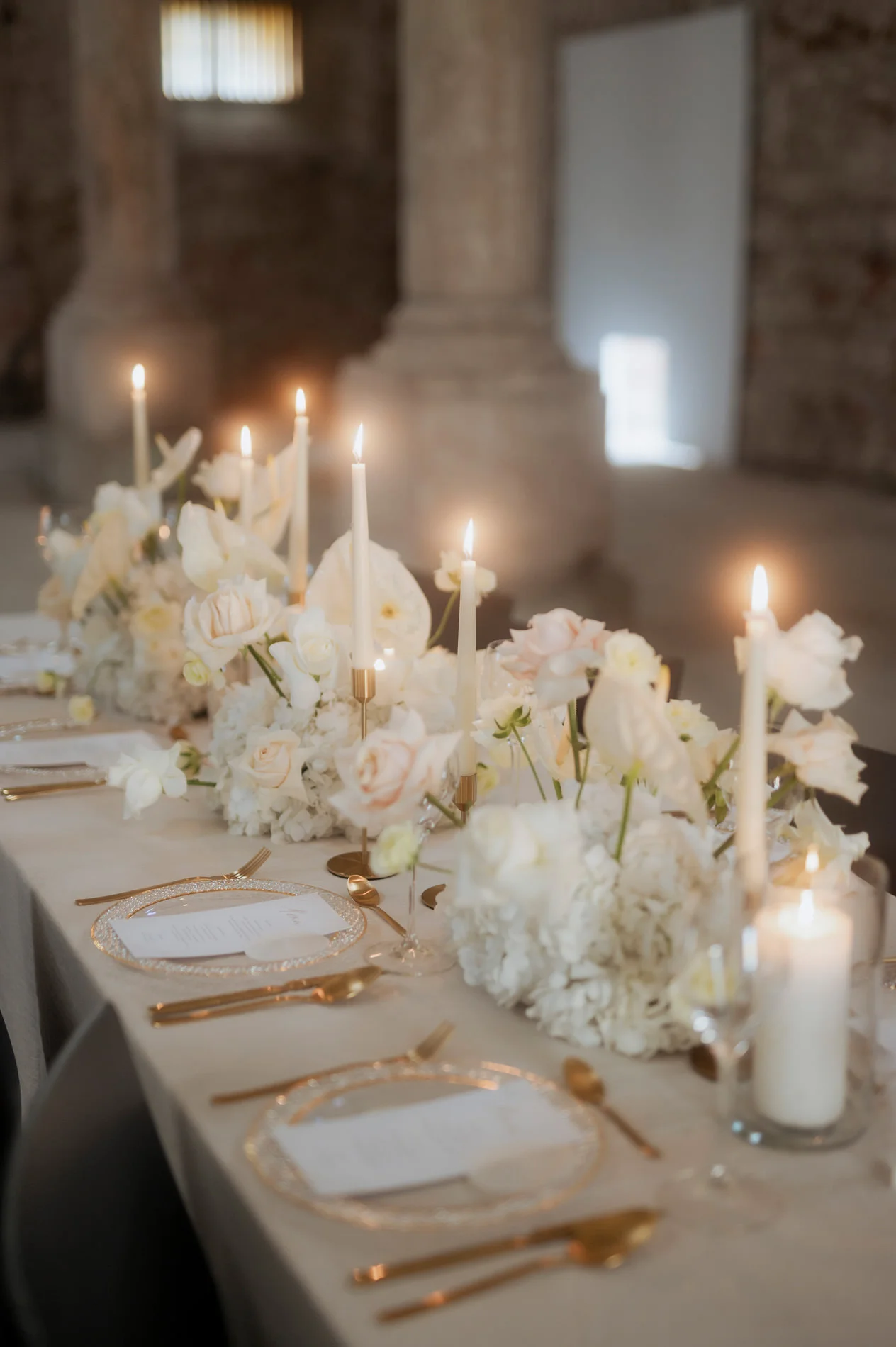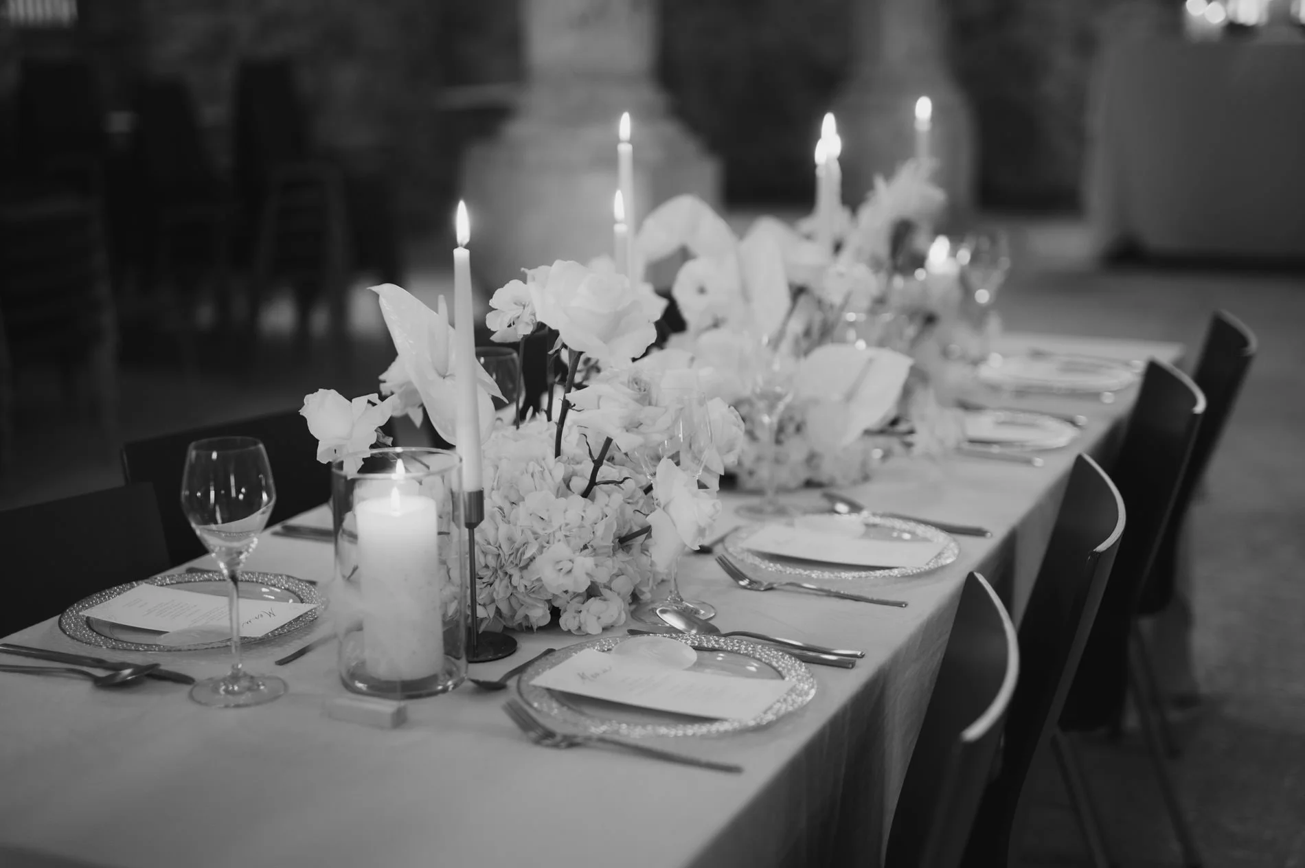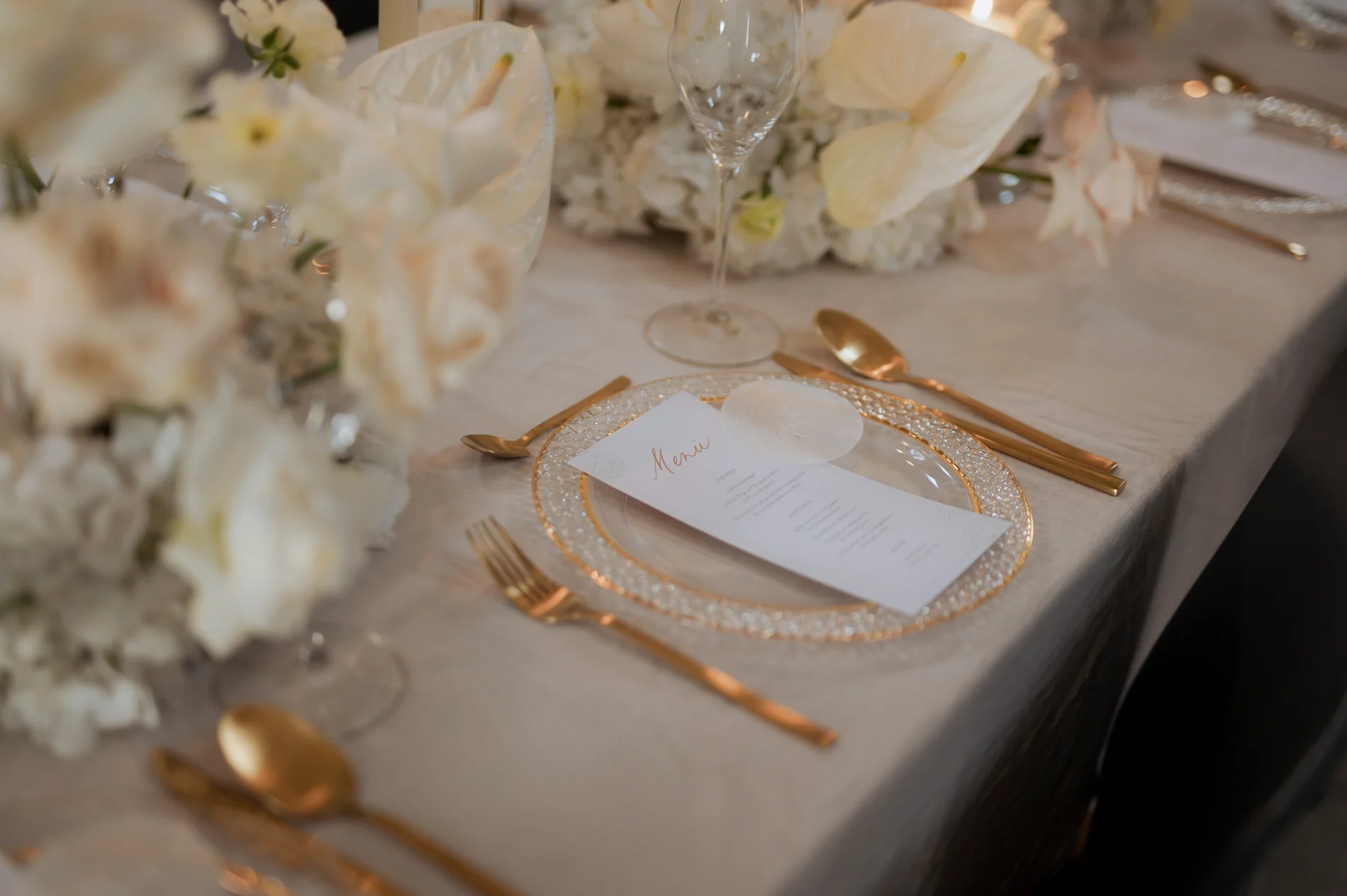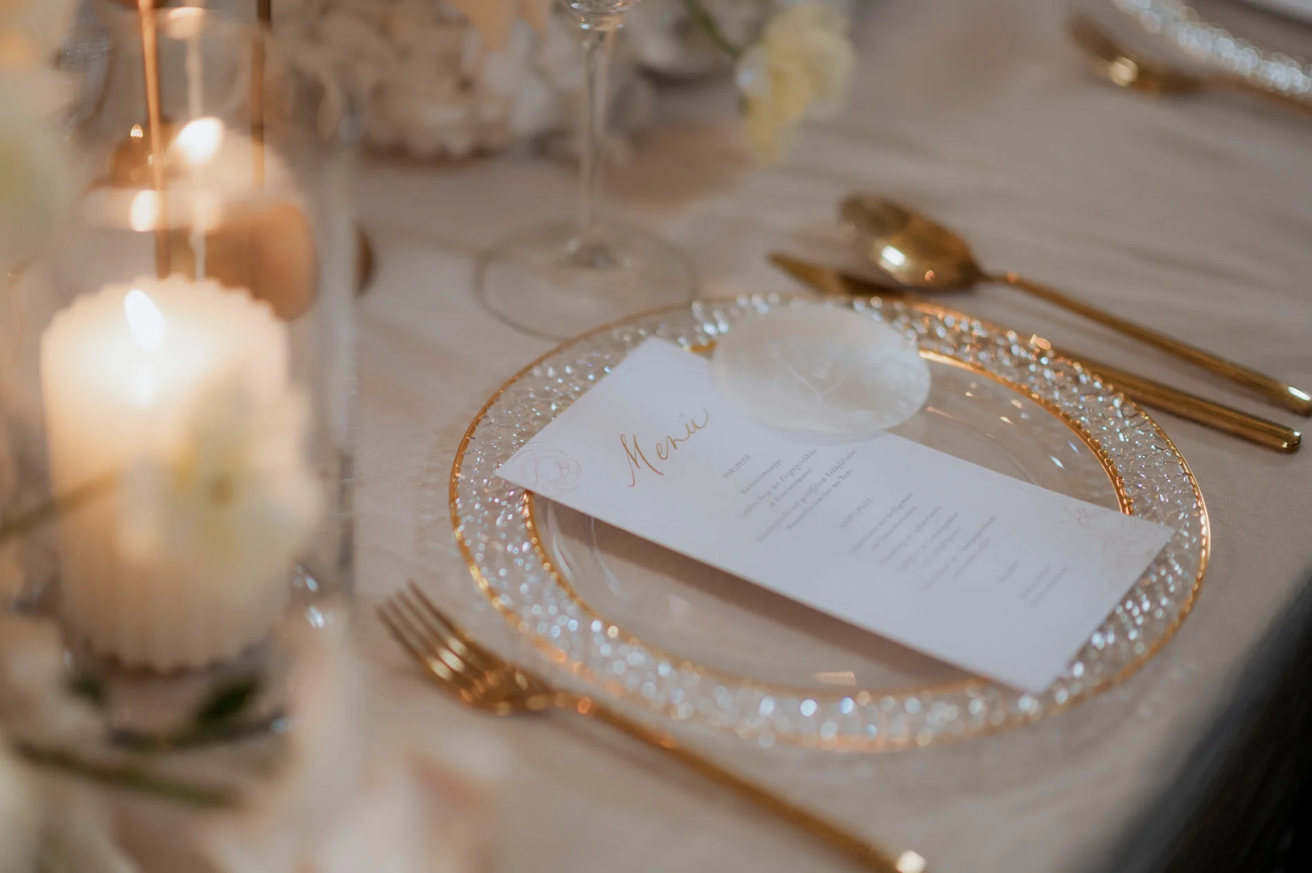 Die floralen Arrangements von Dreams Atelier passten wunderbar zur edlen Schlossatmosphäre. Sie sorgten mit zartem Blush, Weiß und Creme für eine geschmackvolle, romantische Stimmung. Besonders beeindruckend war die Tischdekoration. Die mit dezenten goldenen Akzenten und der handgefertigten Papeterie von Bloomatelier Kalligrafie ein Bild zeitloser Eleganz zeichnete.