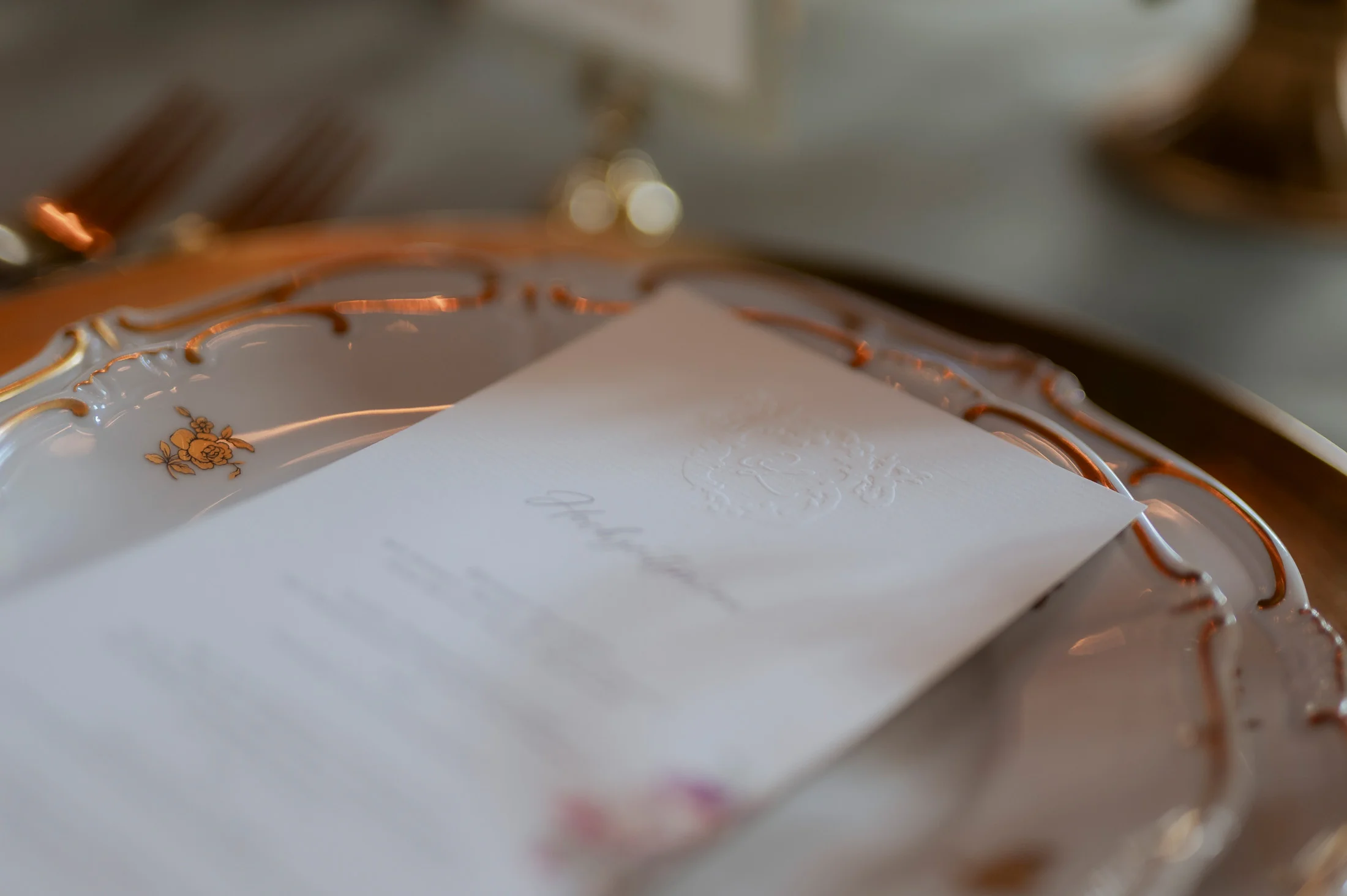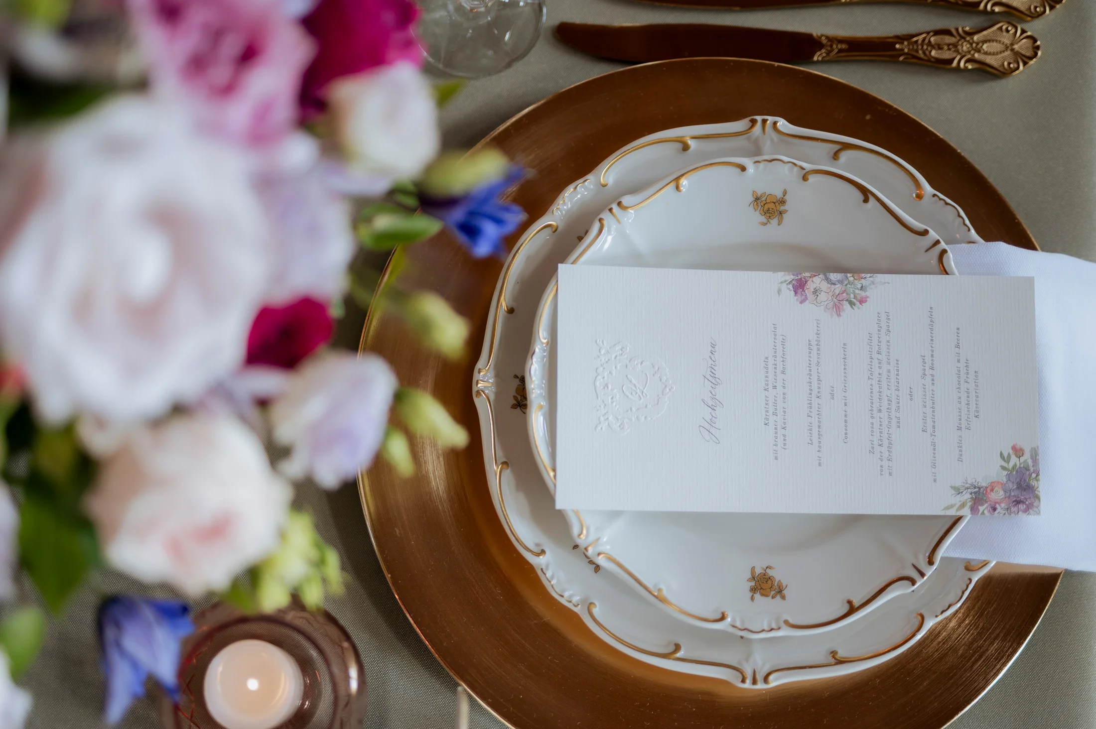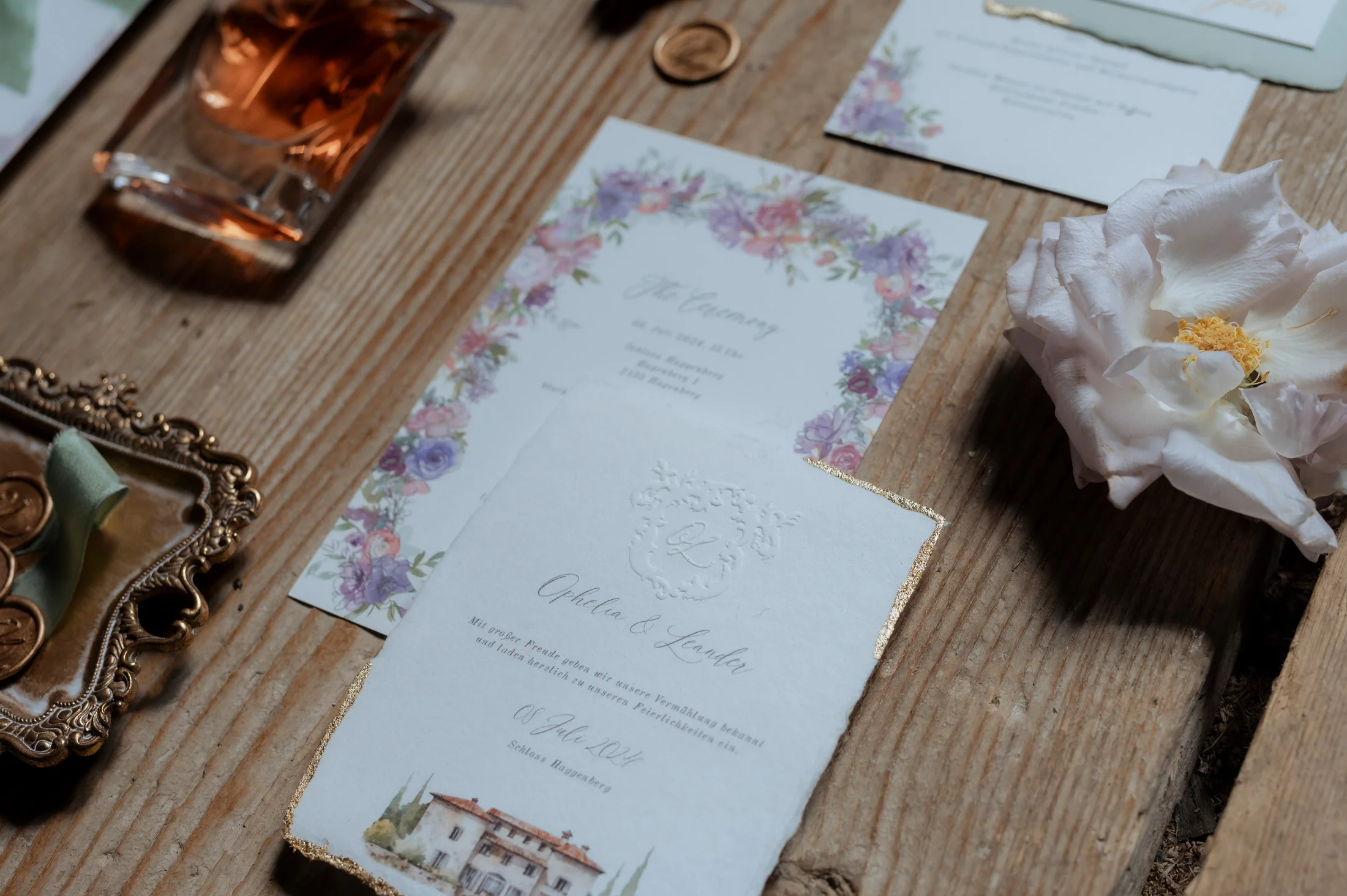 Die Einladungskarten, Menüs und Tischkärtchen kamen von Bloomatelier Kalligrafie und verliehen der Hochzeit einen luxuriösen Touch. Die handgeschriebene Kalligrafie und das elegante Design fügten sich perfekt in das Gesamtkonzept „Opulent Chic“ ein und zeigten, dass jedes Detail sorgfältig ausgewählt und auf das Thema abgestimmt war.