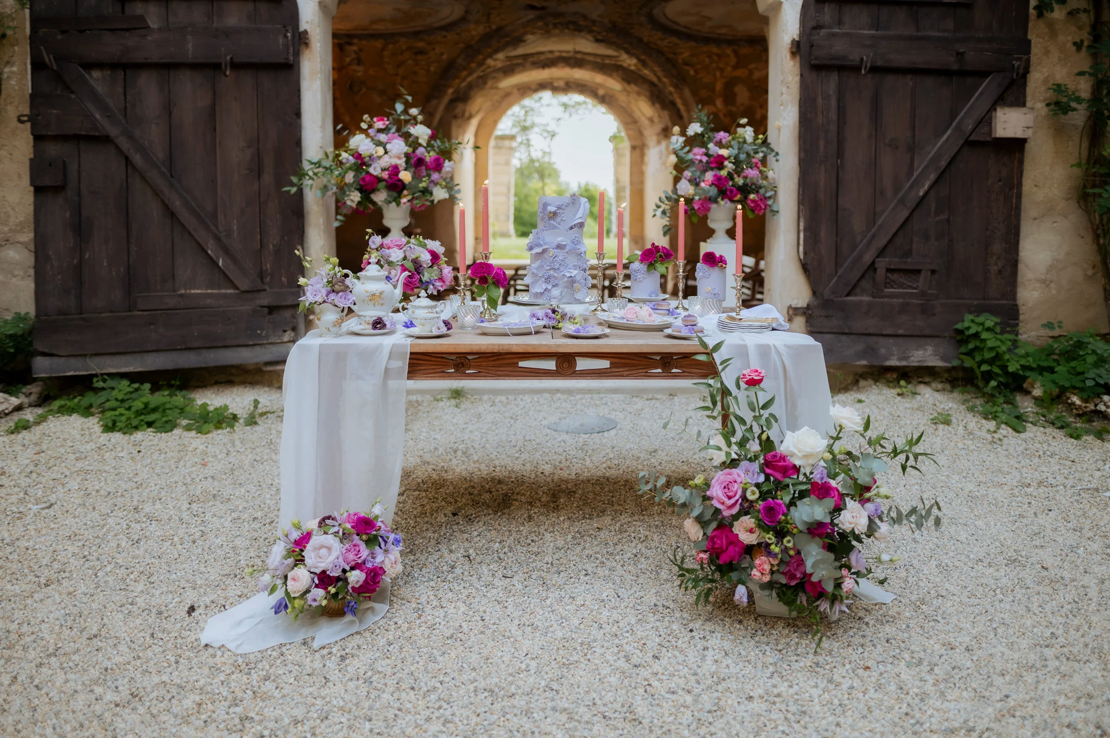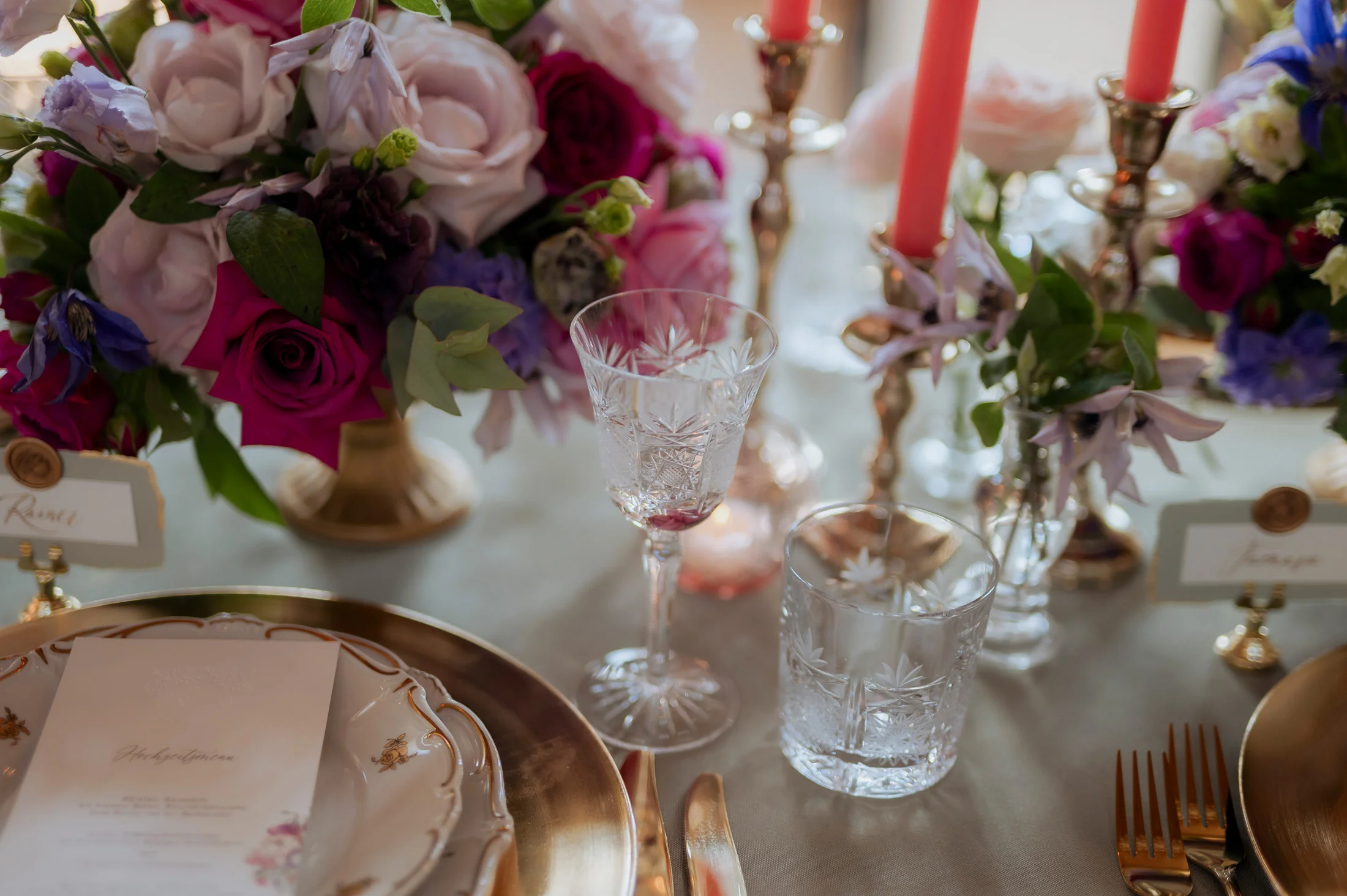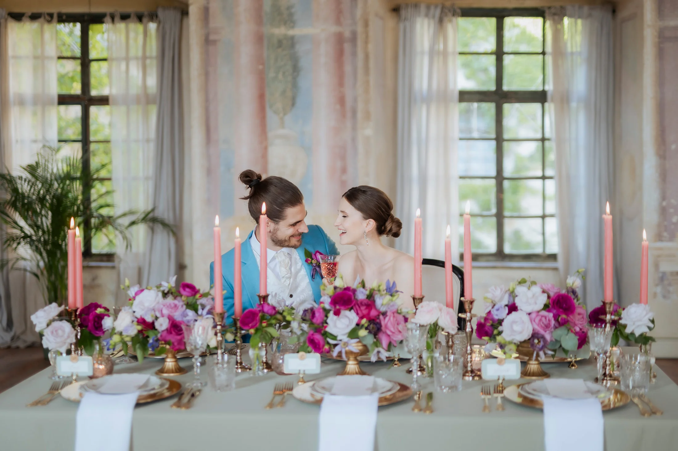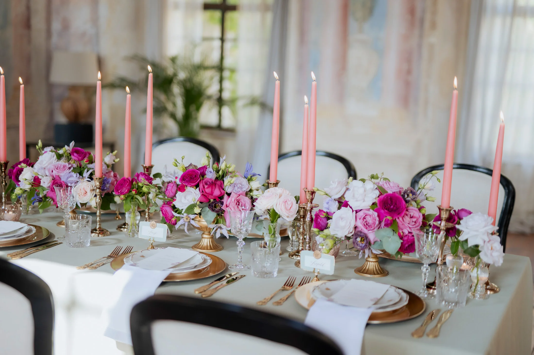 Für die florale Gestaltung und die Tischdekoration zeichnete sich das Black and Gold Atelier verantwortlich. Mit einer Farbkombination aus Magenta, Rosa und Weiß verliehen sie der Hochzeit einen luxuriösen Touch, der die Eleganz des Schlosses perfekt ergänzte. Die Tische waren kunstvoll eingedeckt und mit üppigen Blumenarrangements dekoriert, die den opulenten Stil des „Opulent Chic“-Themas unterstrichen. Dank der geschmackvollen Gestaltung und der präzisen Liebe zum Detail wurde jeder Tisch zu einem echten Blickfang und lud die Gäste zum Verweilen ein.