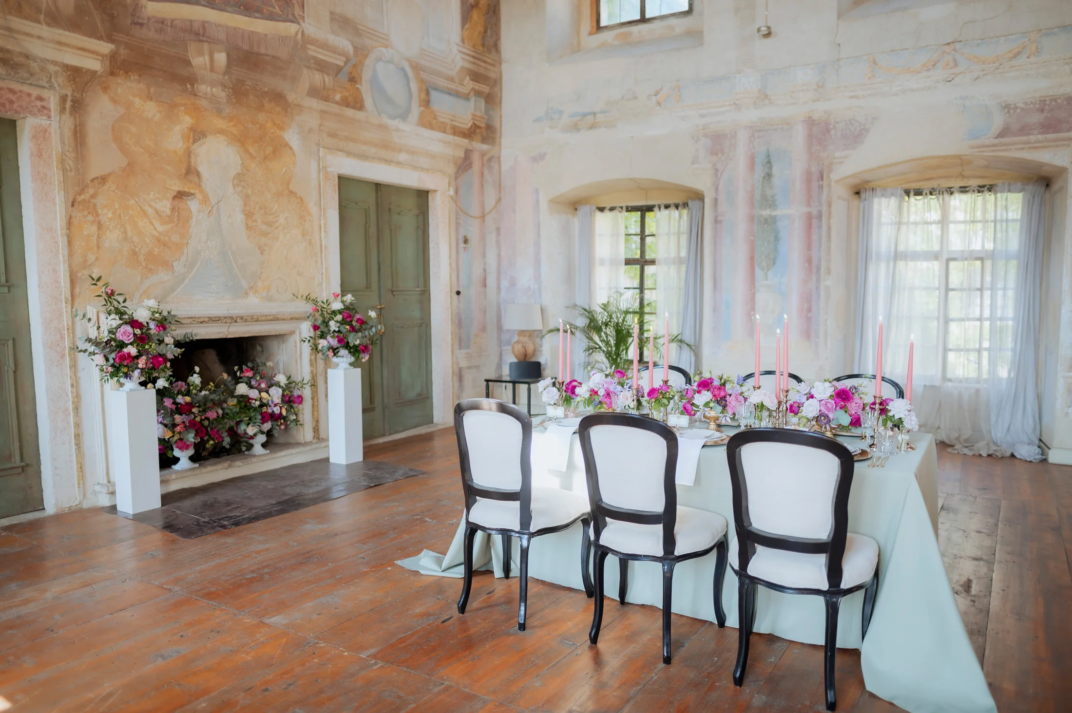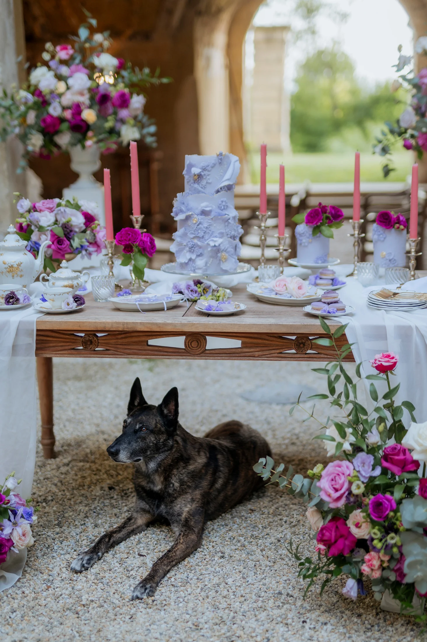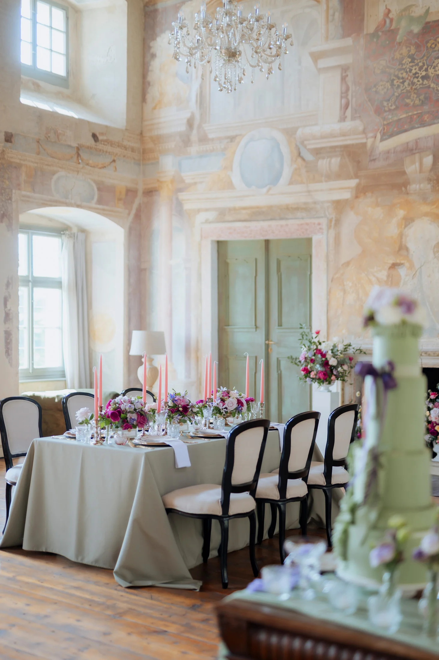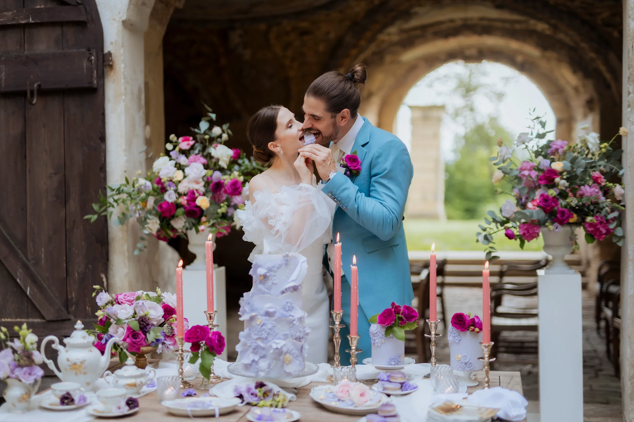 Für die florale Gestaltung und die Tischdekoration zeichnete sich das Black and Gold Atelier verantwortlich. Mit einer Farbkombination aus Magenta, Rosa und Weiß verliehen sie der Hochzeit einen luxuriösen Touch, der die Eleganz des Schlosses perfekt ergänzte. Die Tische waren kunstvoll eingedeckt und mit üppigen Blumenarrangements dekoriert, die den opulenten Stil des „Opulent Chic“-Themas unterstrichen. Dank der geschmackvollen Gestaltung und der präzisen Liebe zum Detail wurde jeder Tisch zu einem echten Blickfang und lud die Gäste zum Verweilen ein.