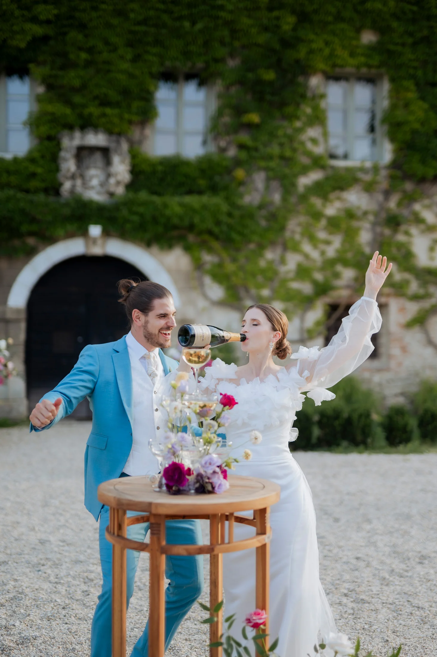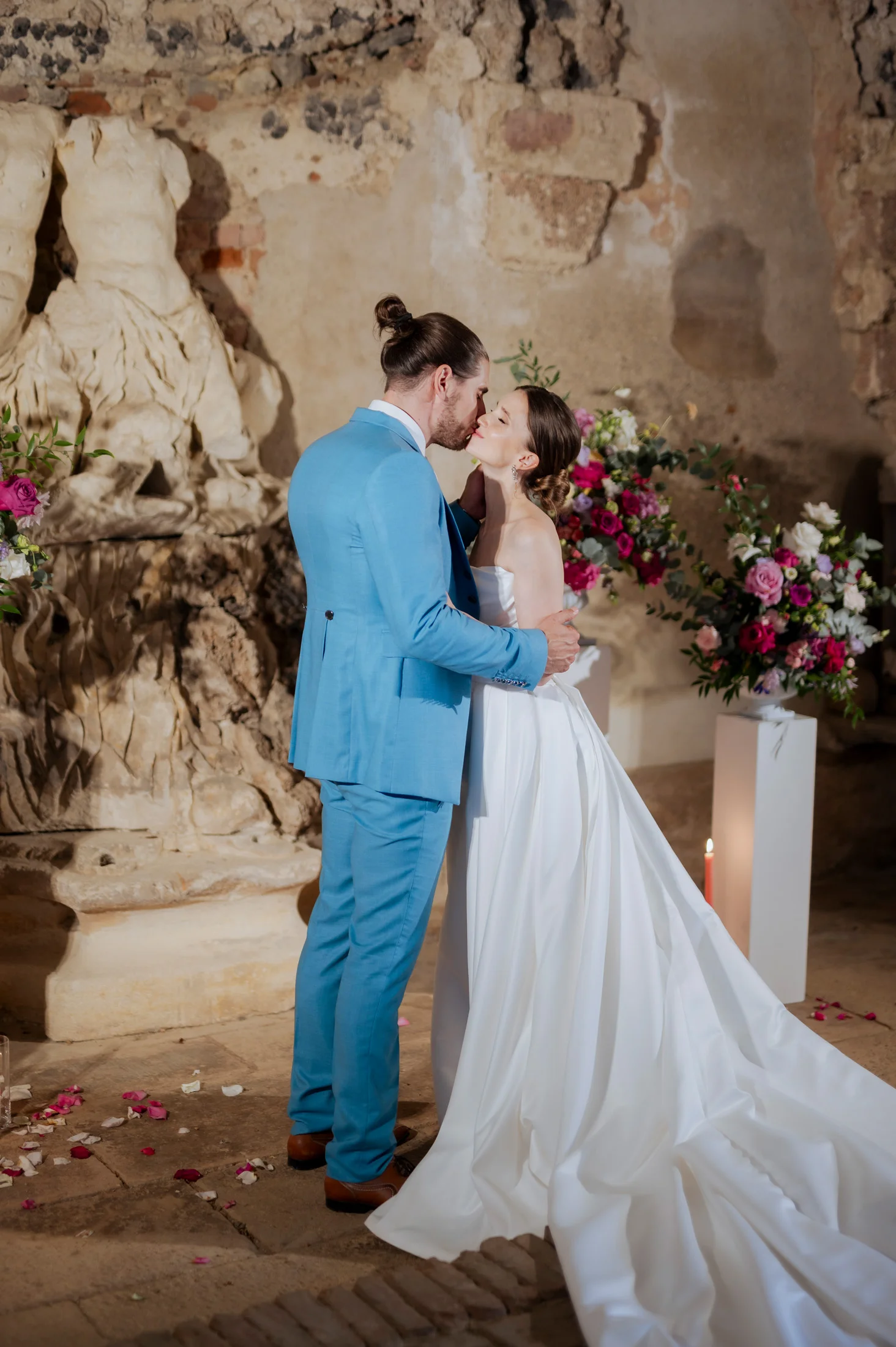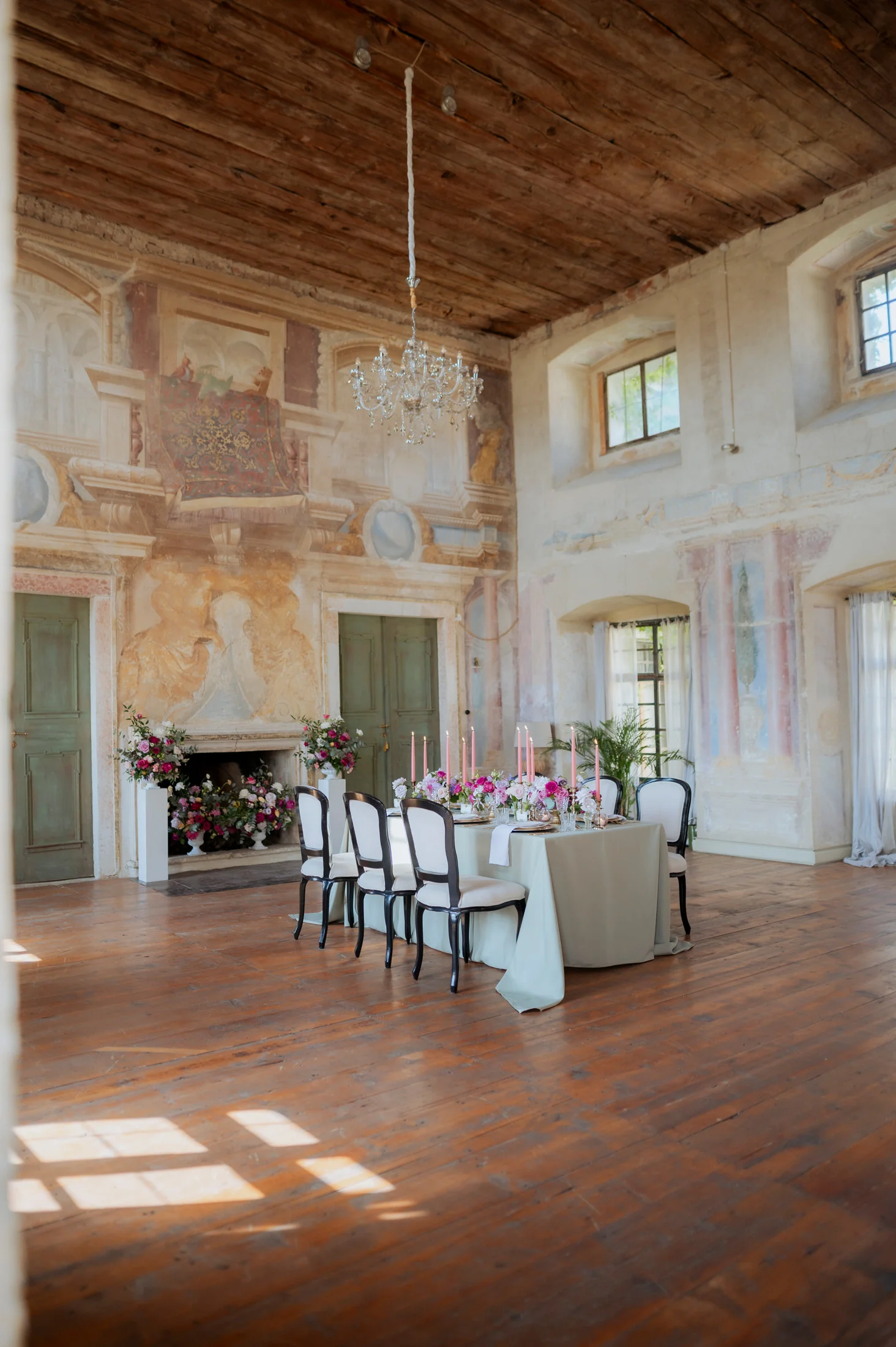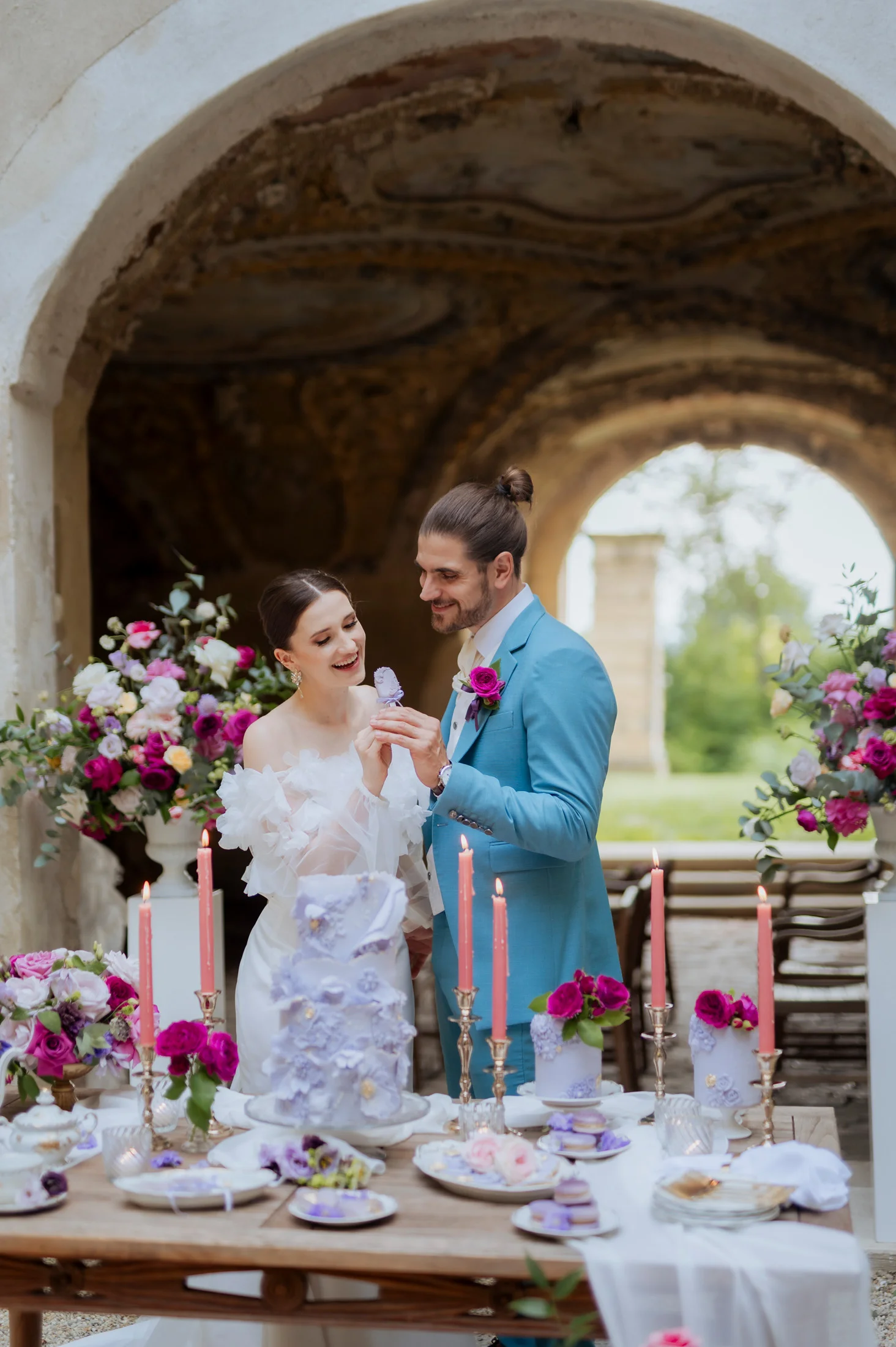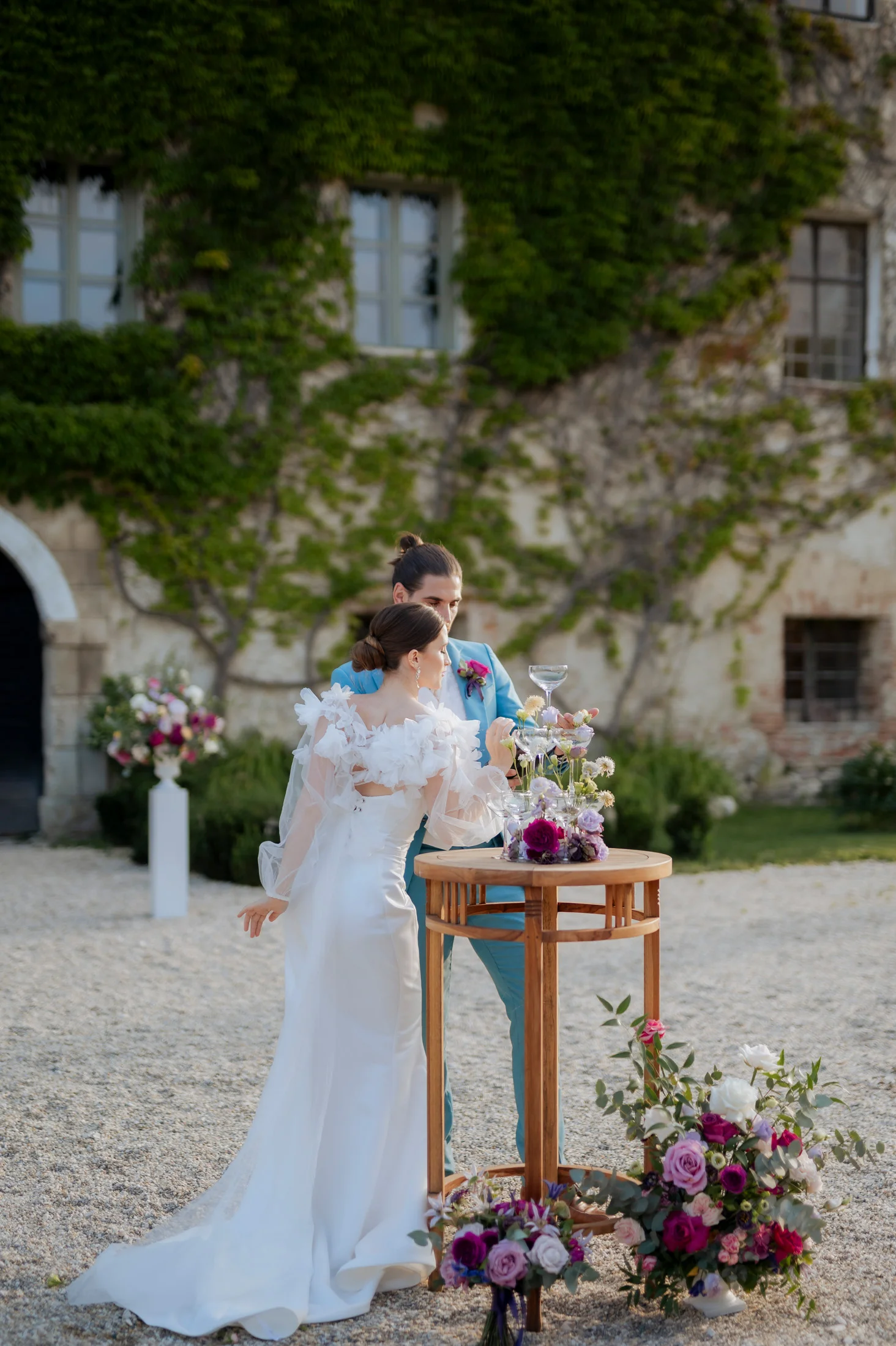 Für die florale Gestaltung und die Tischdekoration zeichnete sich das Black and Gold Atelier verantwortlich. Mit einer Farbkombination aus Magenta, Rosa und Weiß verliehen sie der Hochzeit einen luxuriösen Touch, der die Eleganz des Schlosses perfekt ergänzte. Die Tische waren kunstvoll eingedeckt und mit üppigen Blumenarrangements dekoriert, die den opulenten Stil des „Opulent Chic“-Themas unterstrichen. Dank der geschmackvollen Gestaltung und der präzisen Liebe zum Detail wurde jeder Tisch zu einem echten Blickfang und lud die Gäste zum Verweilen ein.