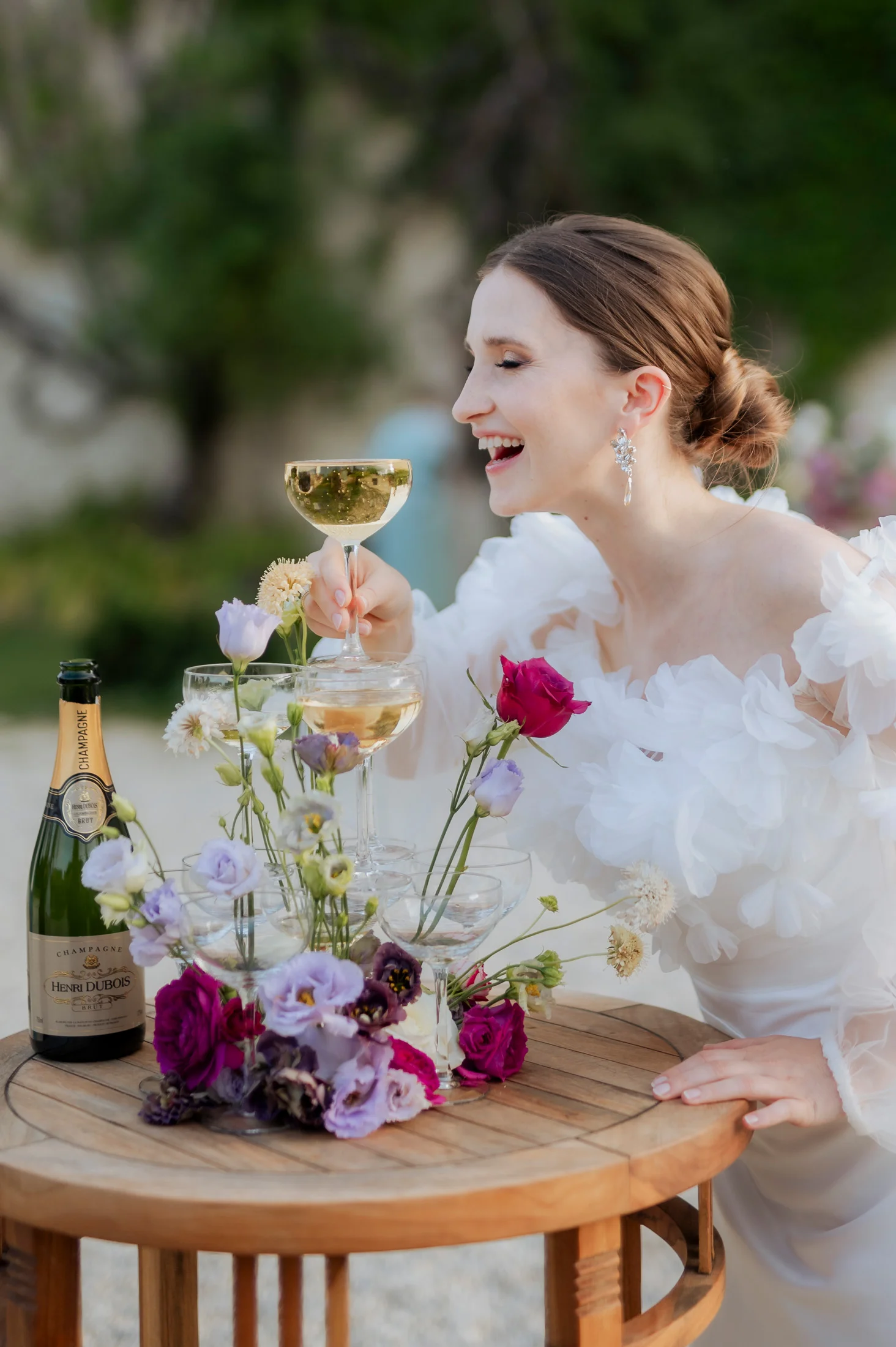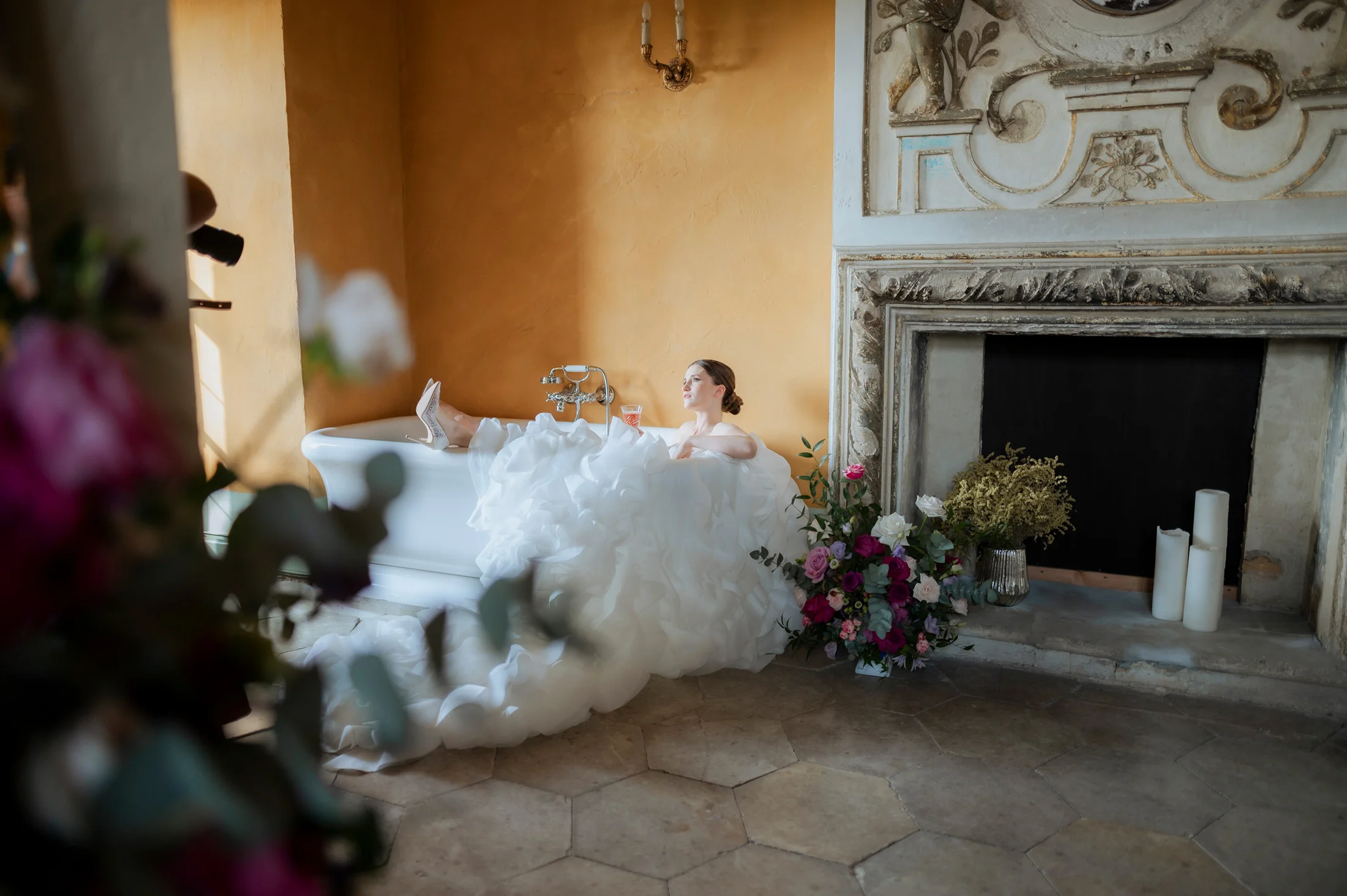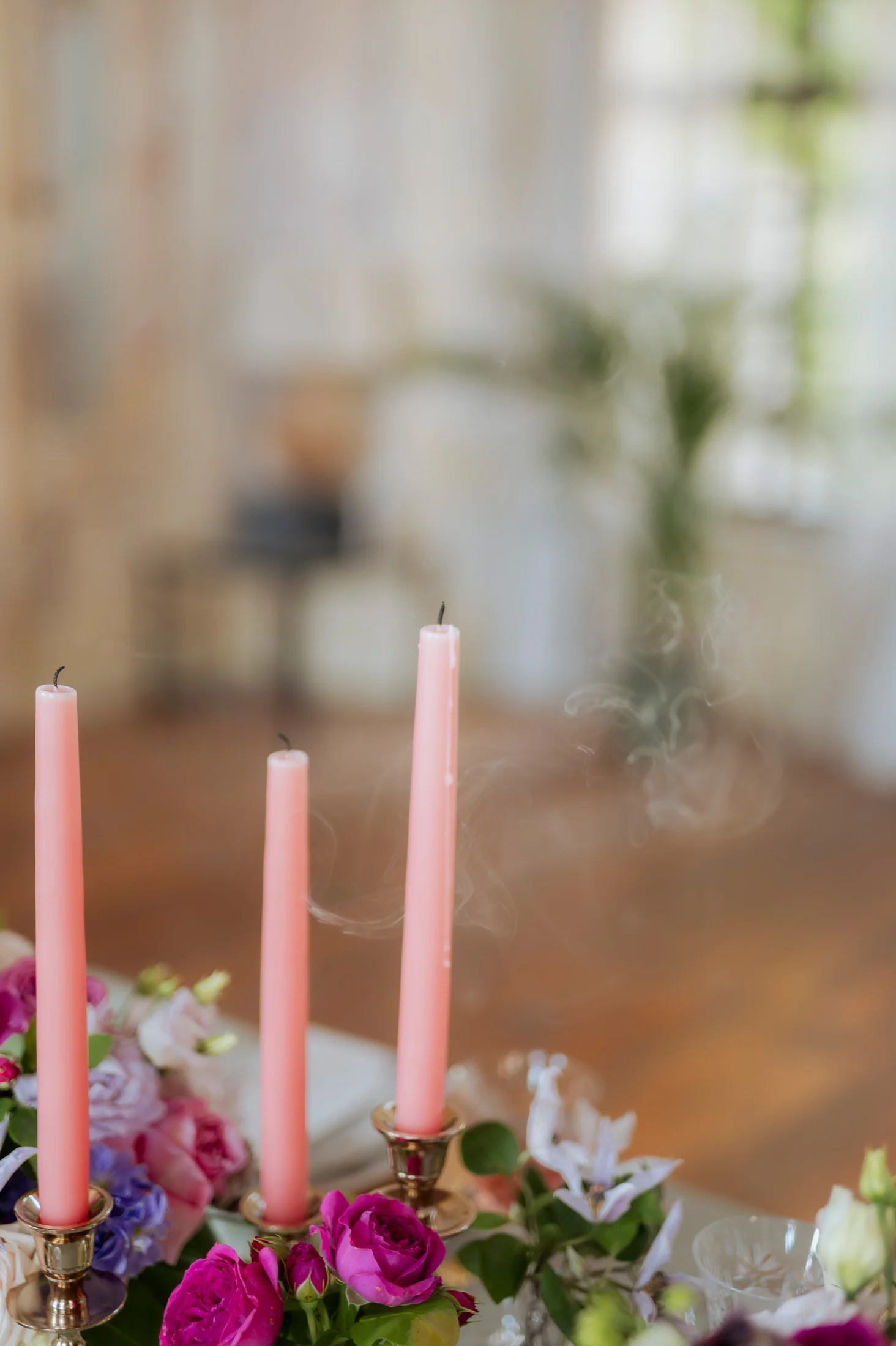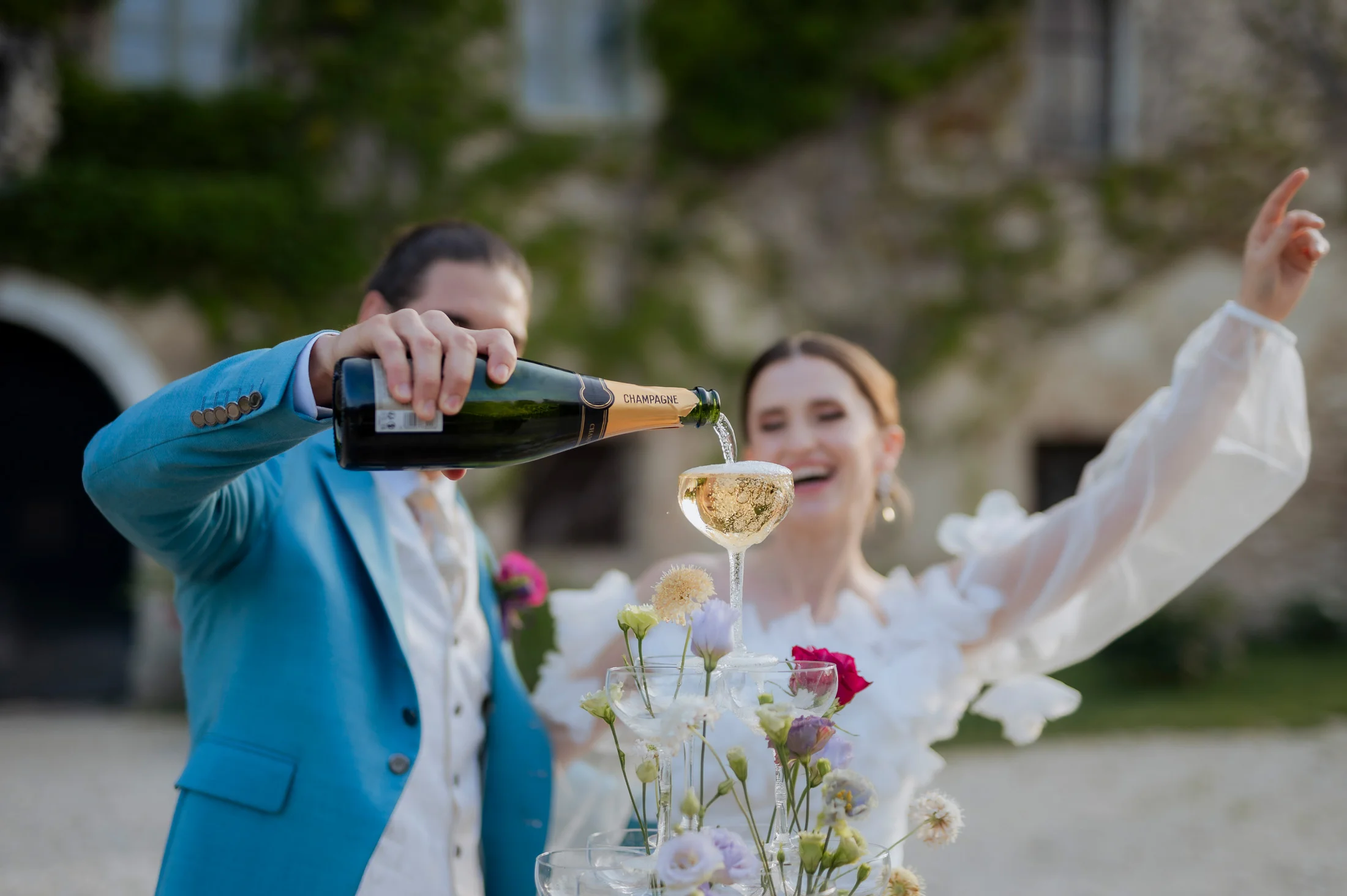 Für die florale Gestaltung und die Tischdekoration zeichnete sich das Black and Gold Atelier verantwortlich. Mit einer Farbkombination aus Magenta, Rosa und Weiß verliehen sie der Hochzeit einen luxuriösen Touch, der die Eleganz des Schlosses perfekt ergänzte. Die Tische waren kunstvoll eingedeckt und mit üppigen Blumenarrangements dekoriert, die den opulenten Stil des „Opulent Chic“-Themas unterstrichen. Dank der geschmackvollen Gestaltung und der präzisen Liebe zum Detail wurde jeder Tisch zu einem echten Blickfang und lud die Gäste zum Verweilen ein.