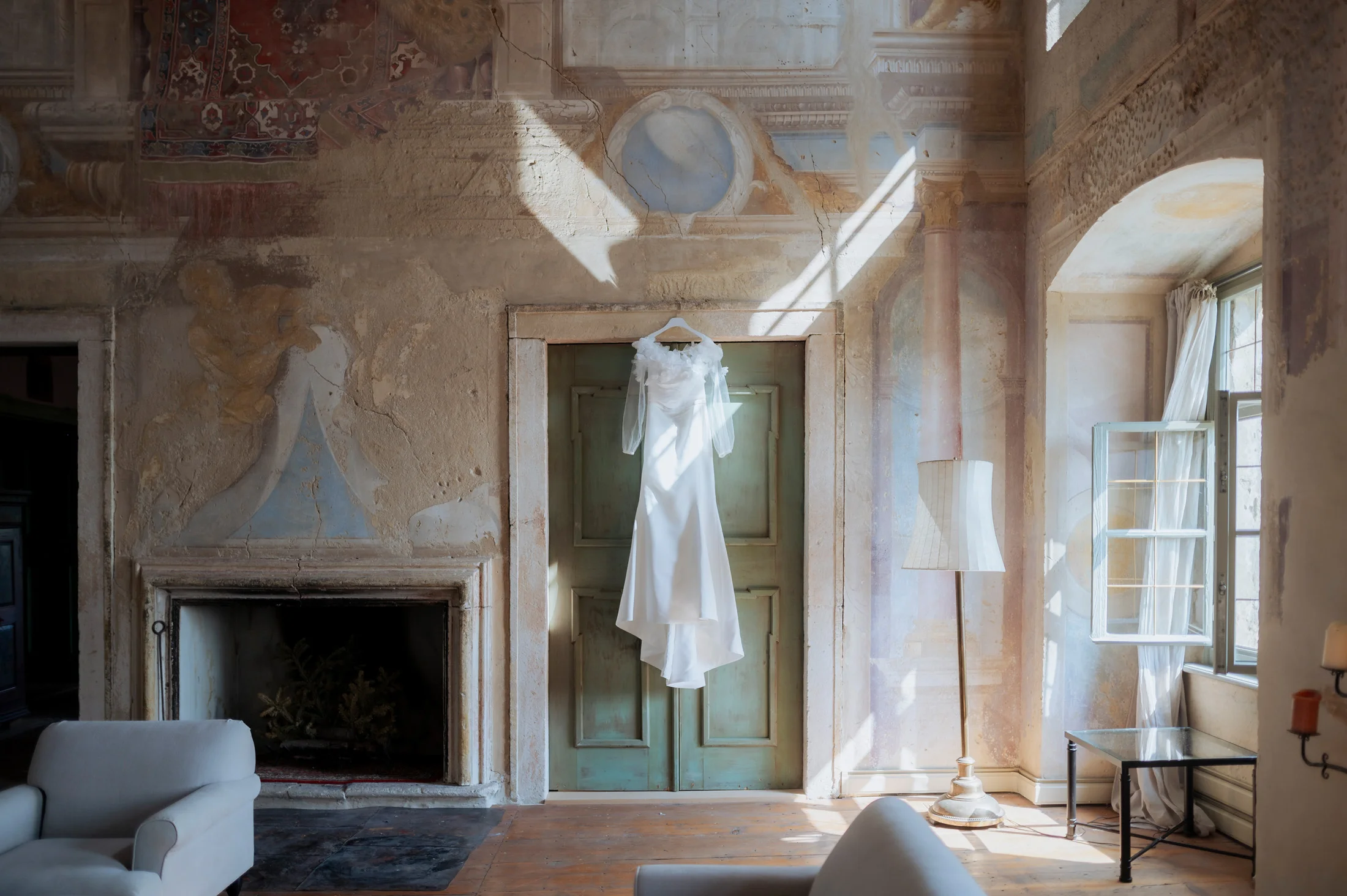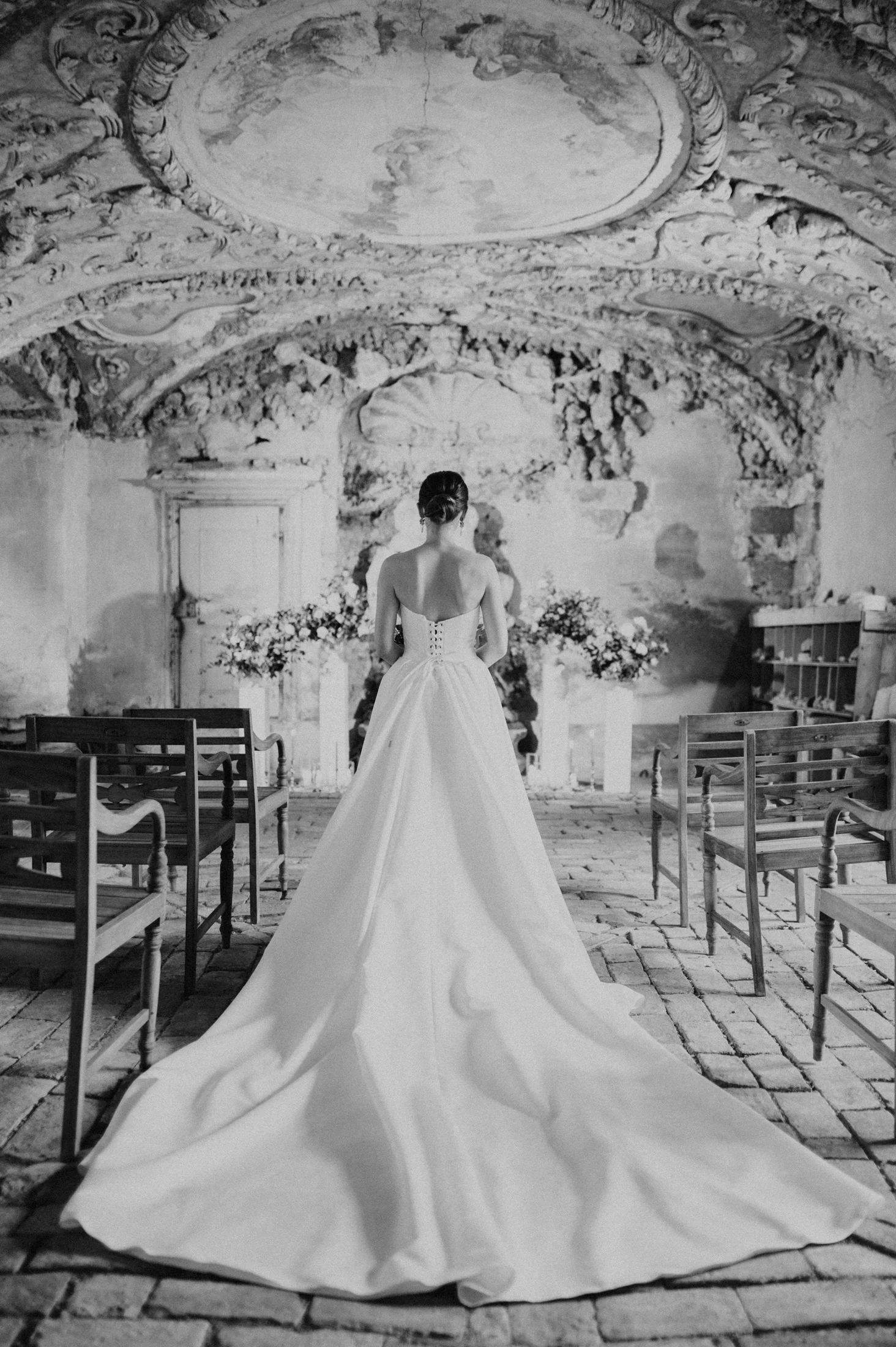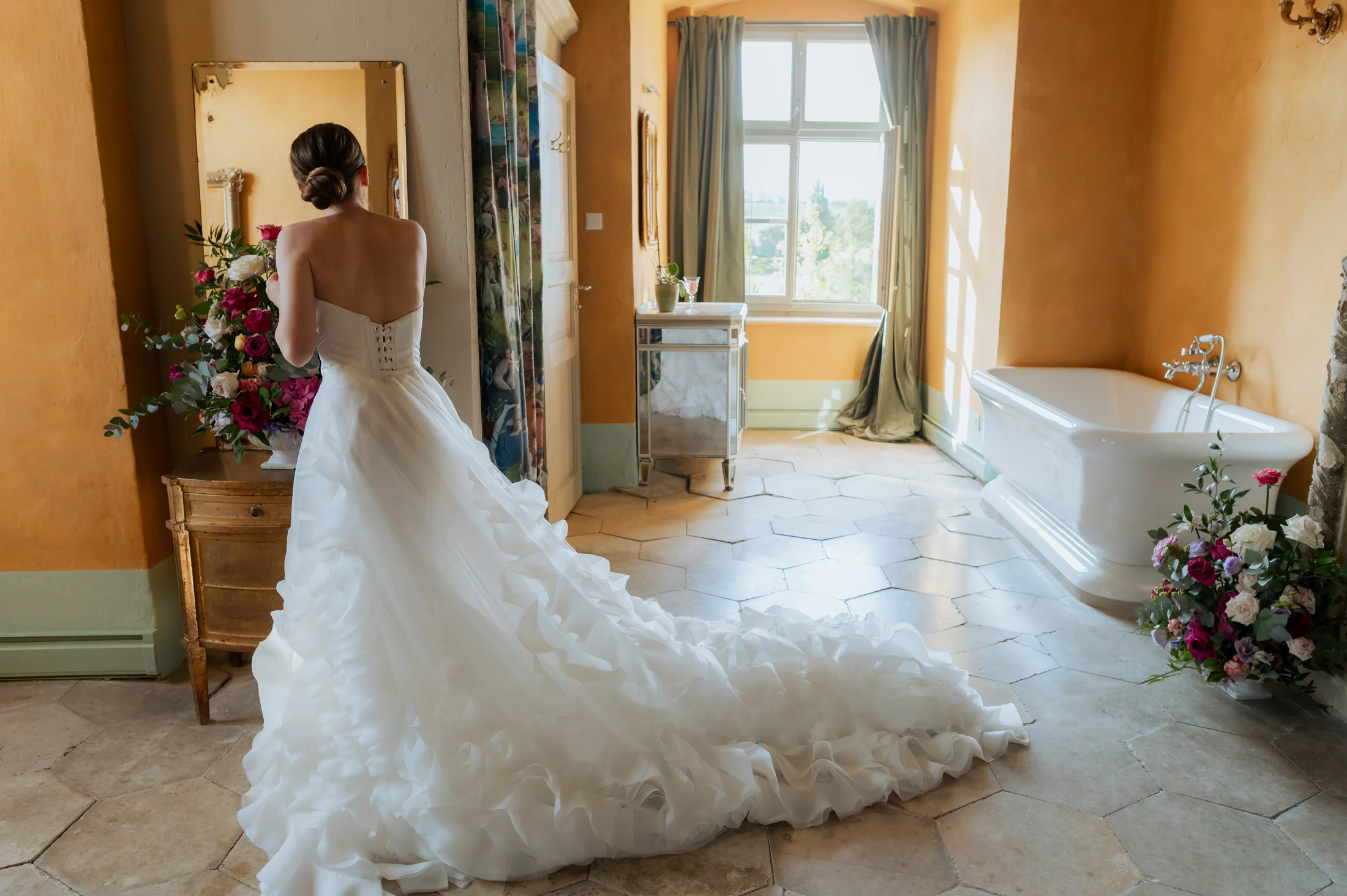 Das Brautkleid stammte aus dem Love Glow Concept, einem Atelier für hochwertige Brautmode. Der elegante, zeitlose Schnitt des Kleides harmonierte mit dem klassischen Stil des Schlosses und passte perfekt zum Gesamtkonzept. Die Braut strahlte in ihrem traumhaften Kleid, das in der historischen Kulisse des Schlosses besonders gut zur Geltung kam.