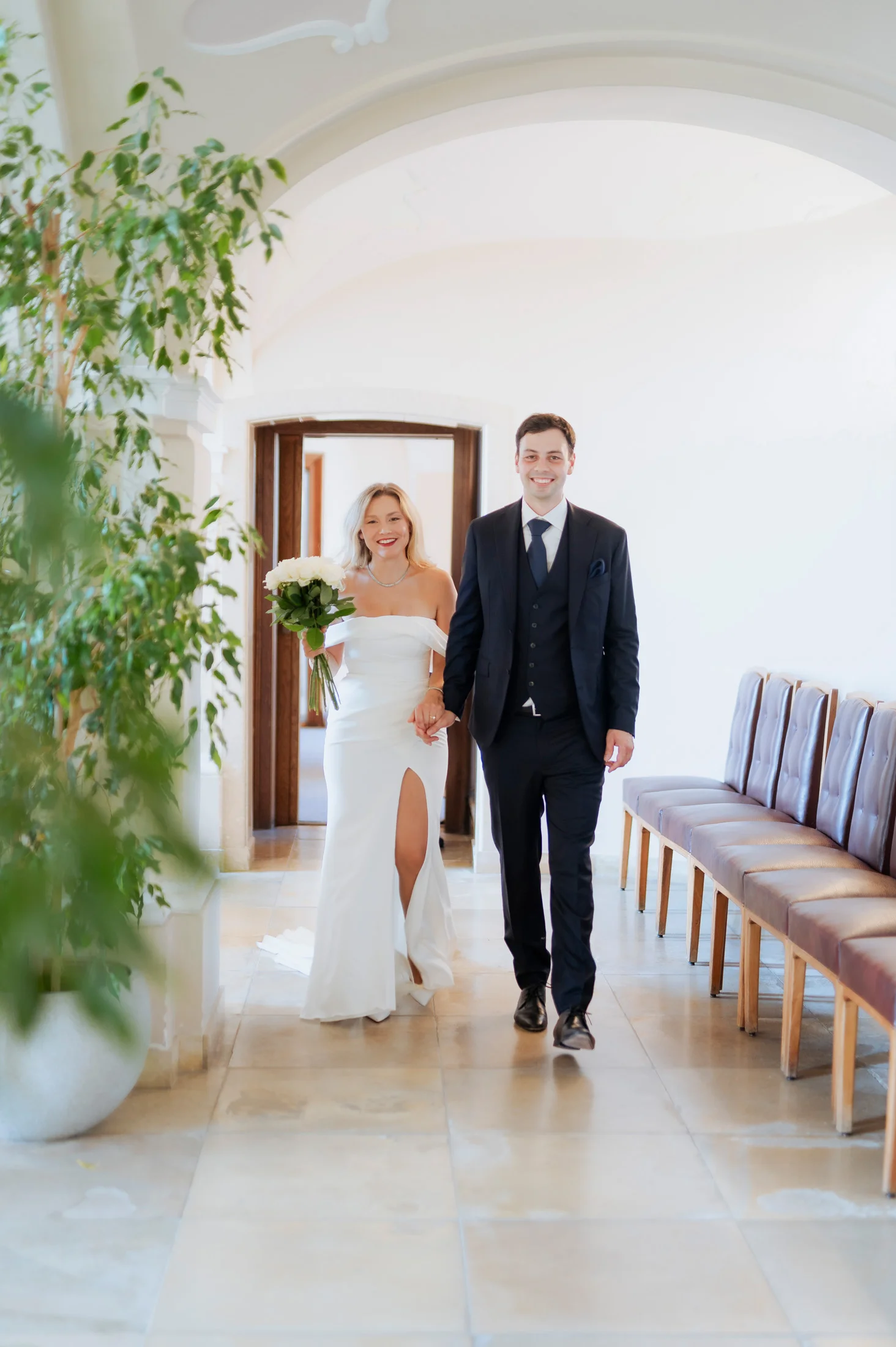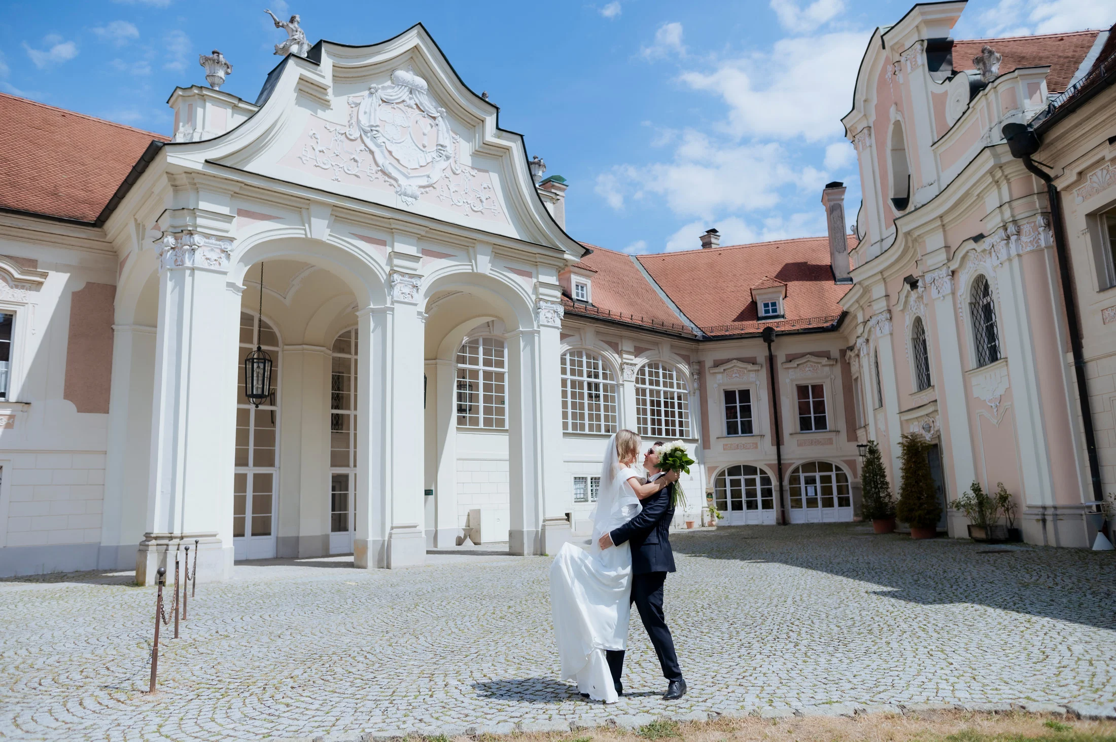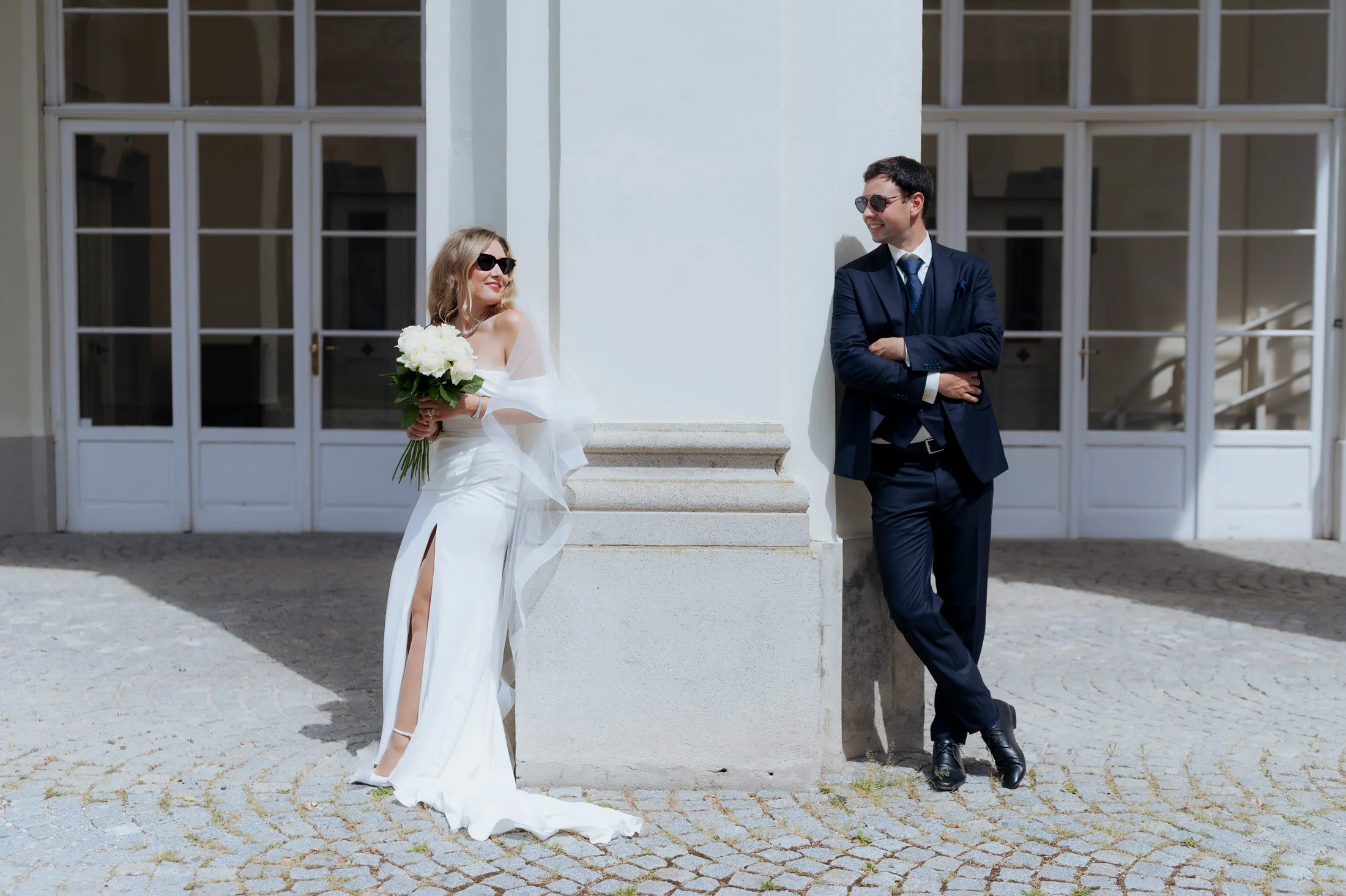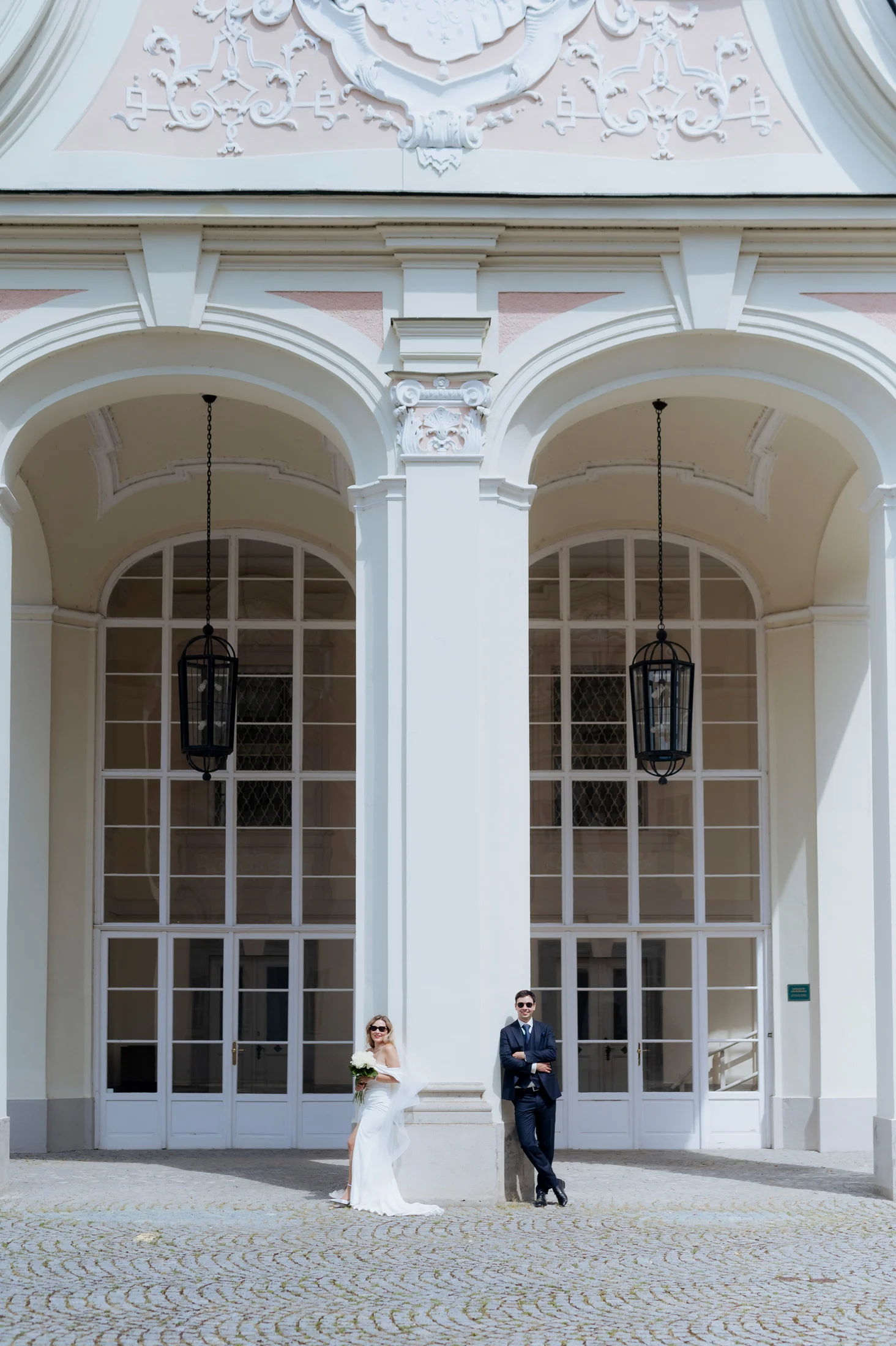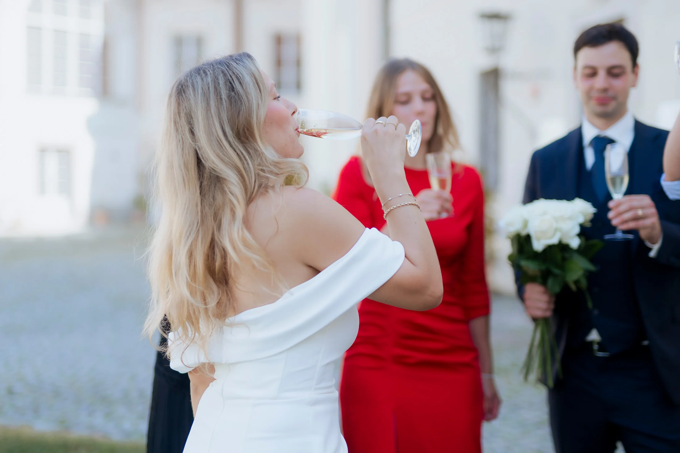 Das Schloss bot die perfekte Kulisse für ihre elegante und doch persönliche Feier. Mit einer kleinen Runde ihrer engsten Freunde und Familie reisten sie aus Tirol an, um diesen besonderen Ort zu genießen. Die historischen Mauern und der wunderschöne Innenhof des Schlosses verliehen der Hochzeit einen romantischen Charme, der zu den beiden perfekt passte.