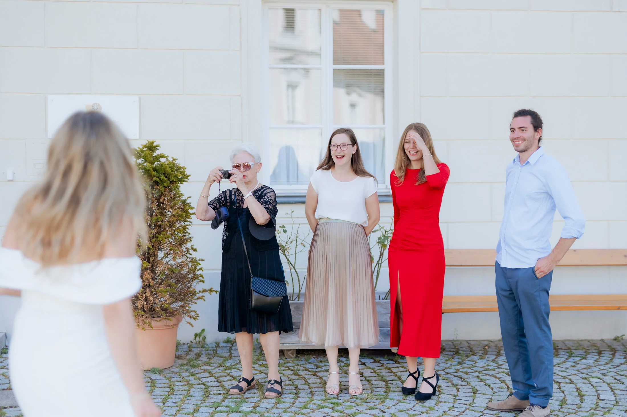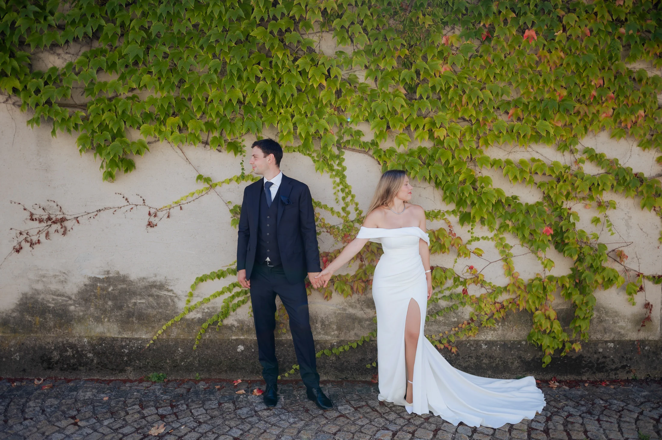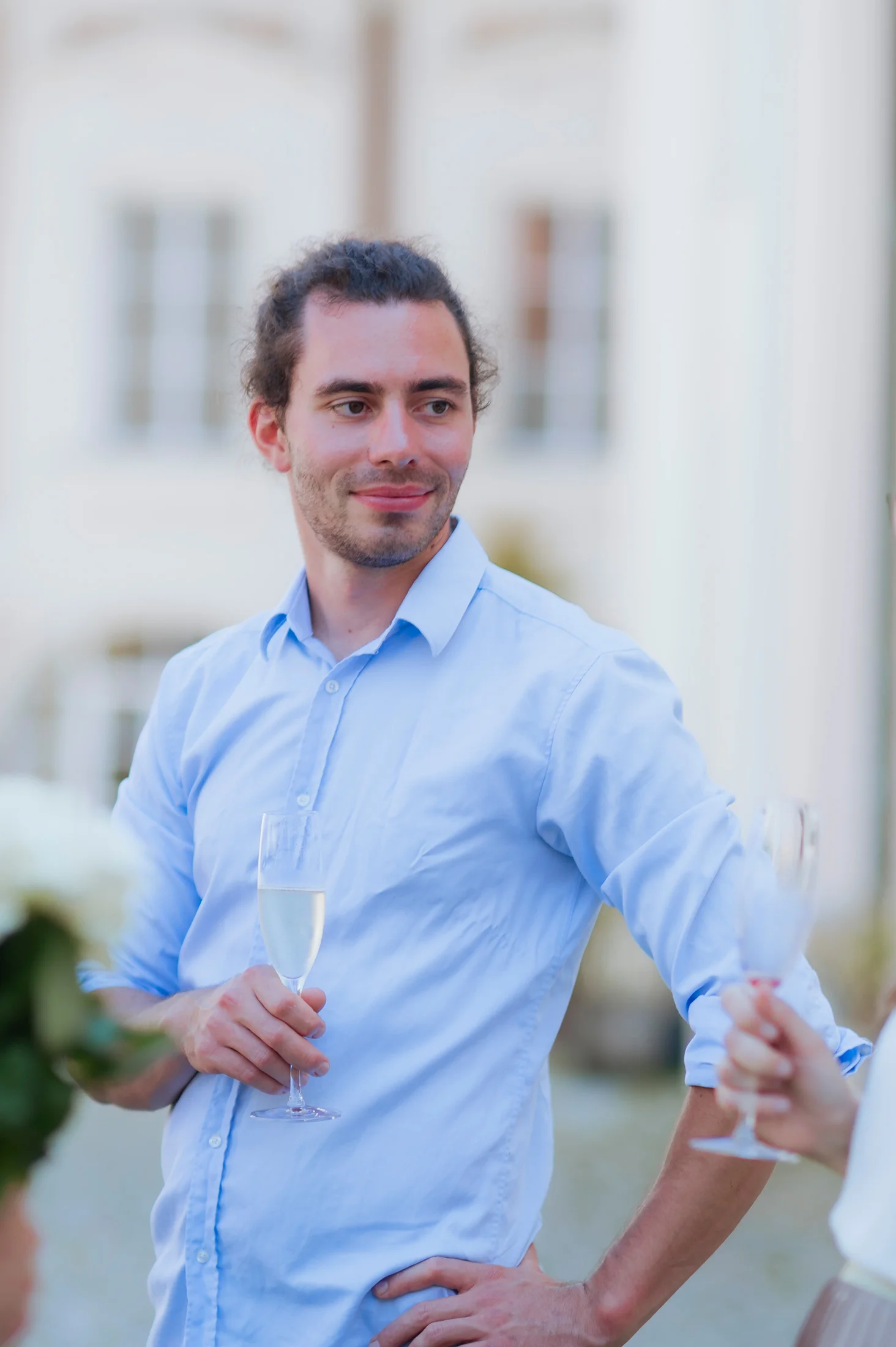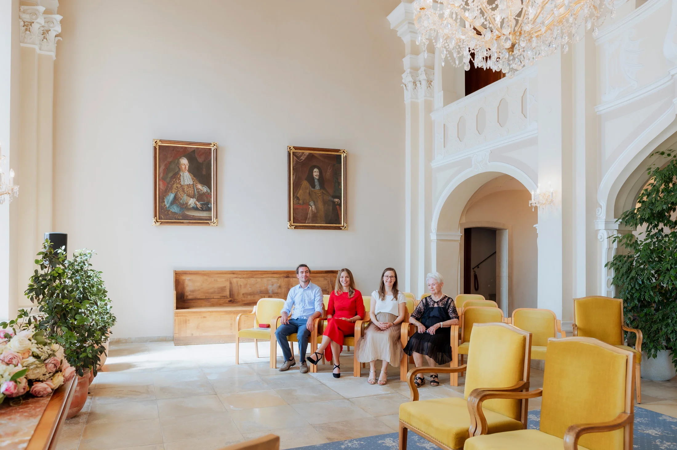 Das Schloss bot die perfekte Kulisse für ihre elegante und doch persönliche Feier. Mit einer kleinen Runde ihrer engsten Freunde und Familie reisten sie aus Tirol an, um diesen besonderen Ort zu genießen. Die historischen Mauern und der wunderschöne Innenhof des Schlosses verliehen der Hochzeit einen romantischen Charme, der zu den beiden perfekt passte.