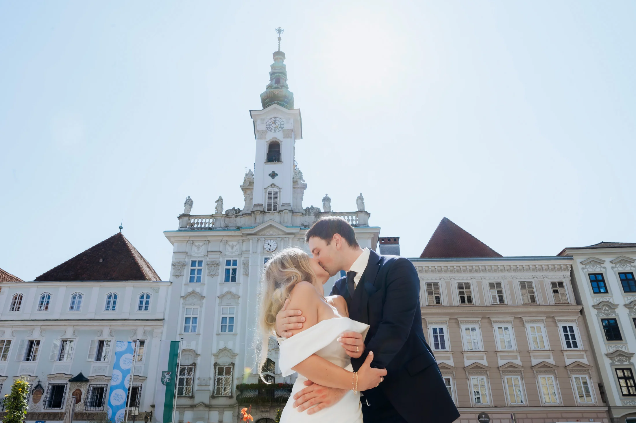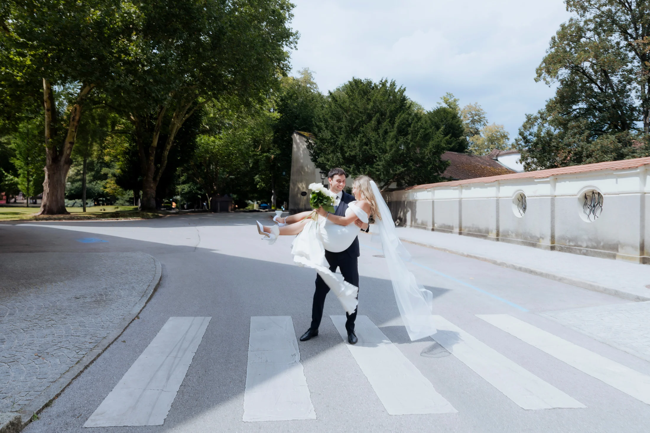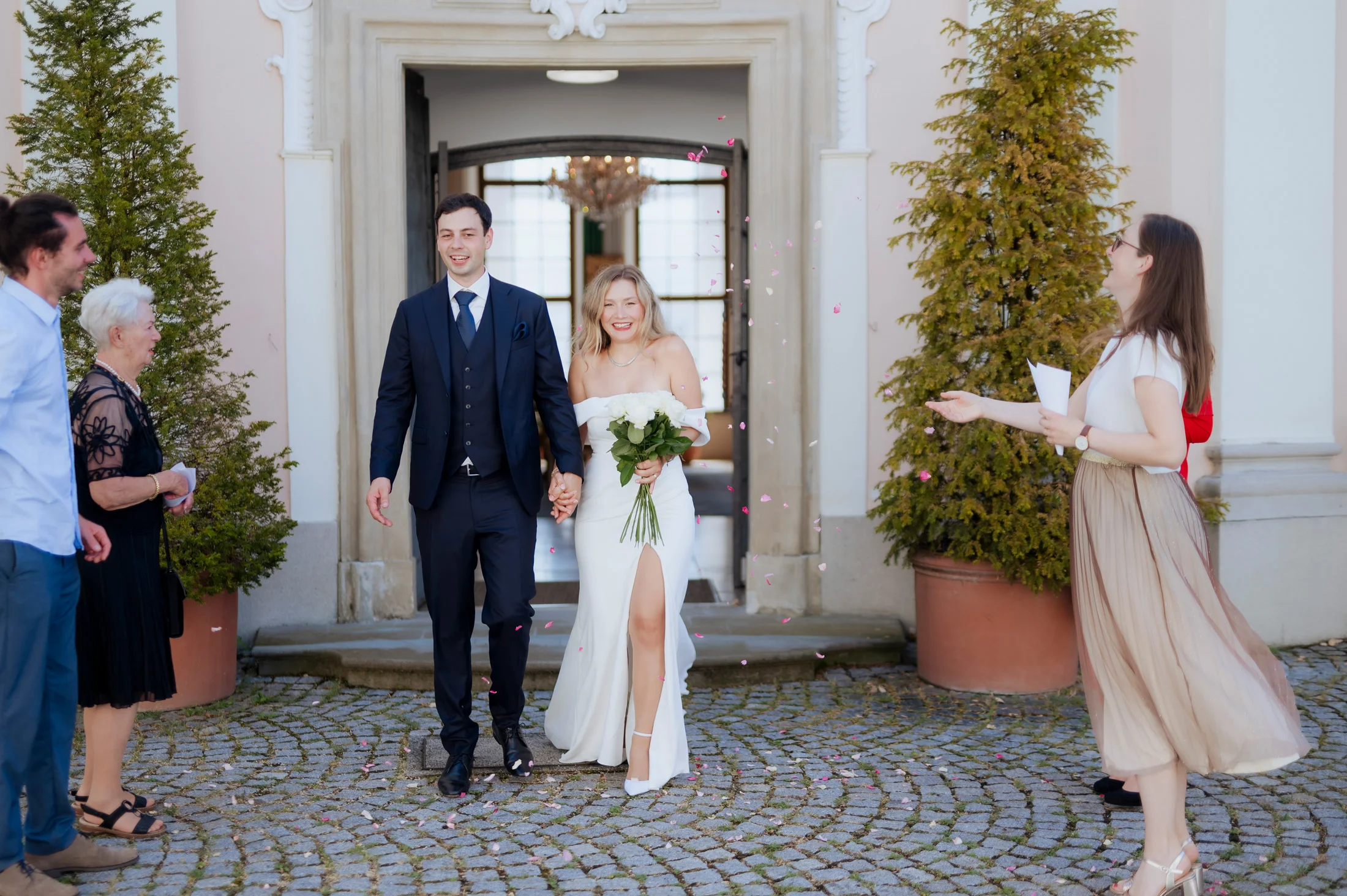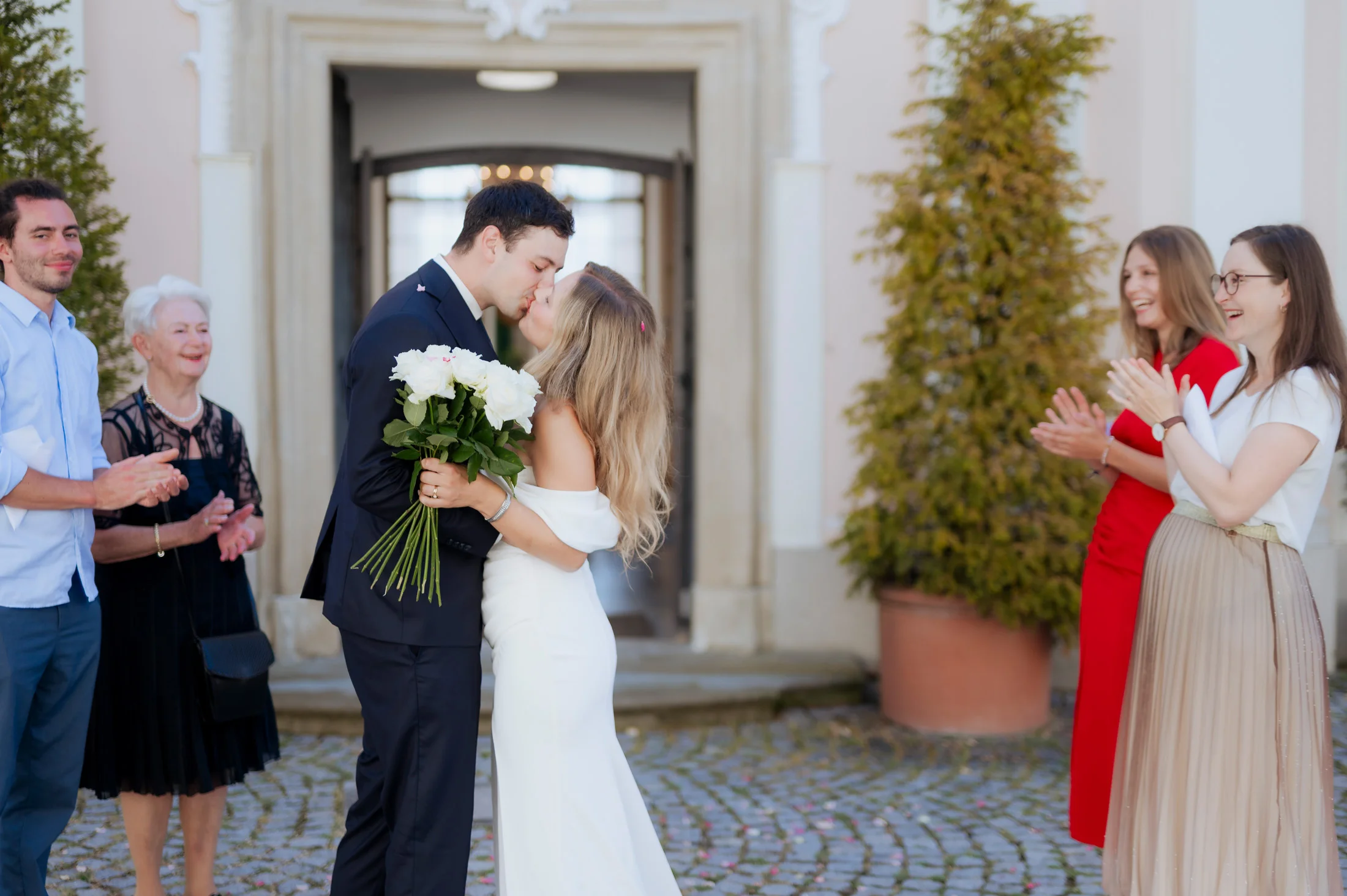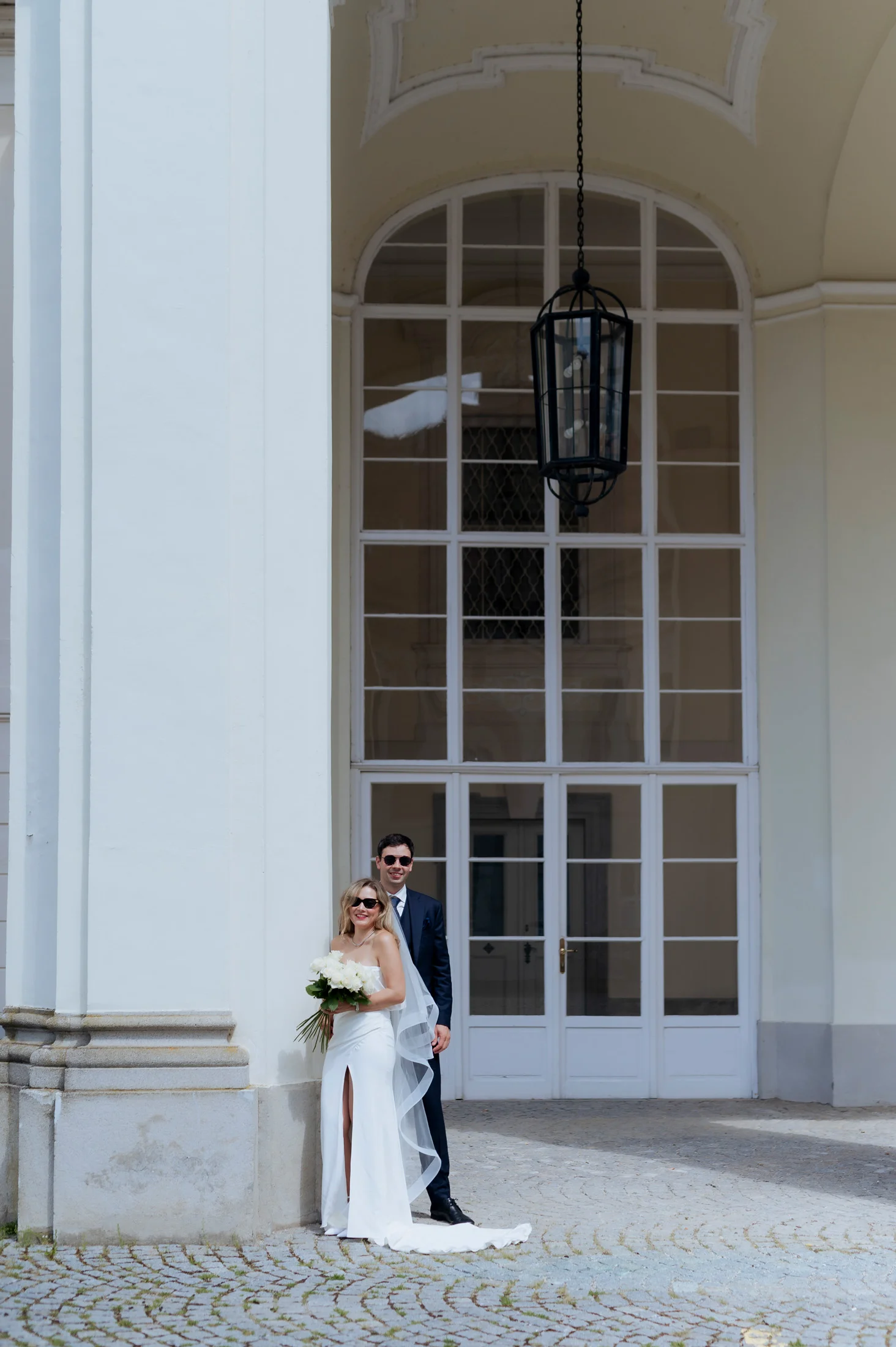 Das Schloss bot die perfekte Kulisse für ihre elegante und doch persönliche Feier. Mit einer kleinen Runde ihrer engsten Freunde und Familie reisten sie aus Tirol an, um diesen besonderen Ort zu genießen. Die historischen Mauern und der wunderschöne Innenhof des Schlosses verliehen der Hochzeit einen romantischen Charme, der zu den beiden perfekt passte.