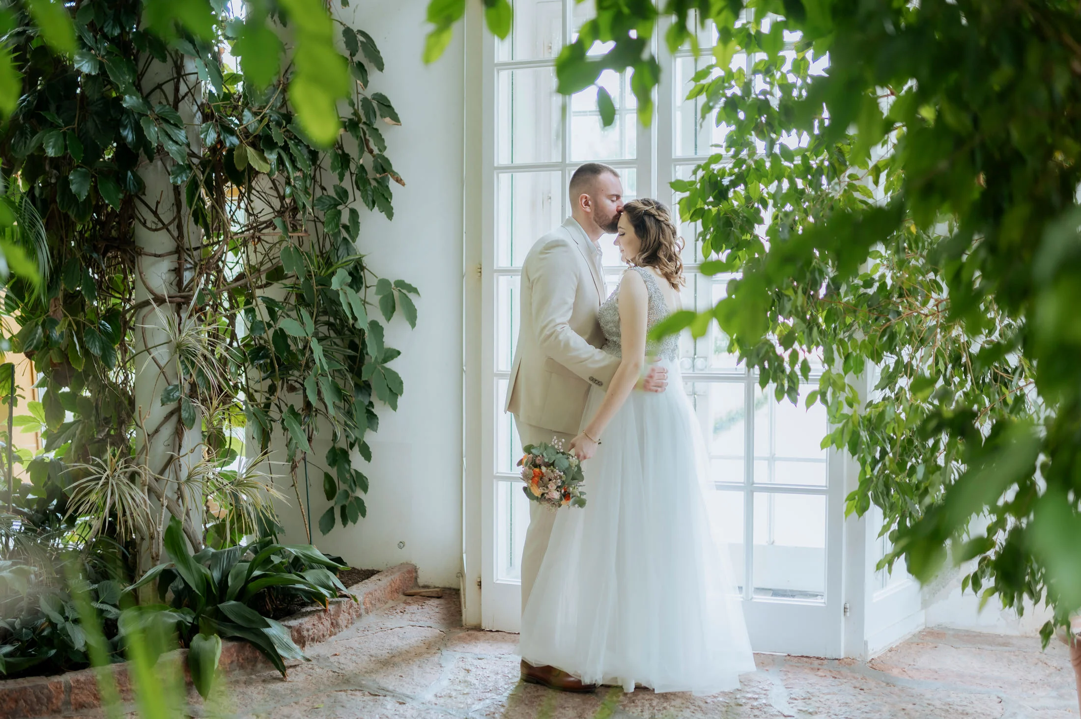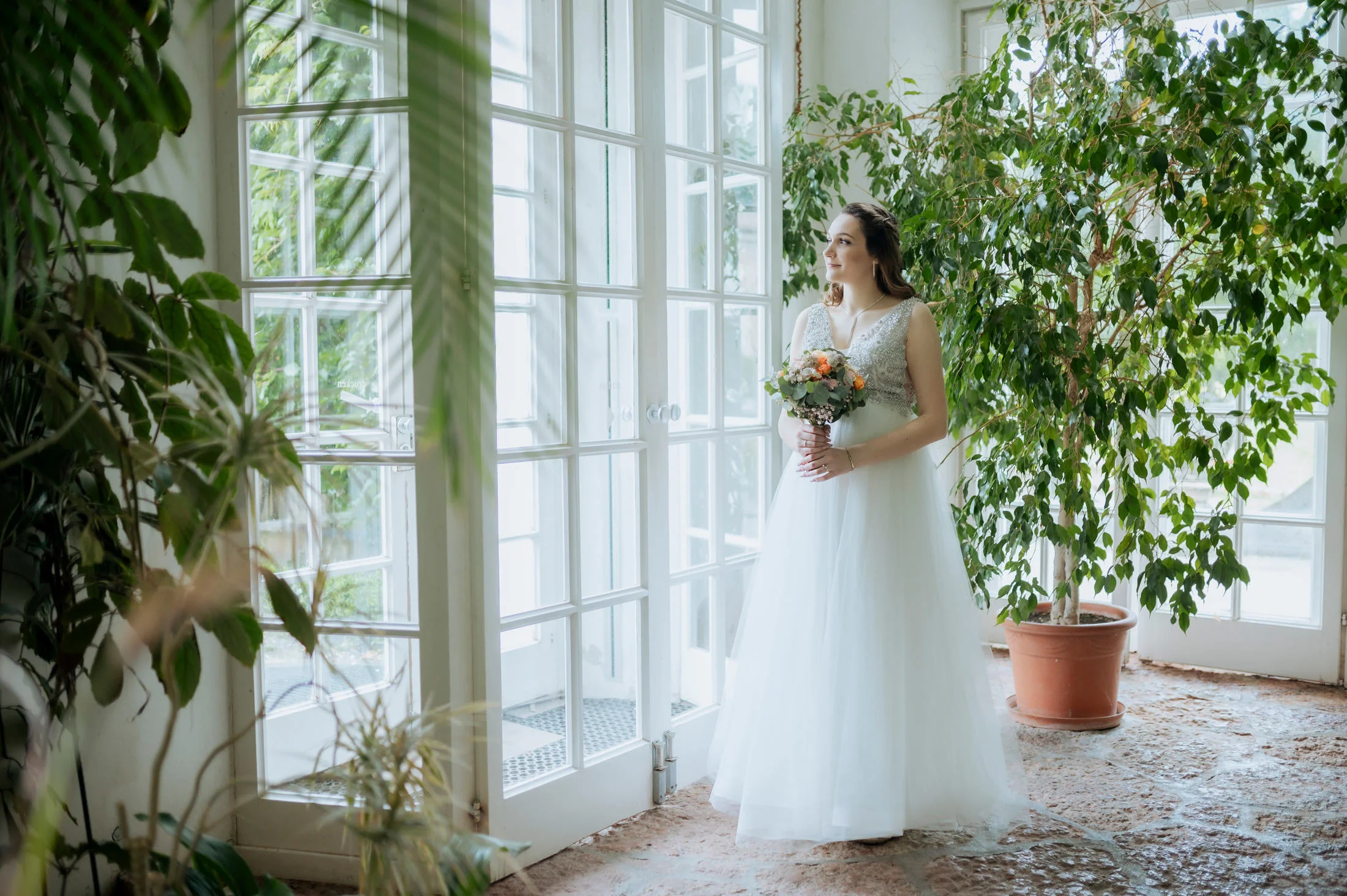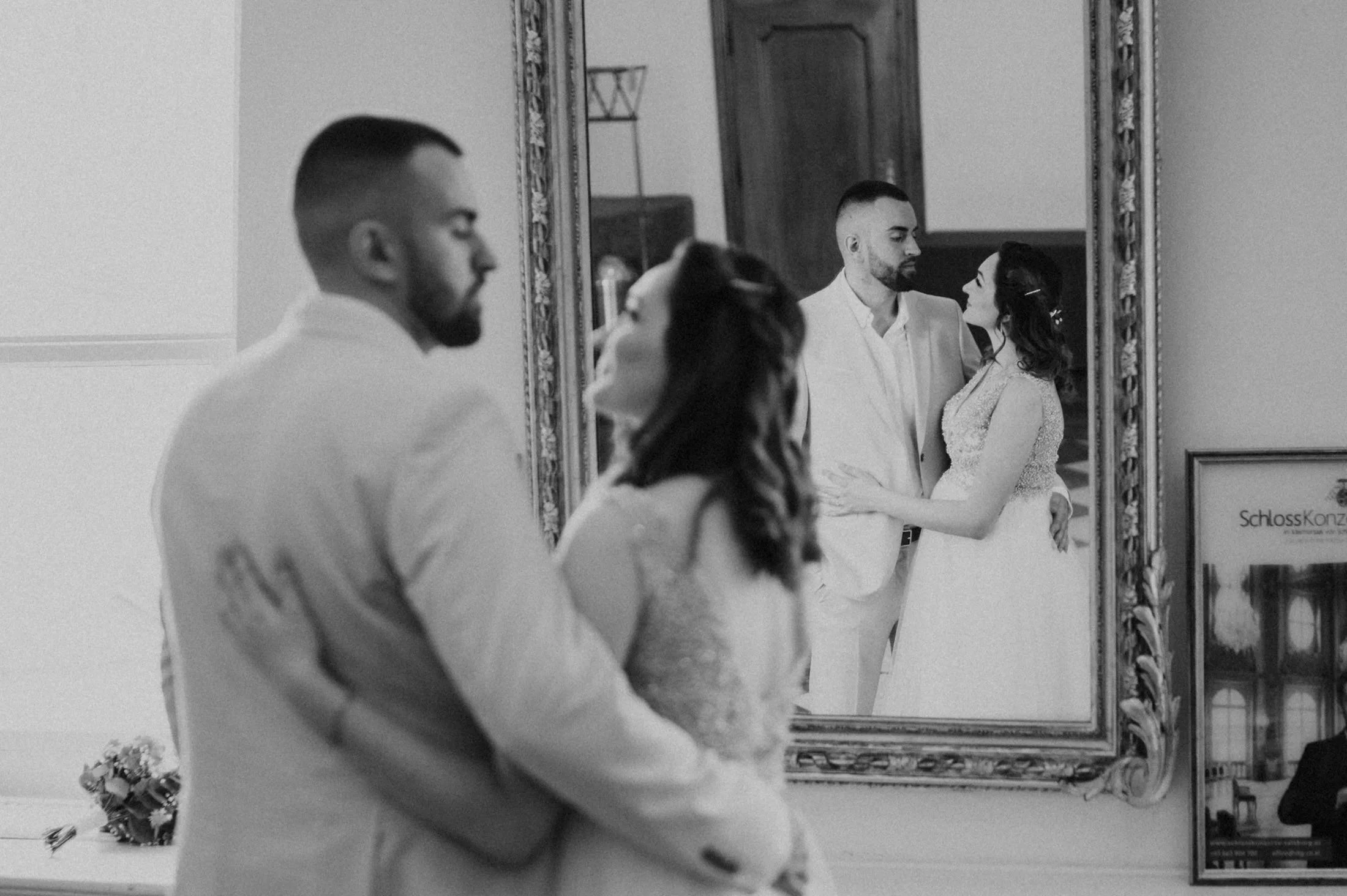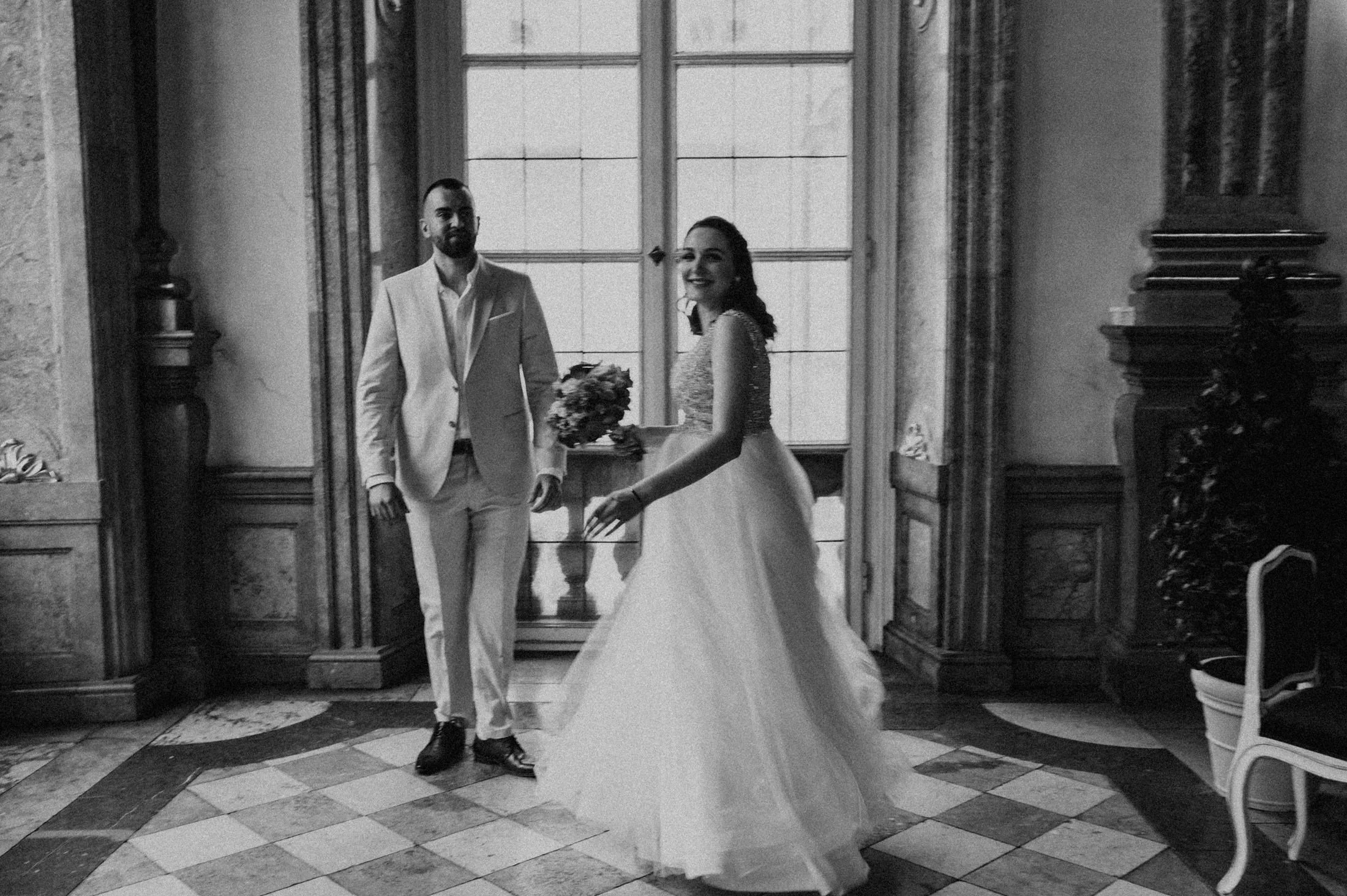 Selbst bei regnerischem Wetter bietet das Schloss unzählige Möglichkeiten für stimmungsvolle Fotos und intime Momente. Die Gänge und Säle strahlen eine zeitlose Eleganz aus, die selbst kleineren Hochzeitsgesellschaften wie bei Anita und Perica das Gefühl gibt, etwas ganz Großes zu feiern.