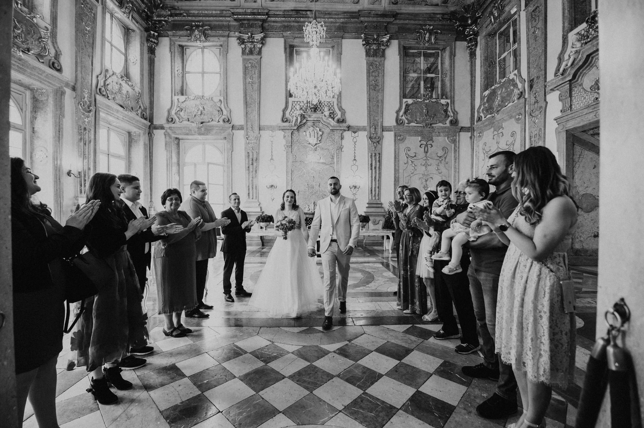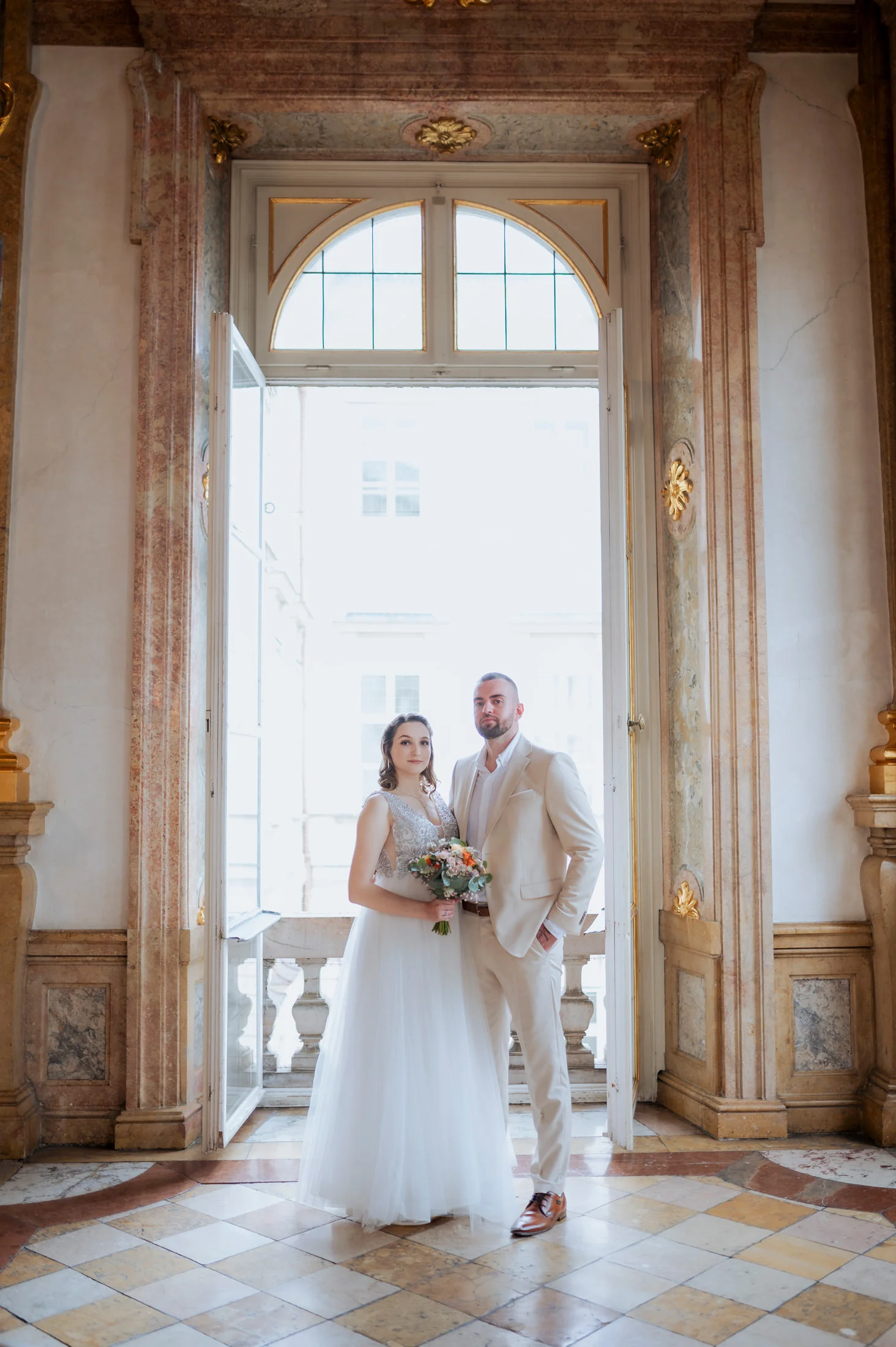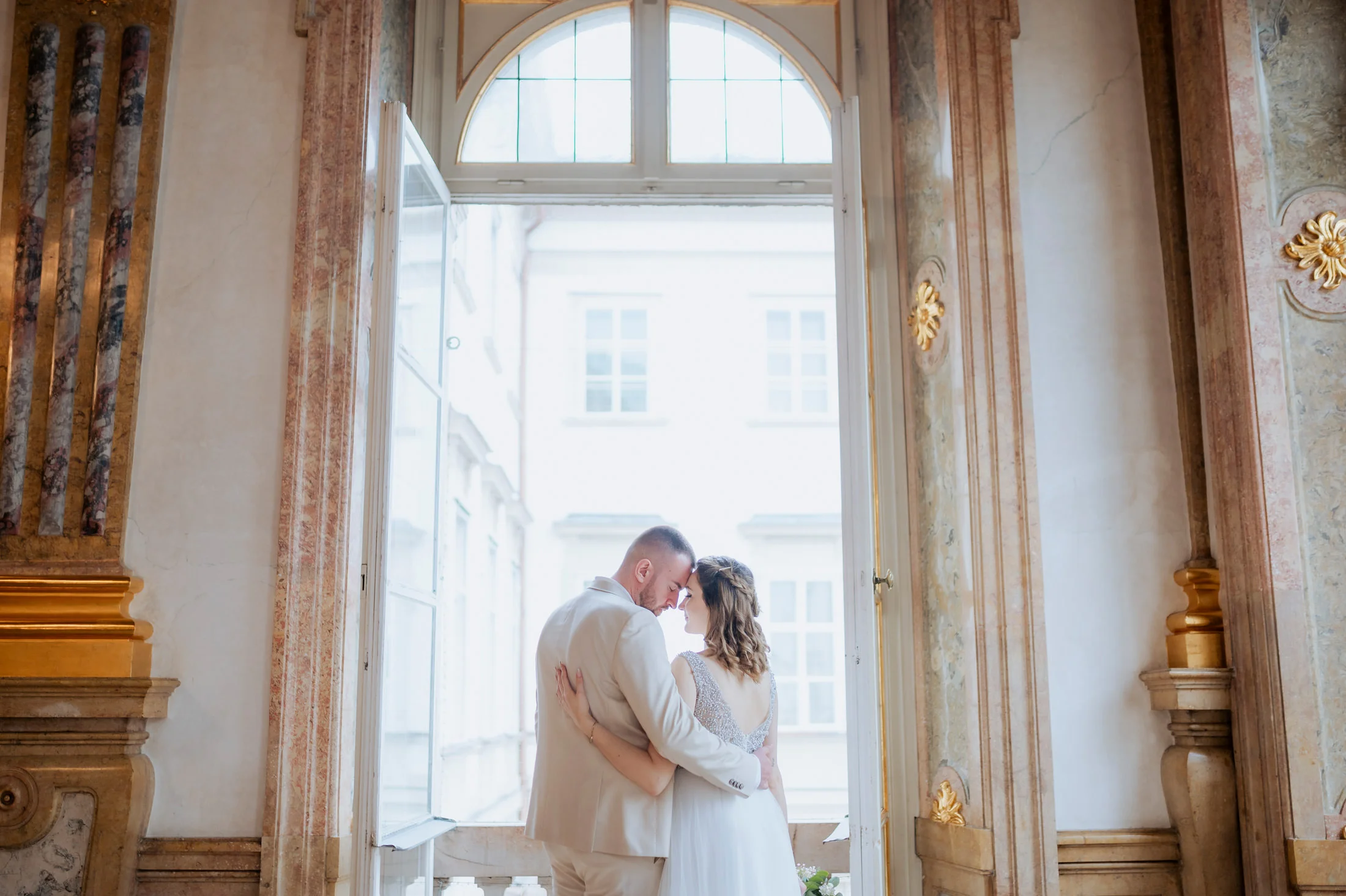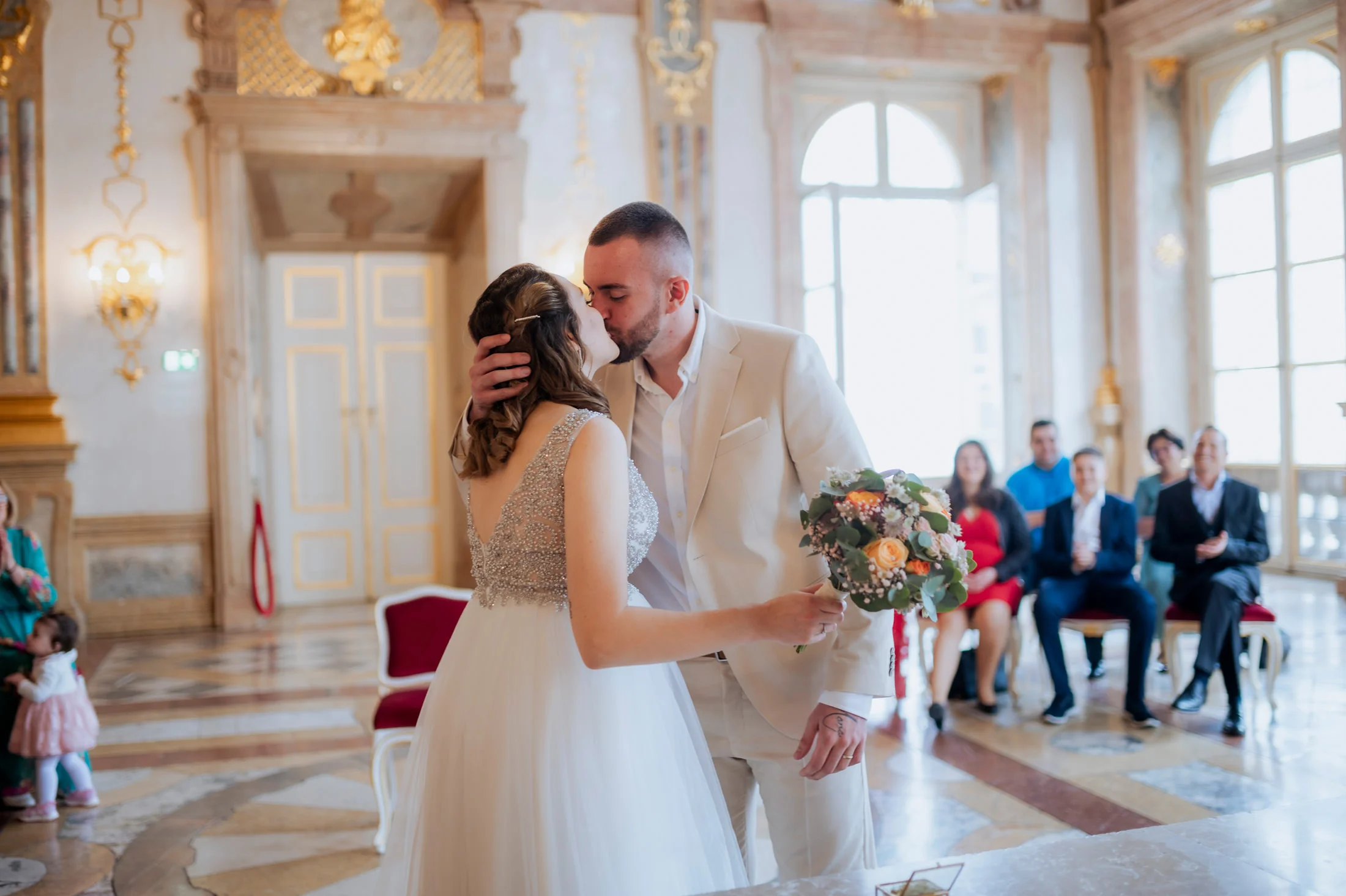 Die standesamtliche Trauung von Anita und Perica fand im berühmten Marmorsaal des Schlosses Mirabell statt. Dieser prunkvolle Saal, der für seine atemberaubenden Details und seinen historischen Charme bekannt ist, zählt zu den schönsten Standesamt-Locations in ganz Europa. Trotz des regnerischen Wetters schuf die prasselnde Kulisse draußen eine ganz eigene Stimmung – romantisch, intim und voller Emotionen.