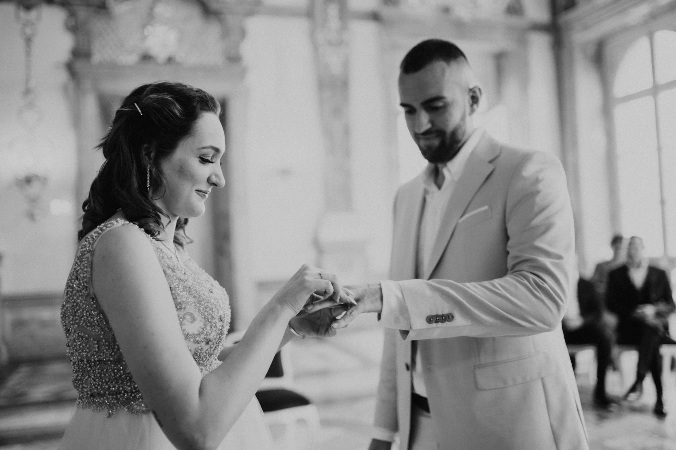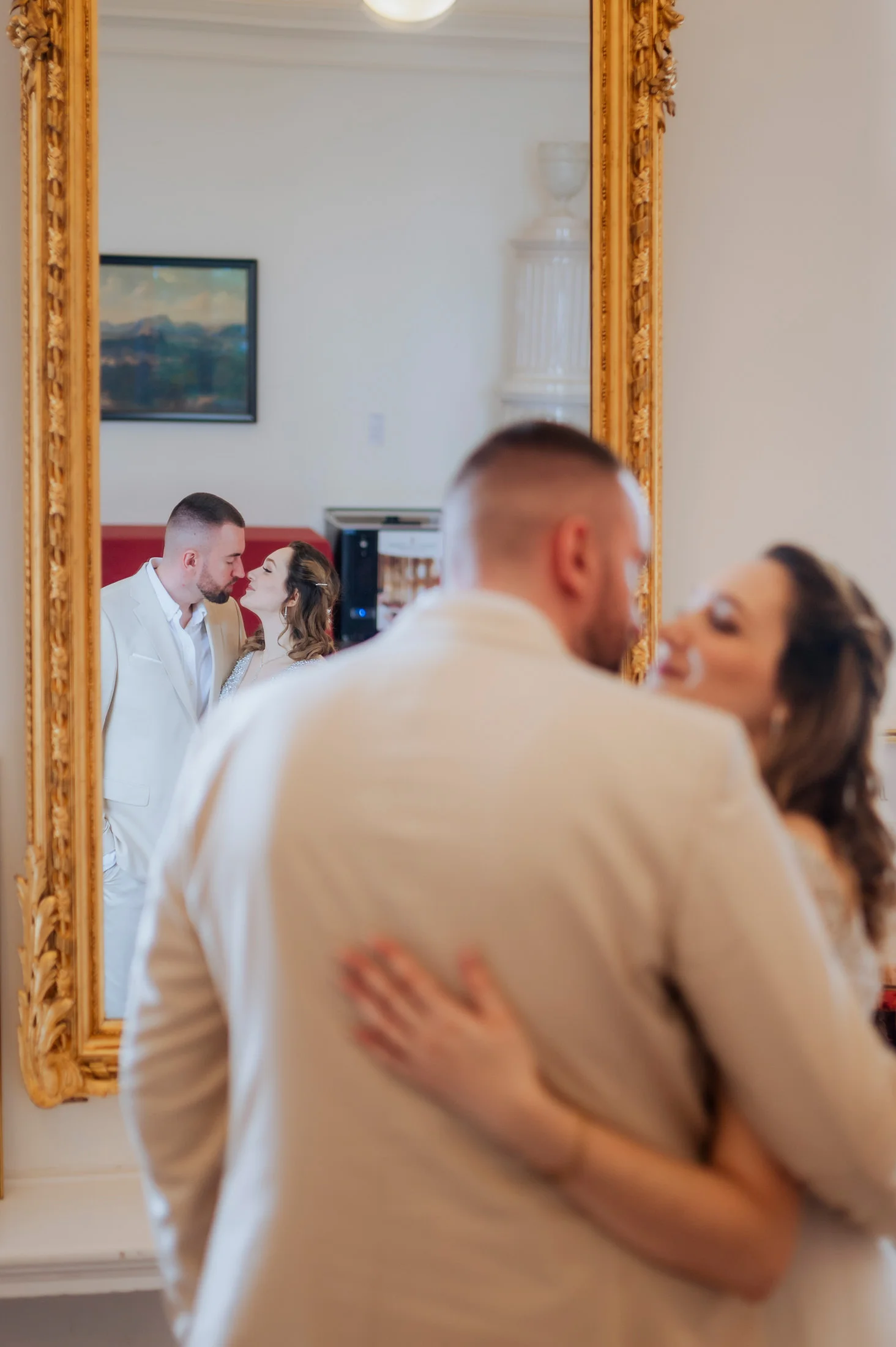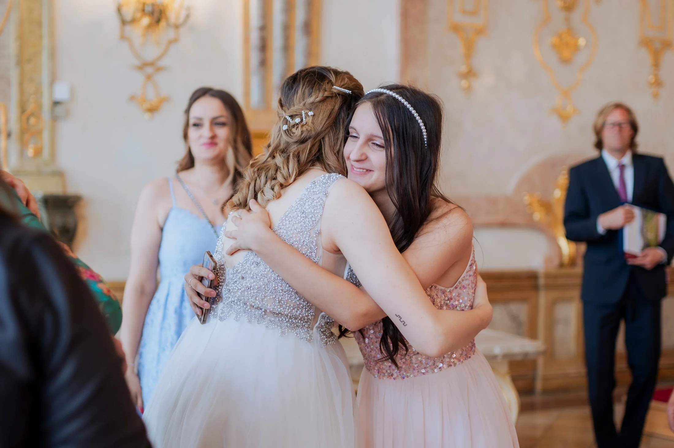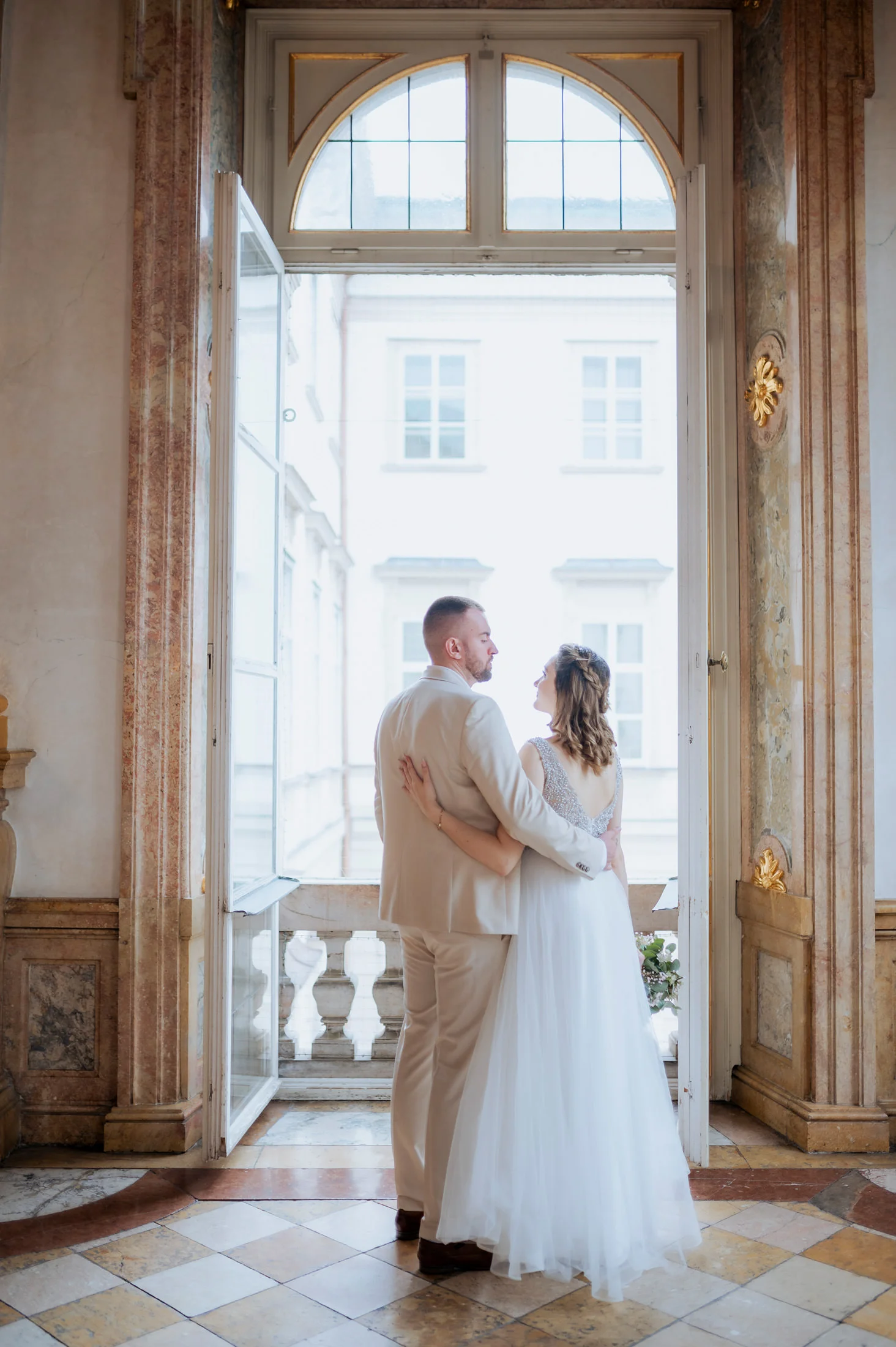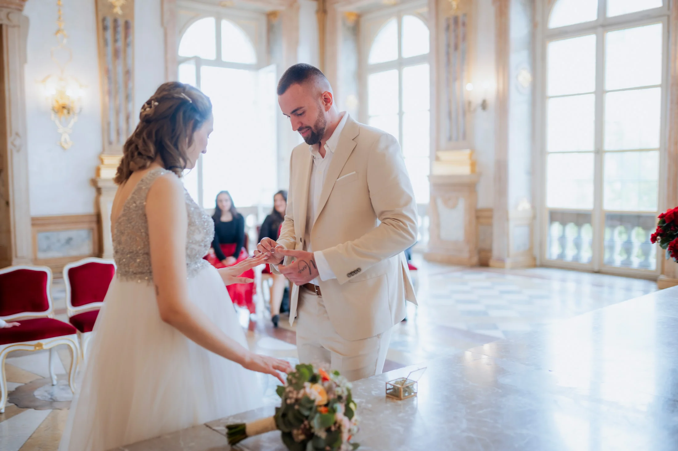 Die standesamtliche Trauung von Anita und Perica fand im berühmten Marmorsaal des Schlosses Mirabell statt. Dieser prunkvolle Saal, der für seine atemberaubenden Details und seinen historischen Charme bekannt ist, zählt zu den schönsten Standesamt-Locations in ganz Europa. Trotz des regnerischen Wetters schuf die prasselnde Kulisse draußen eine ganz eigene Stimmung – romantisch, intim und voller Emotionen.