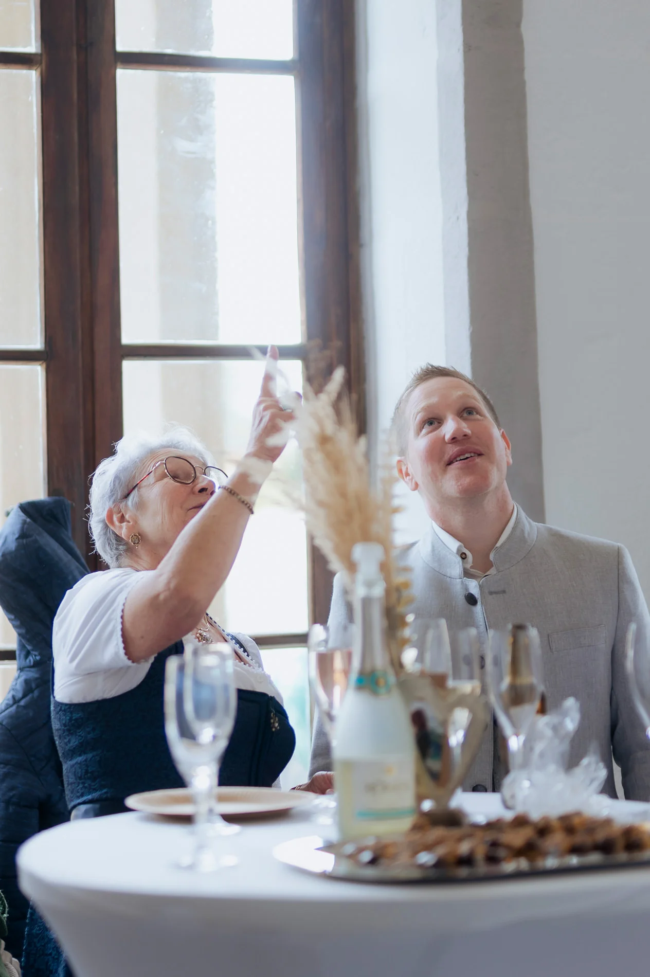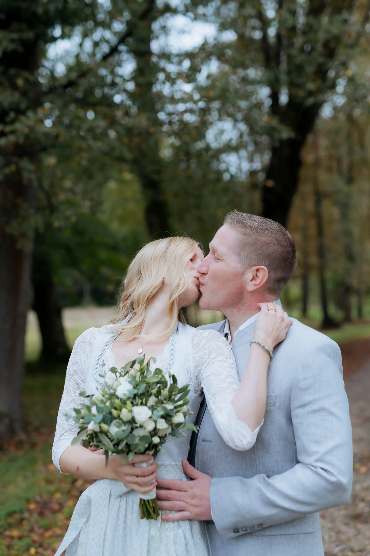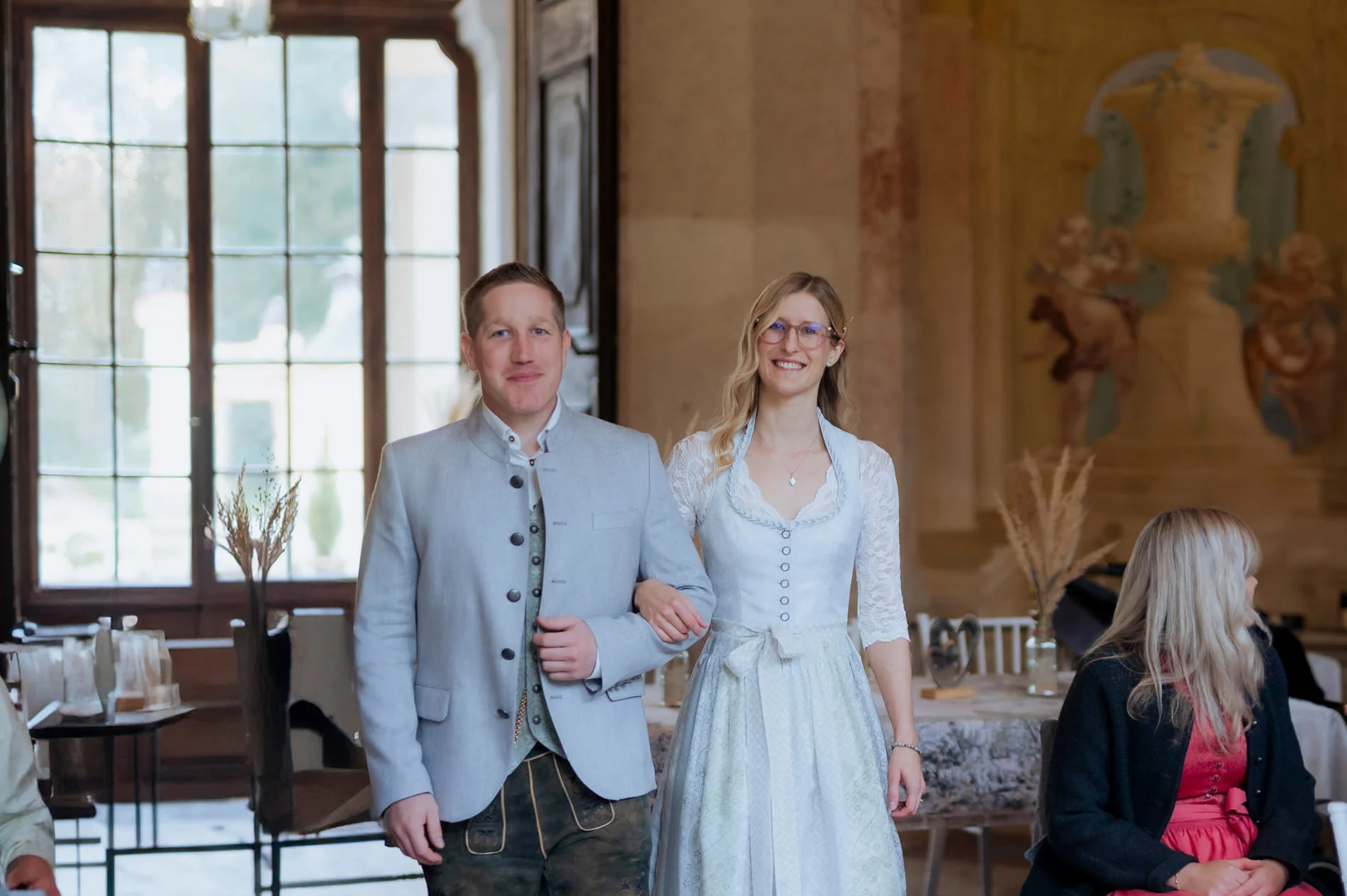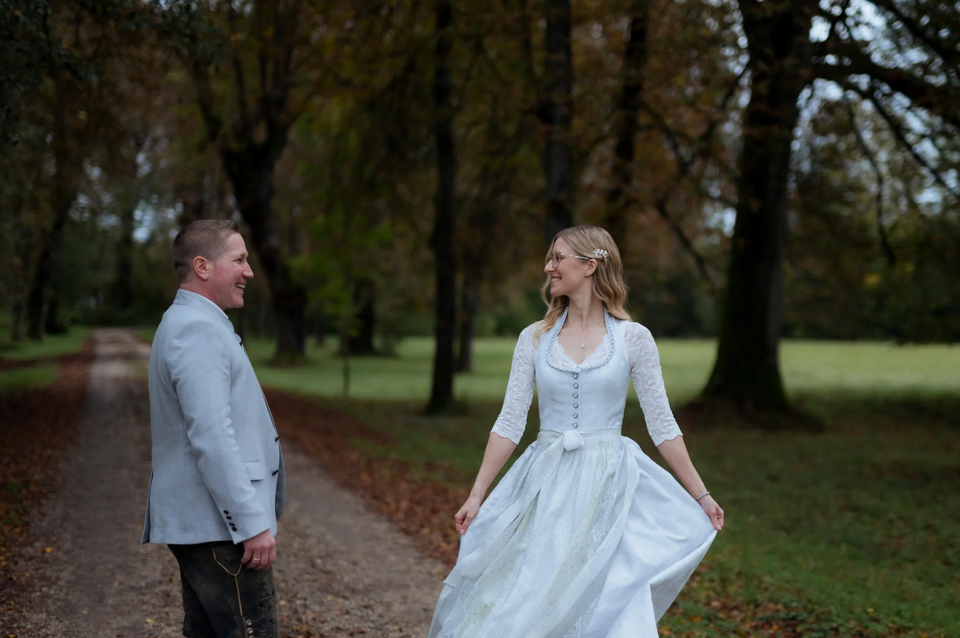 Die Zeremonie begann am späten Vormittag und fand bei mildem Oktoberwetter im Außenbereich des Schlosses statt. Alexandra und Alexander wurden von Freunden und Familie umgeben, während sie ihre Gelübde unter den bunten Herbstbäumen ablegten. Die Farben der Blätter und die sanfte Oktobersonne verliehen dem Moment eine besondere Atmosphäre. Die Fotomotive auf Schloss Neuwartenburg waren vielseitig und spiegelten perfekt die herbstliche Stimmung wider.