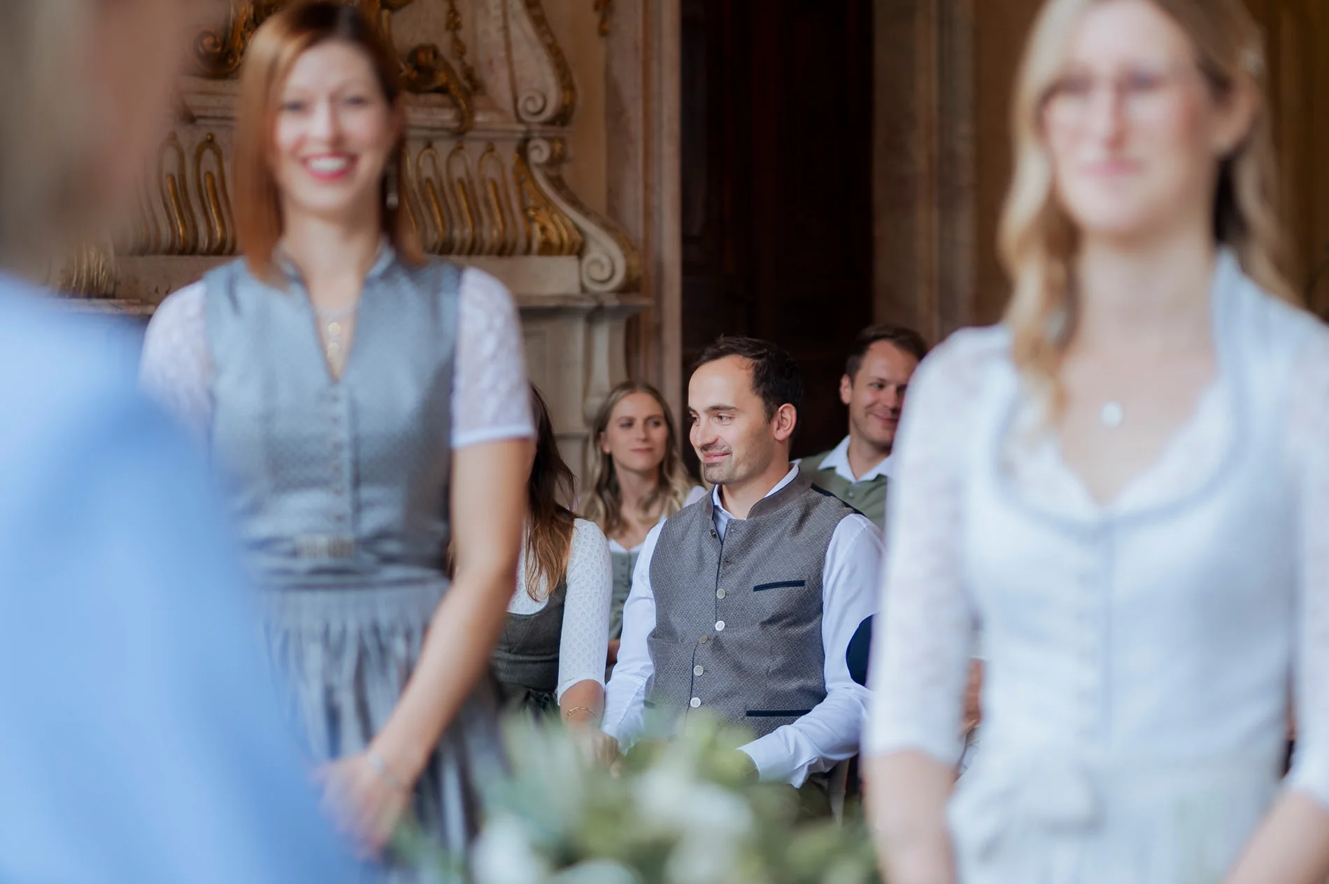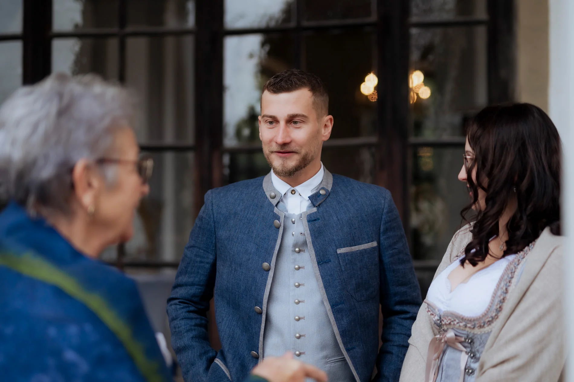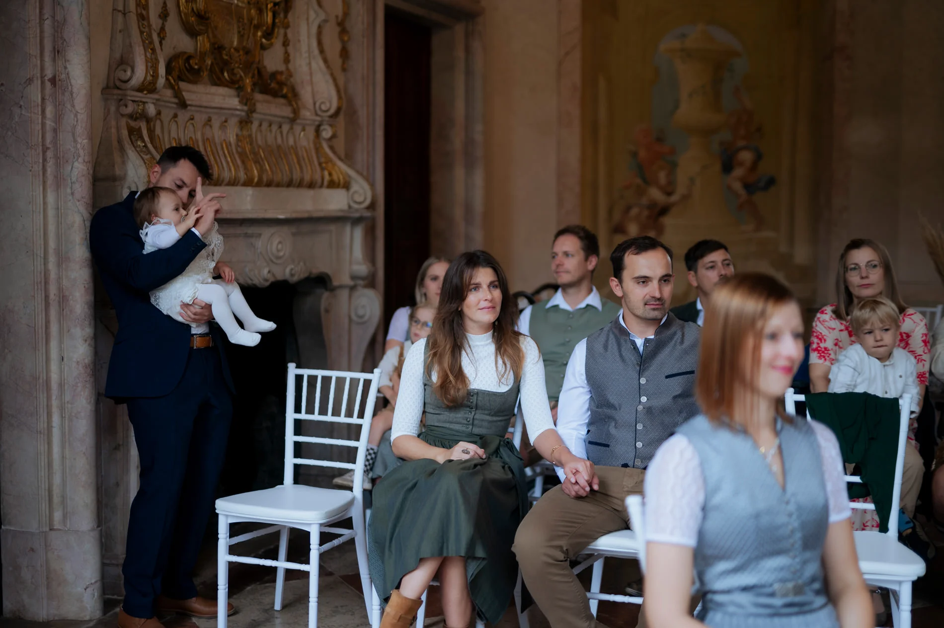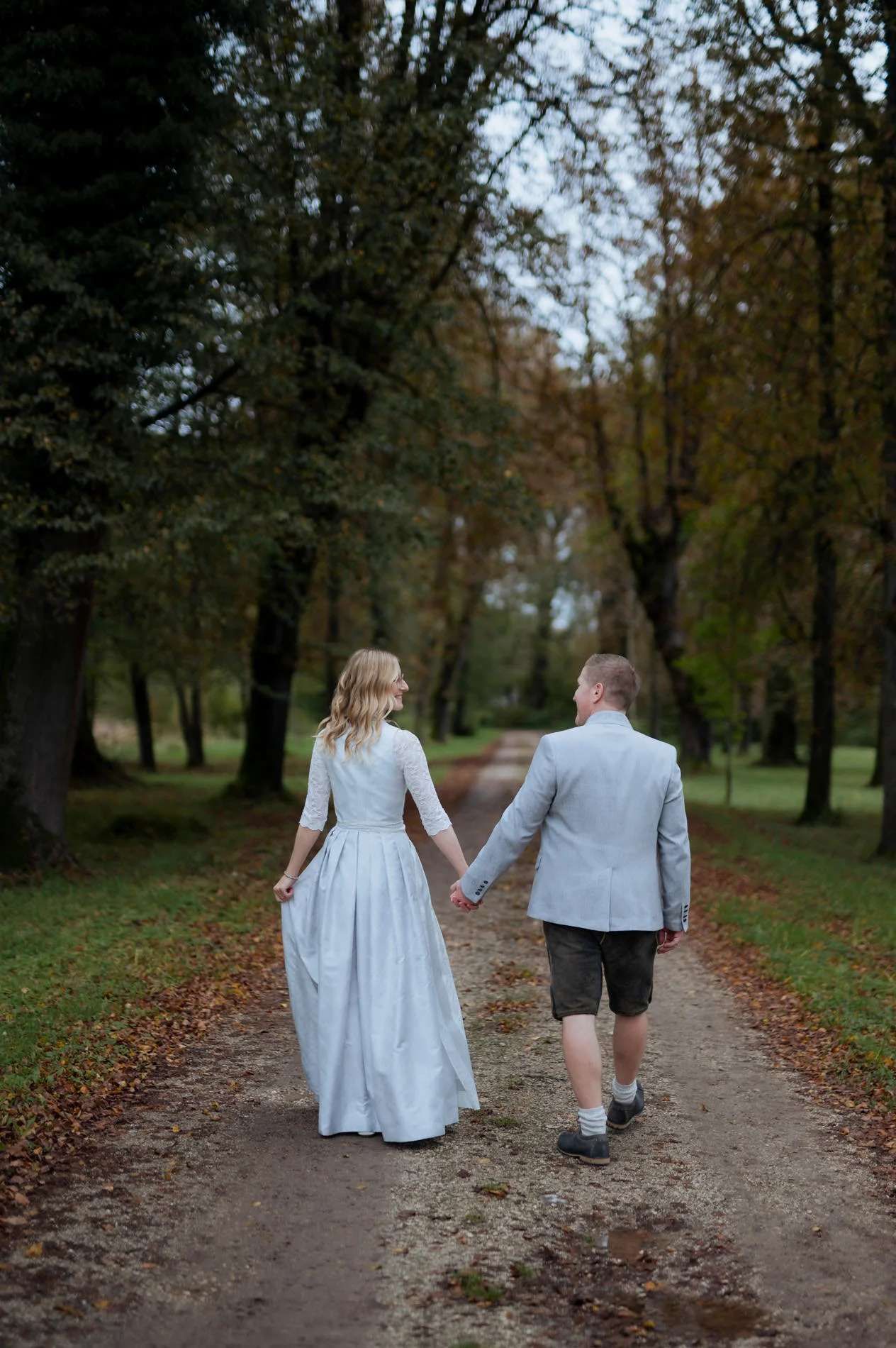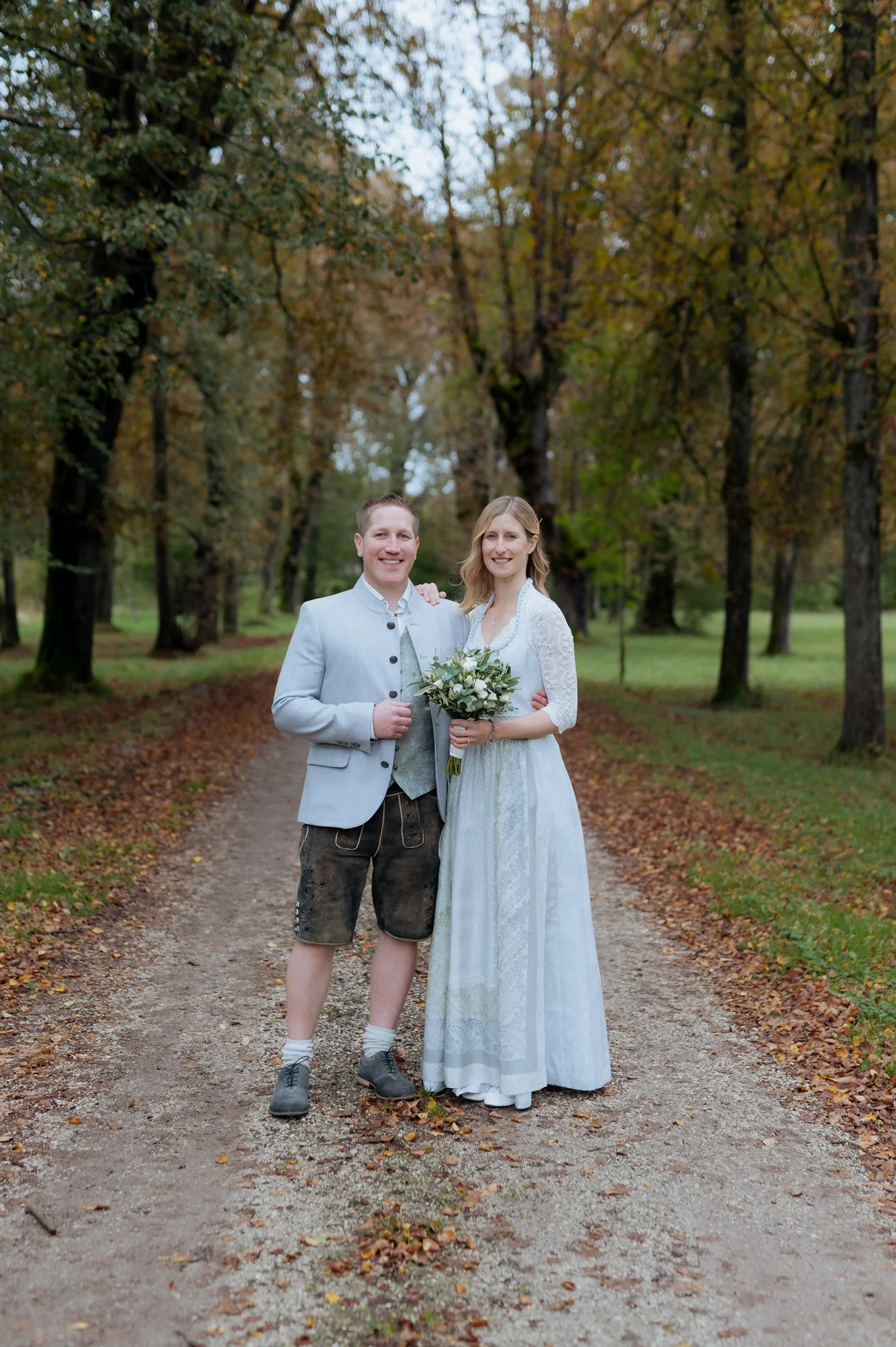 Die Zeremonie begann am späten Vormittag und fand bei mildem Oktoberwetter im Außenbereich des Schlosses statt. Alexandra und Alexander wurden von Freunden und Familie umgeben, während sie ihre Gelübde unter den bunten Herbstbäumen ablegten. Die Farben der Blätter und die sanfte Oktobersonne verliehen dem Moment eine besondere Atmosphäre. Die Fotomotive auf Schloss Neuwartenburg waren vielseitig und spiegelten perfekt die herbstliche Stimmung wider.