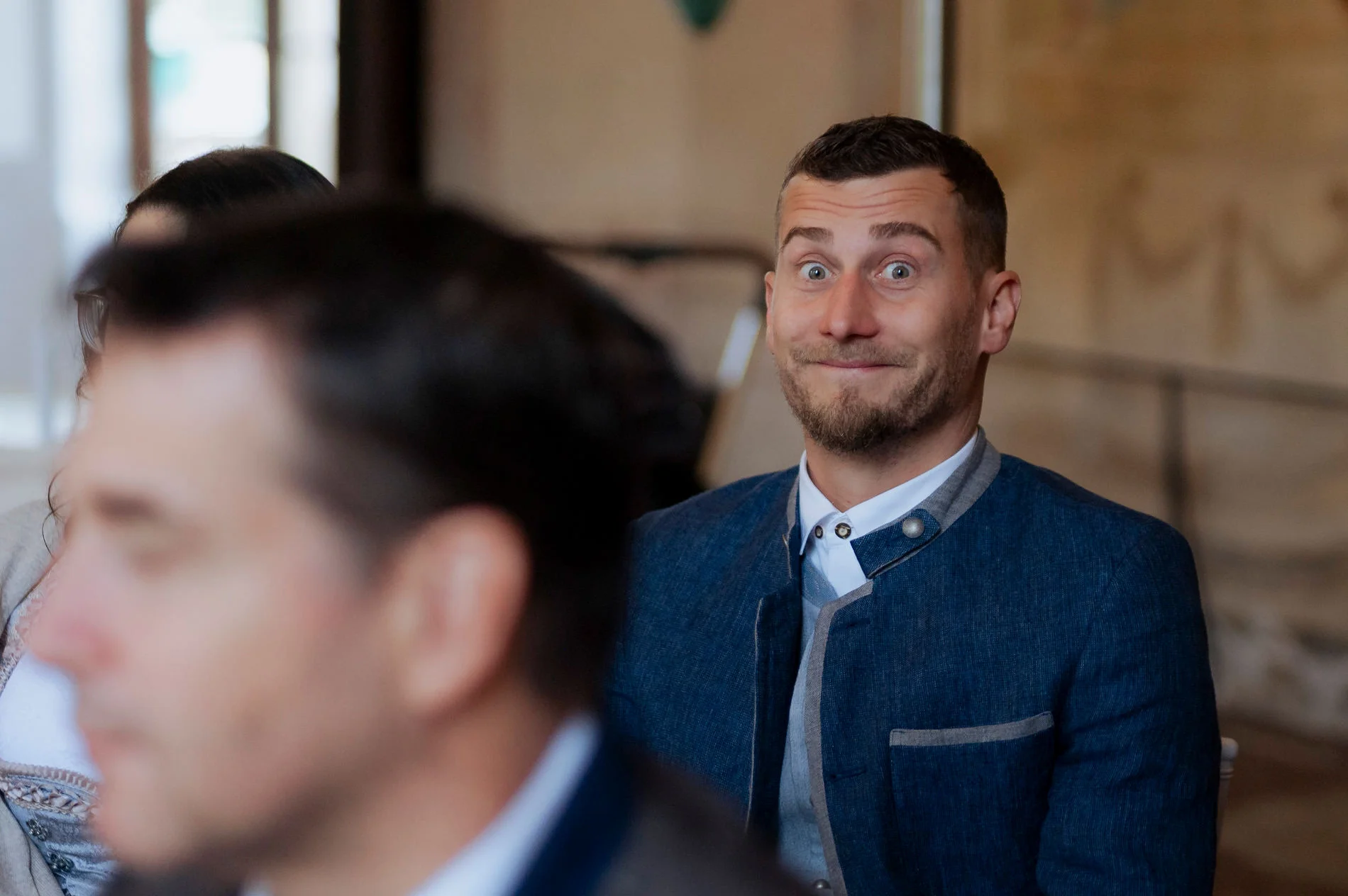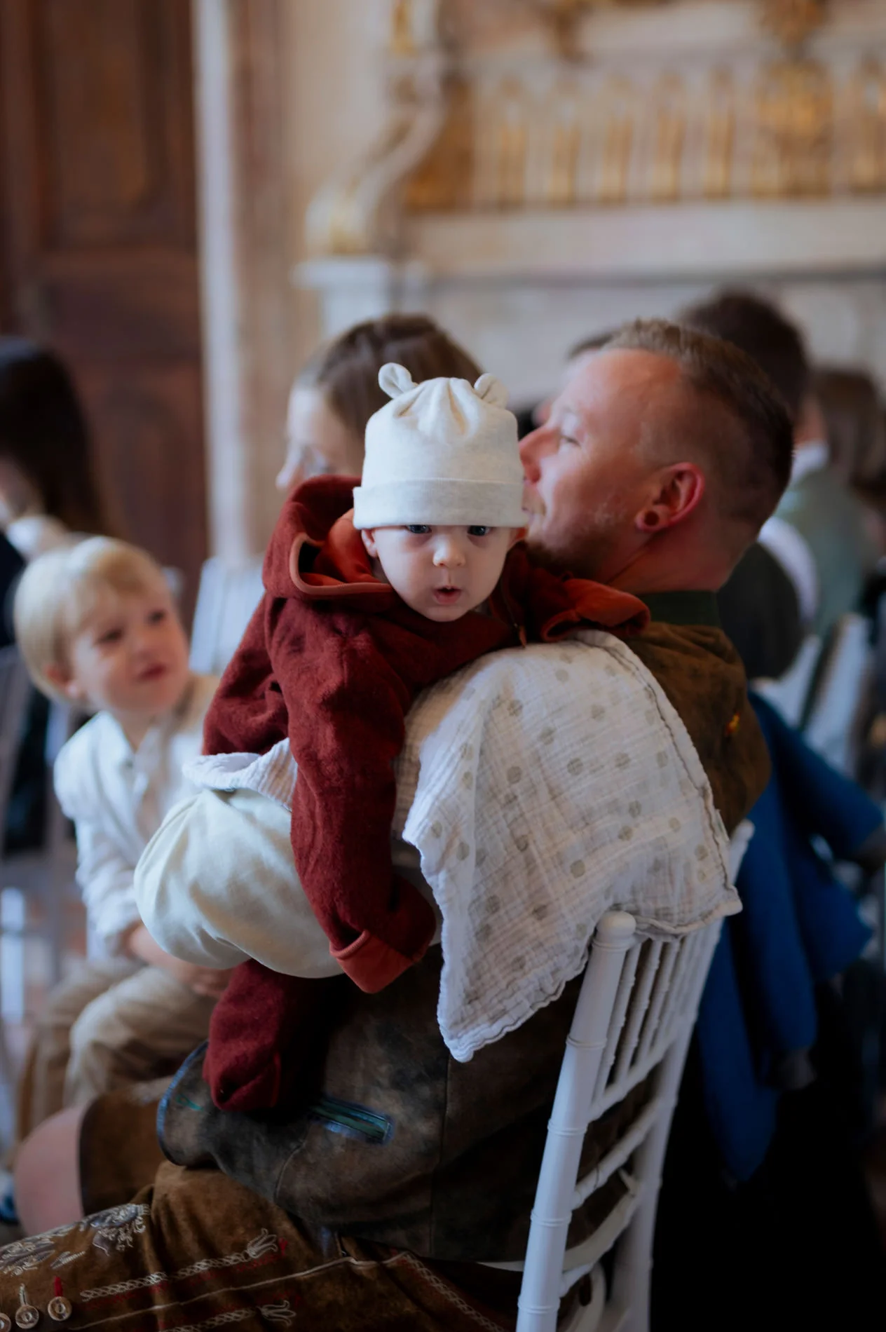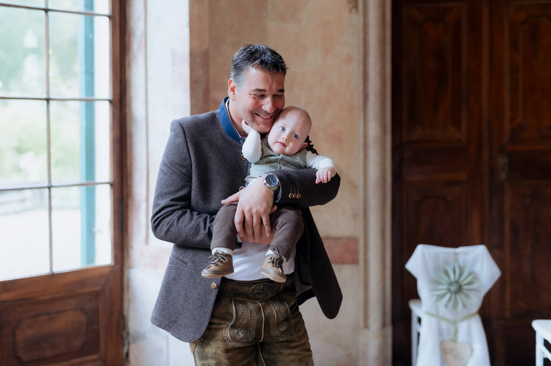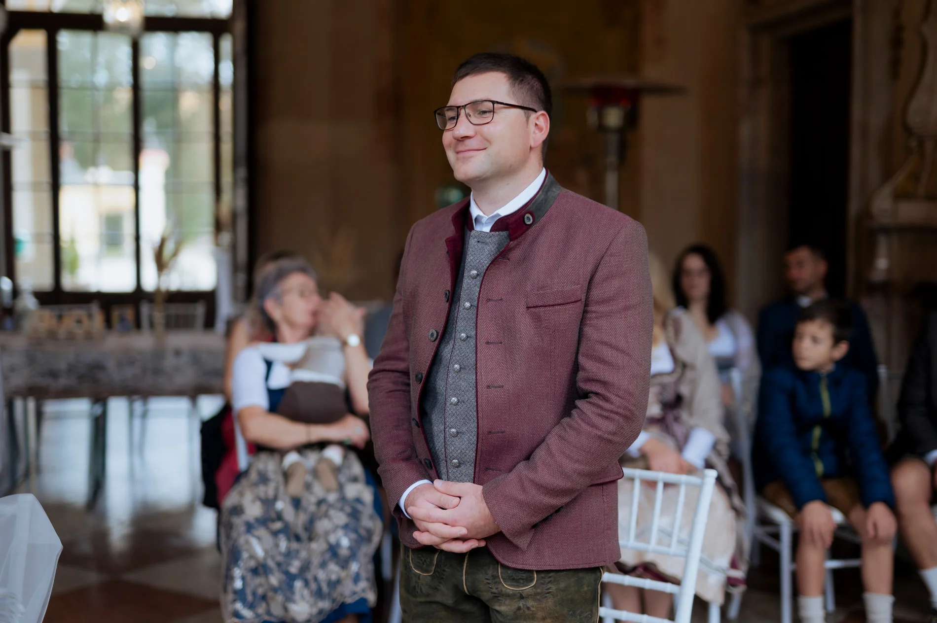 Die Zeremonie begann am späten Vormittag und fand bei mildem Oktoberwetter im Außenbereich des Schlosses statt. Alexandra und Alexander wurden von Freunden und Familie umgeben, während sie ihre Gelübde unter den bunten Herbstbäumen ablegten. Die Farben der Blätter und die sanfte Oktobersonne verliehen dem Moment eine besondere Atmosphäre. Die Fotomotive auf Schloss Neuwartenburg waren vielseitig und spiegelten perfekt die herbstliche Stimmung wider.